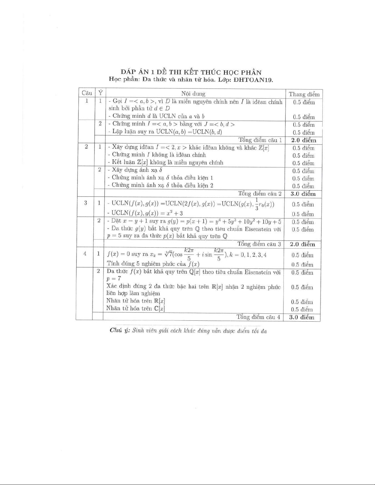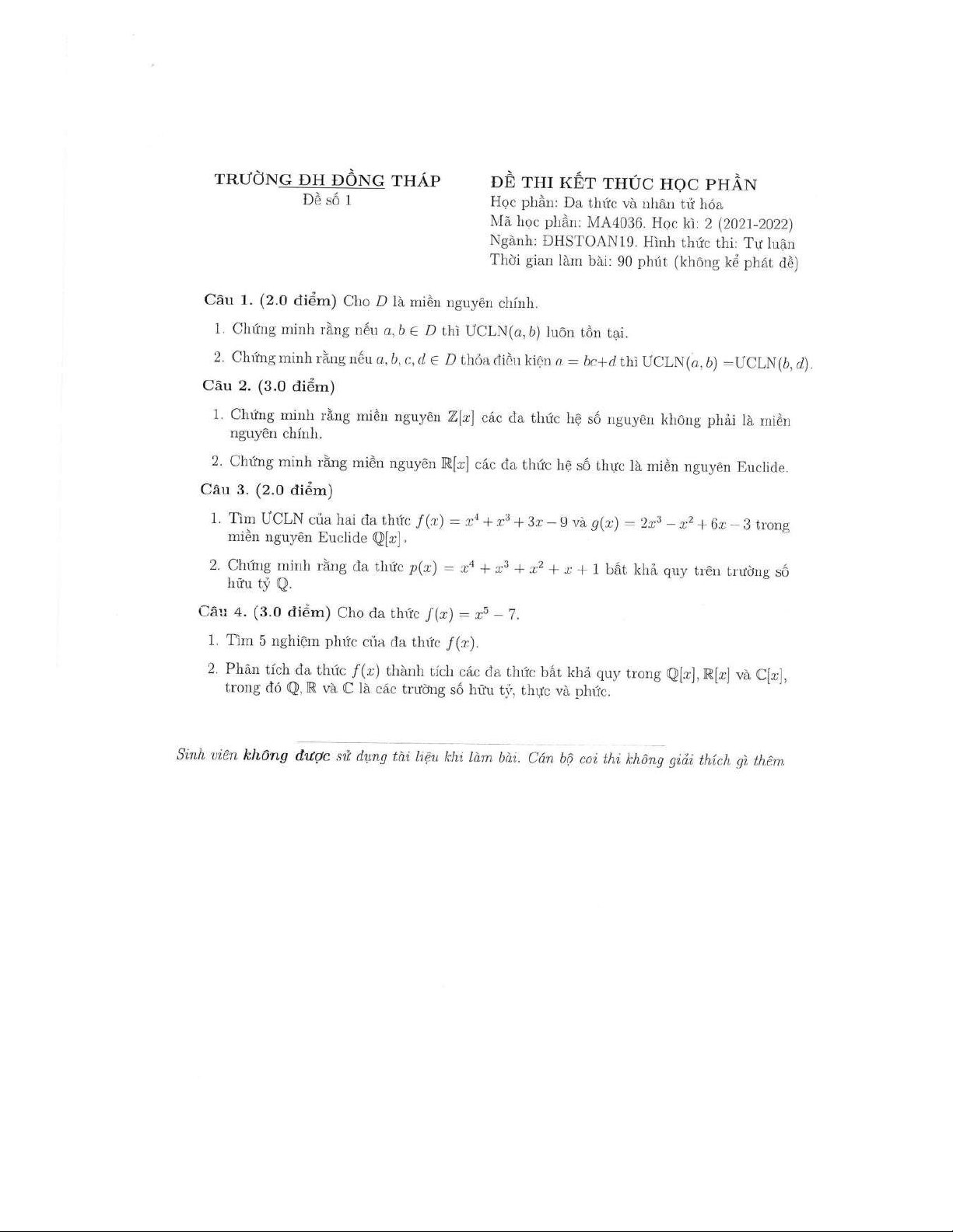 Đề thi kết thúc học phần học kì 2 môn Đa thức và nhân tử hóa năm 2021-2022 có đáp án - Trường ĐH Đồng Tháp