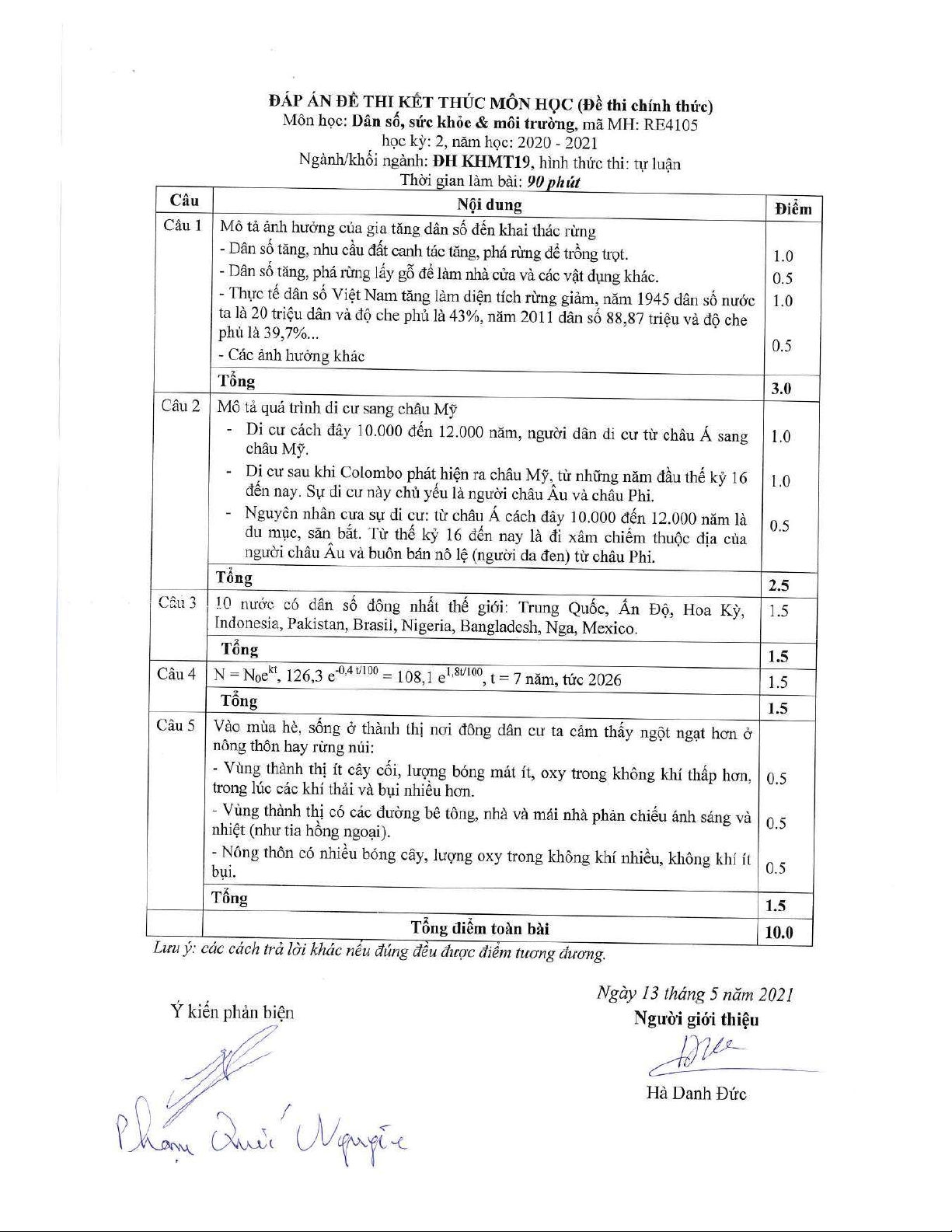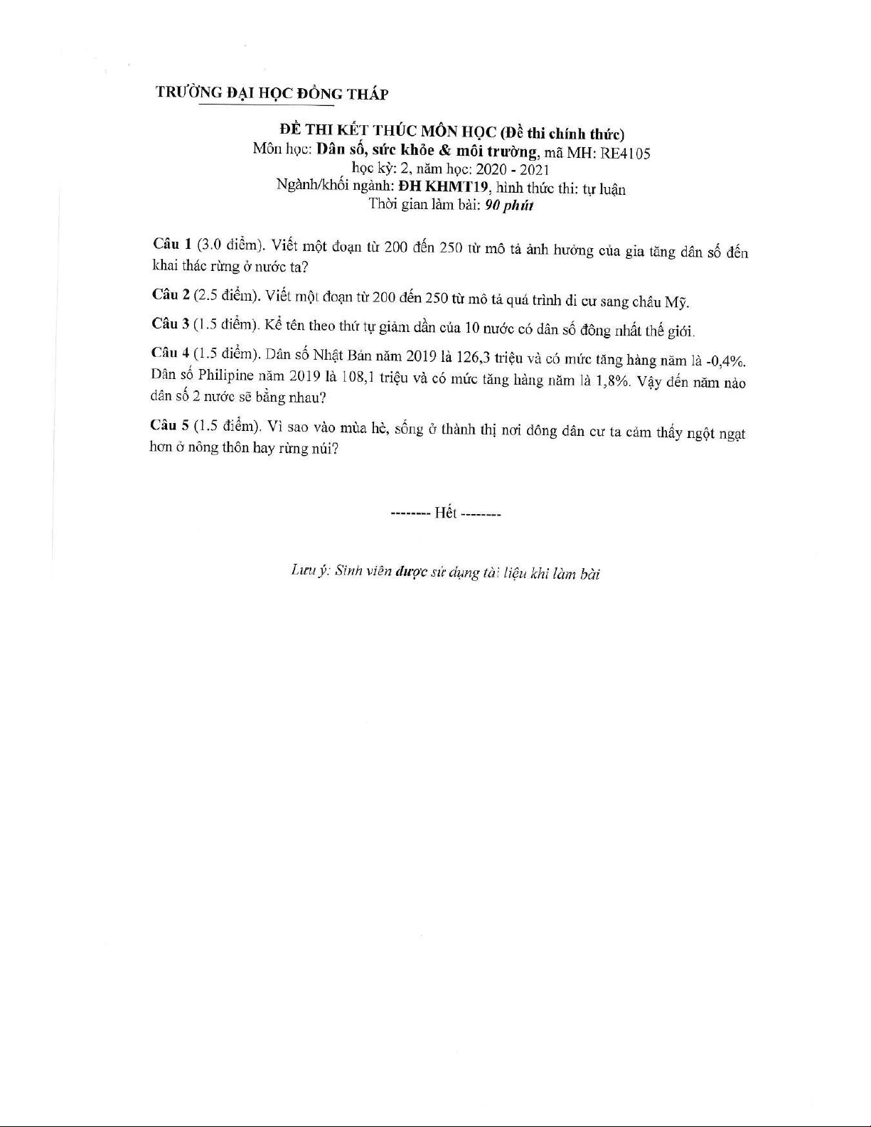 Đề thi kết thúc học phần học kì 2 môn Dân số, sức khỏe và môi trường năm 2020-2021 có đáp án - Trường ĐH Đồng Tháp