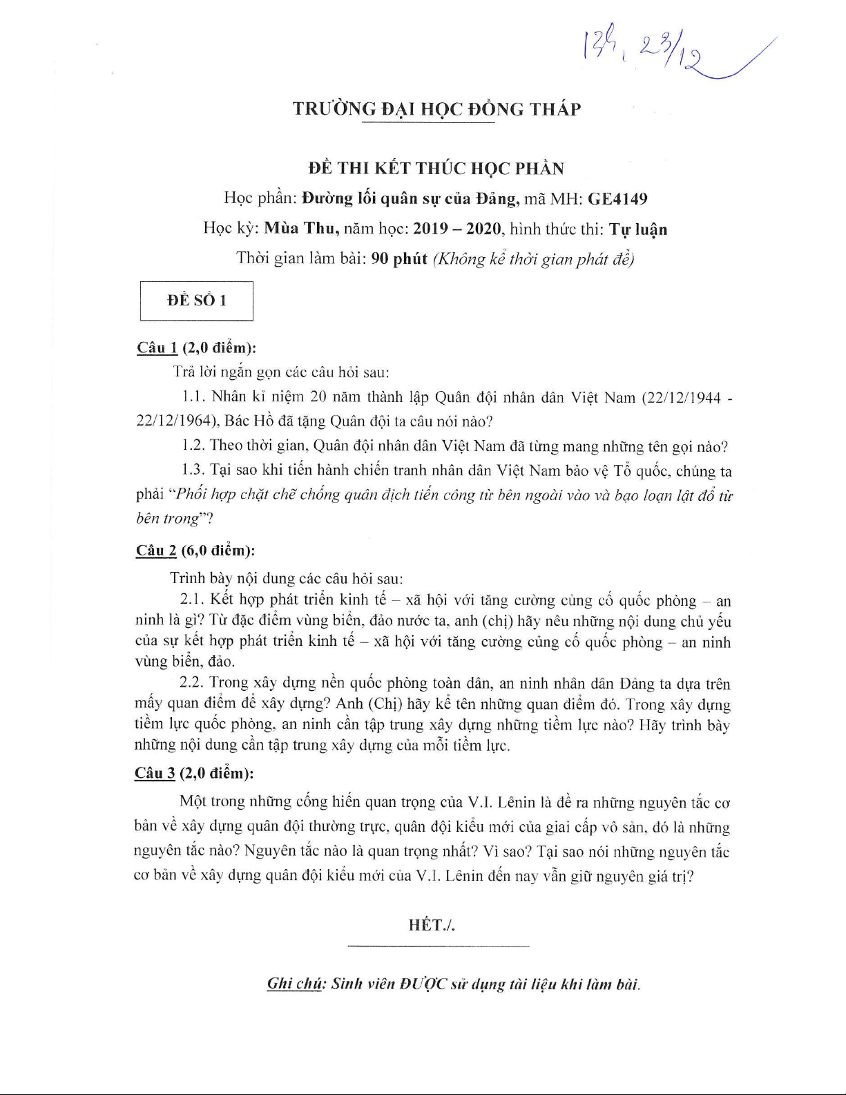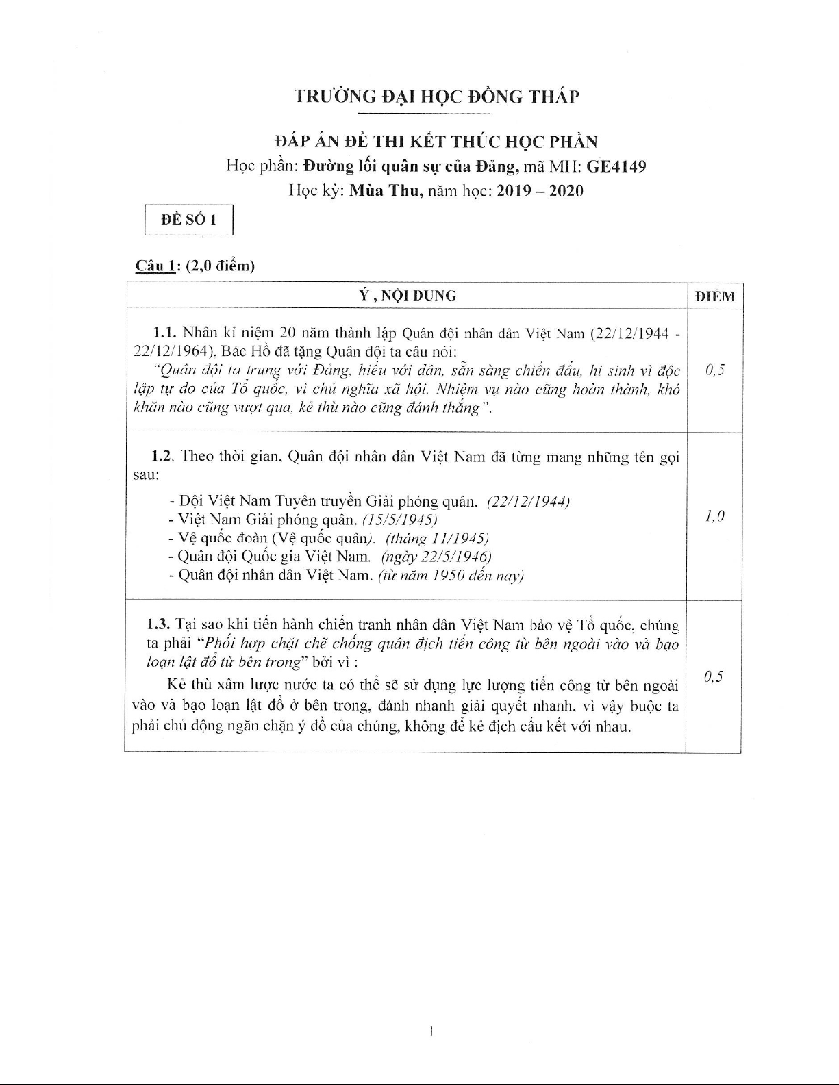 Đề thi kết thúc học phần học kì 1 môn Đường lối quân sự của Đảng năm 2019-2020 có đáp án - Trường ĐH Đồng Tháp