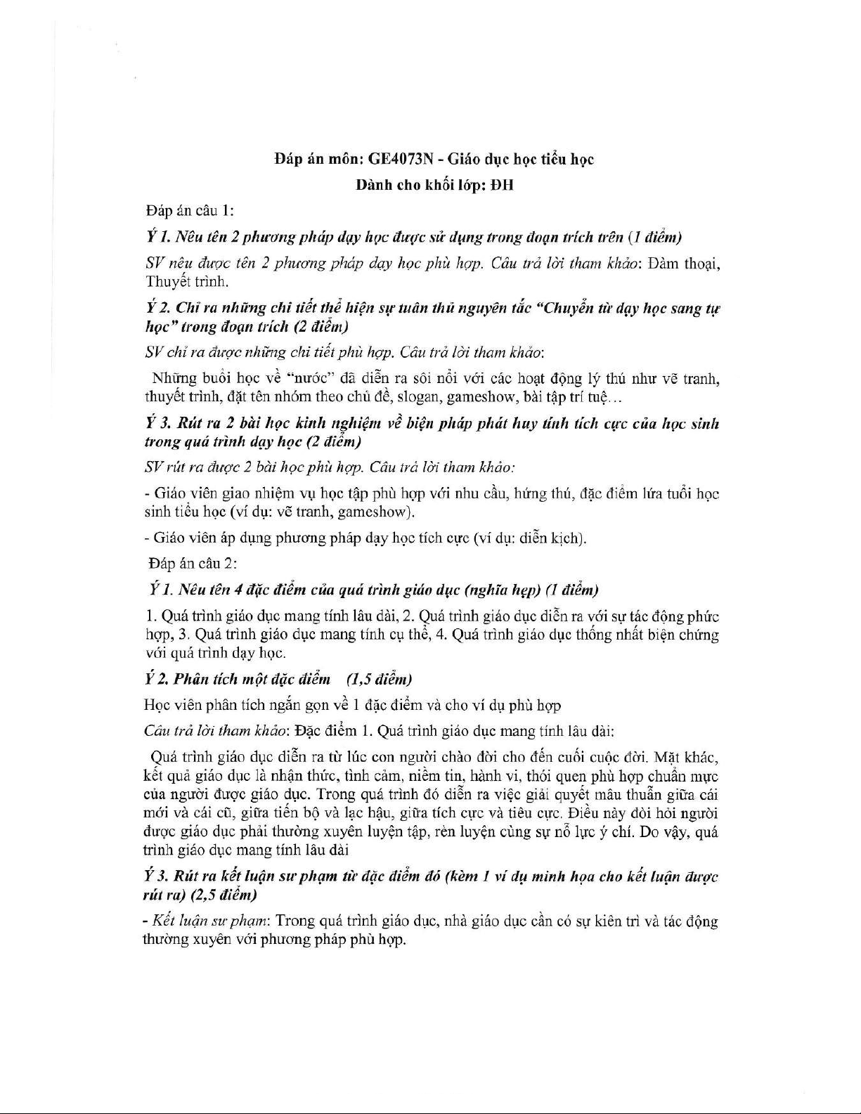 Đề thi kết thúc học phần học kì 2 môn Giáo dục học tiểu học năm 2020-2021 có đáp án - Trường ĐH Đồng Tháp