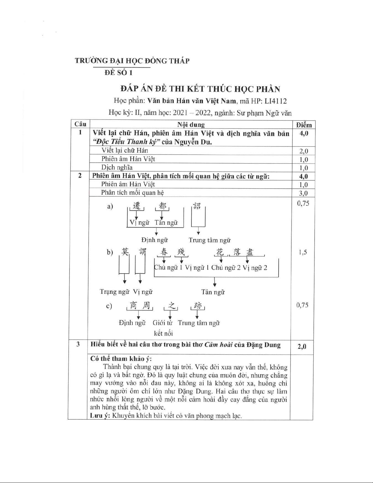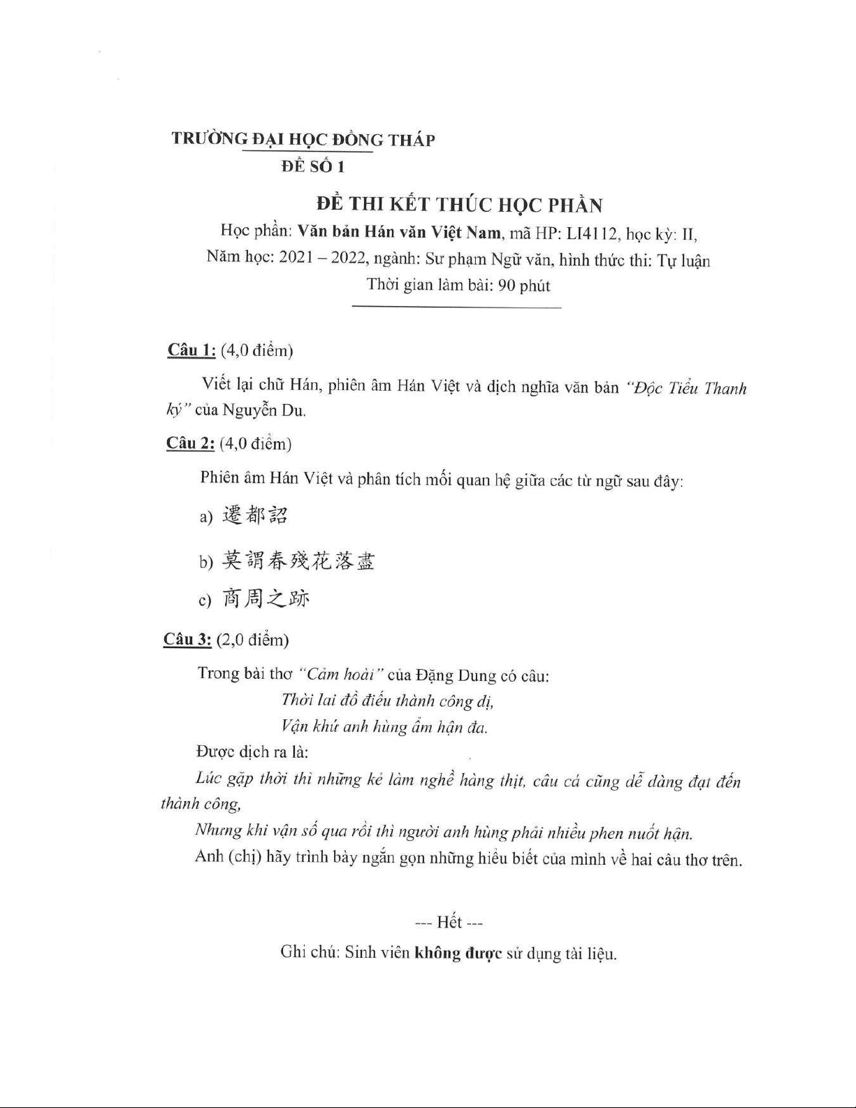 Đề thi kết thúc học phần học kì 2 môn Văn bản Hán văn Việt Nam năm 2021-2022 có đáp án - Trường ĐH Đồng Tháp