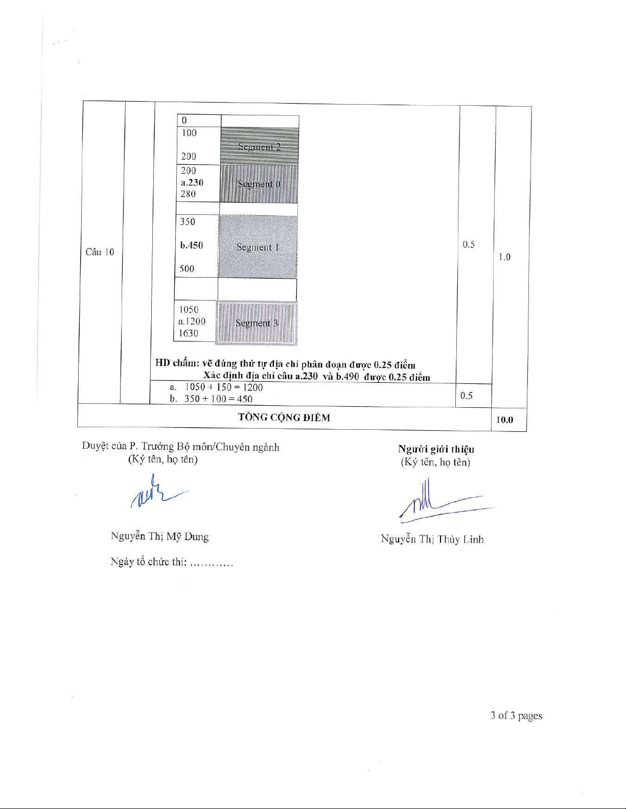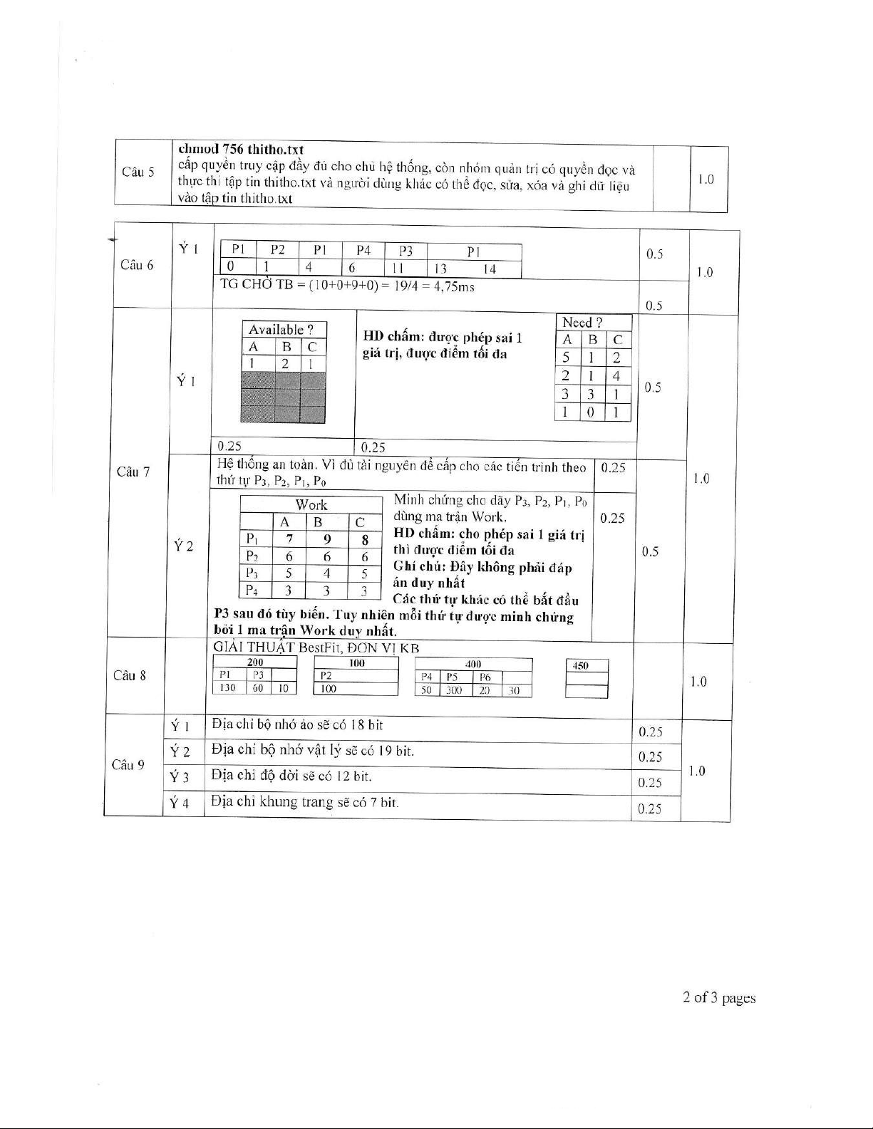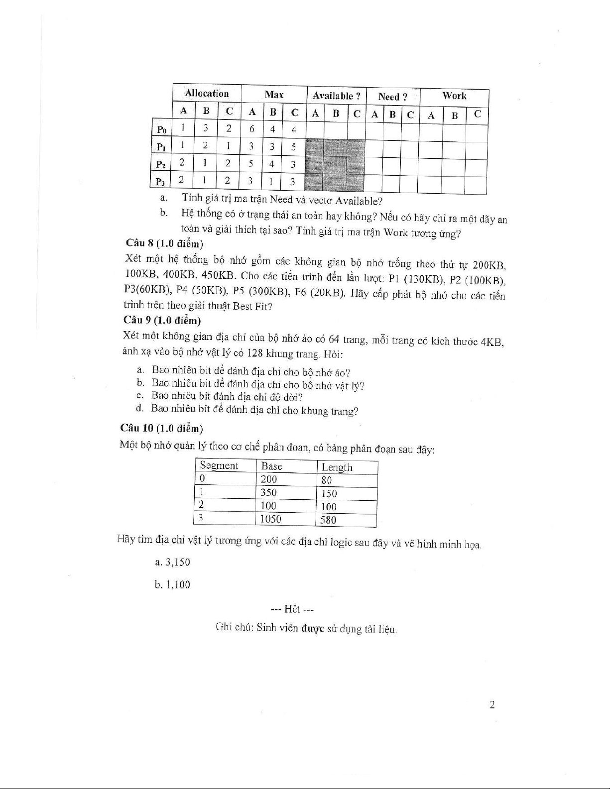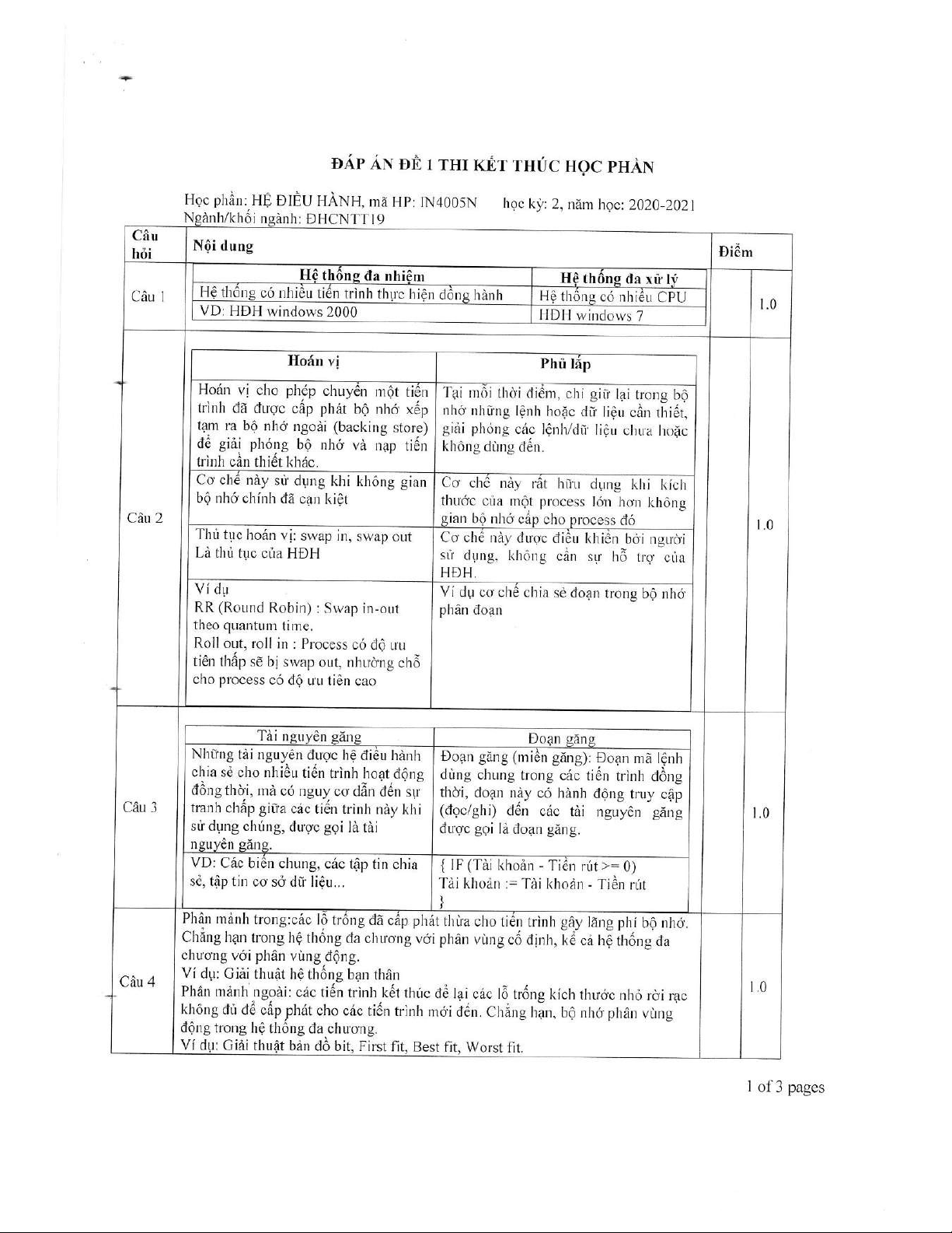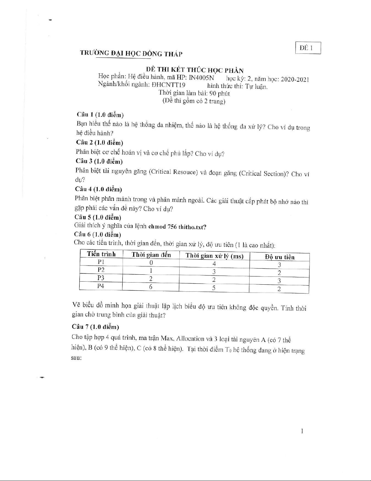 Tài liệu này là đề thi kết thúc học phần Hệ điều hành (mã HP: IN4005N) của Trường Đại học Đồng Tháp, được sử dụng trong học kỳ 2, năm học 2020-2021. Đề thi gồm 10 câu hỏi, tập trung đánh giá kiến thức toàn diện của sinh viên về các nguyên lý và kỹ thuật quản lý trong hệ điều hành. Các nội dung chính được đề cập bao gồm: phân biệt hệ thống đa nhiệm và đa xử lý; so sánh cơ chế hoán vị và phủ lắp trong quản lý bộ nhớ; định nghĩa và phân biệt tài nguyên găng và đoạn găng; phân tích các loại phân mảnh bộ nhớ (trong và ngoài) cùng các giải thuật cấp phát bộ nhớ liên quan (như Best Fit); giải thích ý nghĩa và cách sử dụng lệnh chmod trong quản lý quyền truy cập tệp tin. Ngoài ra, đề thi còn có các bài tập thực hành về lập lịch tiến trình (cụ thể là giải thuật lập lịch độ ưu tiên không độc quyền, tính thời gian chờ trung bình); áp dụng giải thuật Banker để kiểm tra trạng thái an toàn của hệ thống và tránh tắc nghẽn; các bài toán chi tiết về cấp phát bộ nhớ động (ví dụ: Best Fit); tính toán địa chỉ trong bộ nhớ ảo và bộ nhớ vật lý (bao gồm số bit cần thiết cho địa chỉ, độ dời và khung trang); và xác định địa chỉ vật lý từ địa chỉ logic trong hệ thống quản lý bộ nhớ theo cơ chế phân đoạn. Tài liệu cũng cung cấp đáp án chi tiết cho từng câu hỏi, giúp sinh viên và giảng viên tham khảo, ôn tập và đánh giá hiệu quả học tập.
