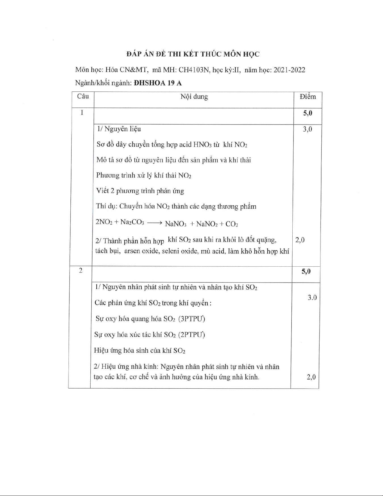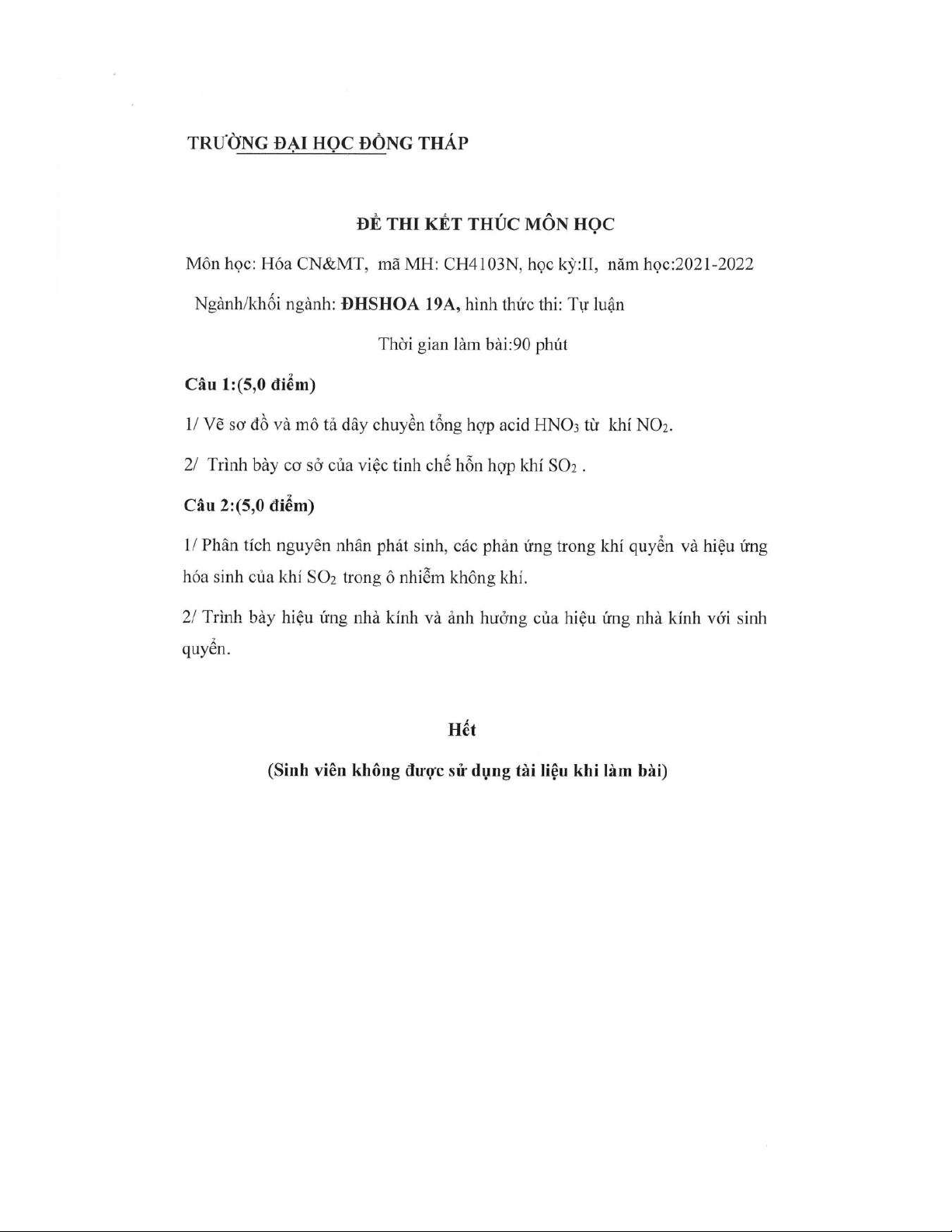 Đề thi kết thúc học phần học kì 2 môn Hóa công nghiệp và môi trường năm 2021-2022 có đáp án - Trường ĐH Đồng Tháp