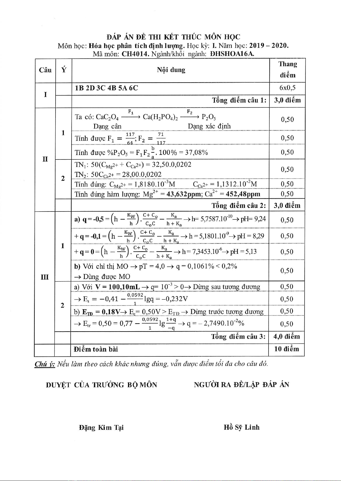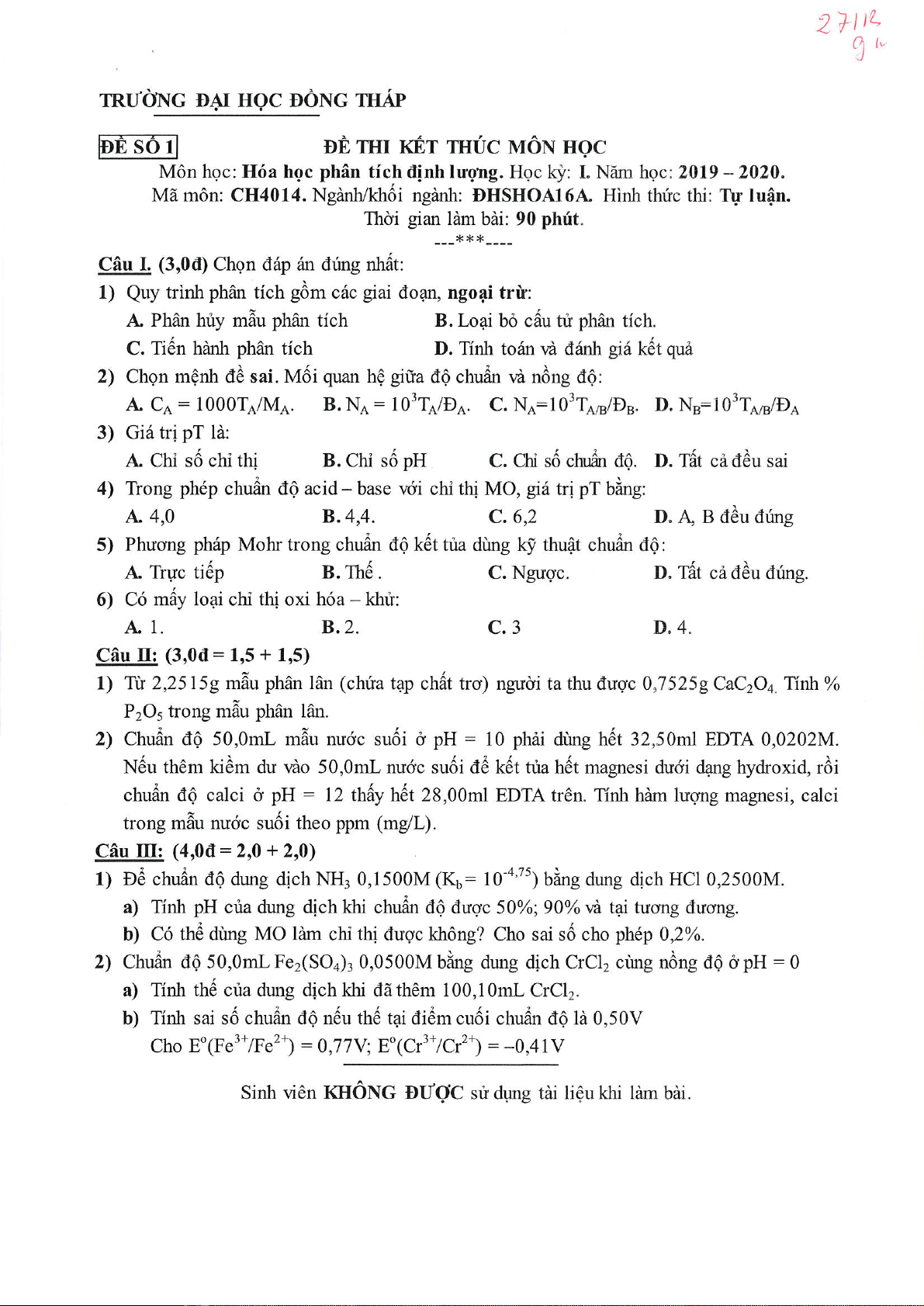 Đề thi kết thúc học phần học kì 1 môn Hóa học phân tích định lượng năm 2019-2020 có đáp án - Trường ĐH Đồng Tháp