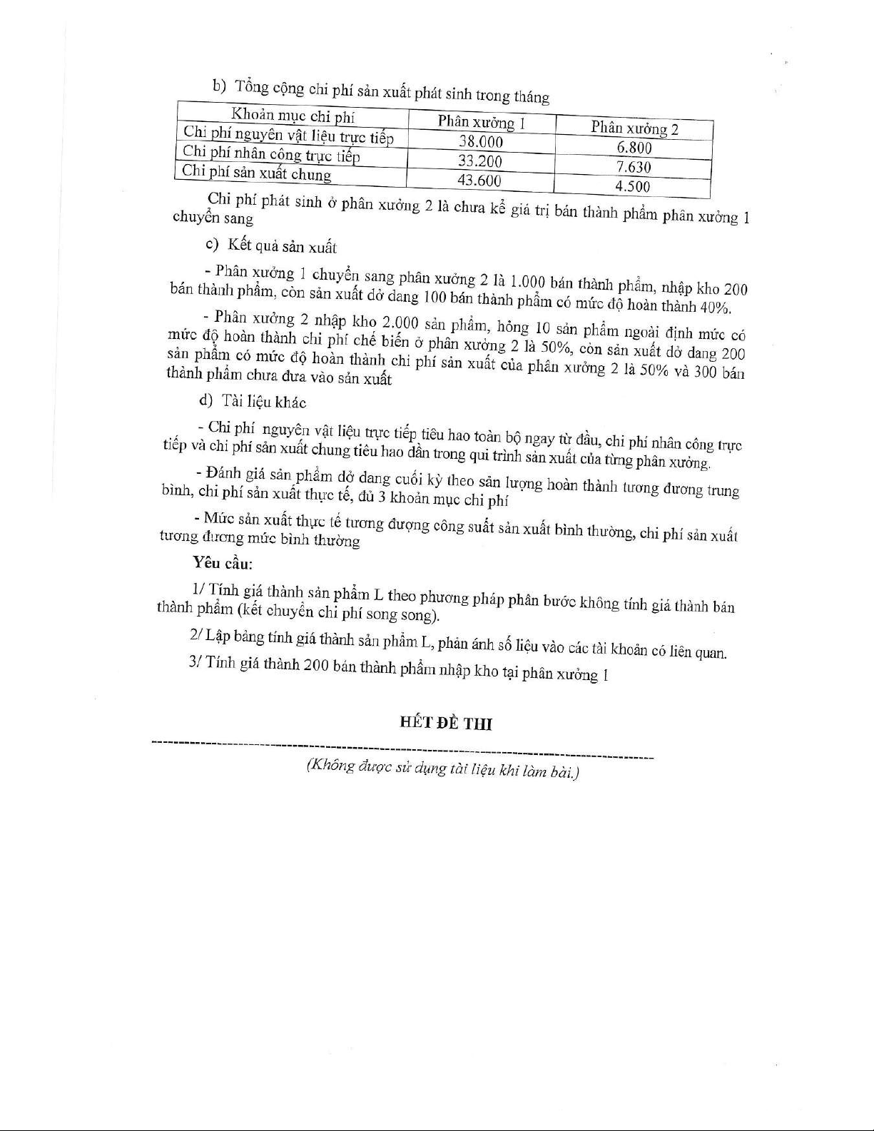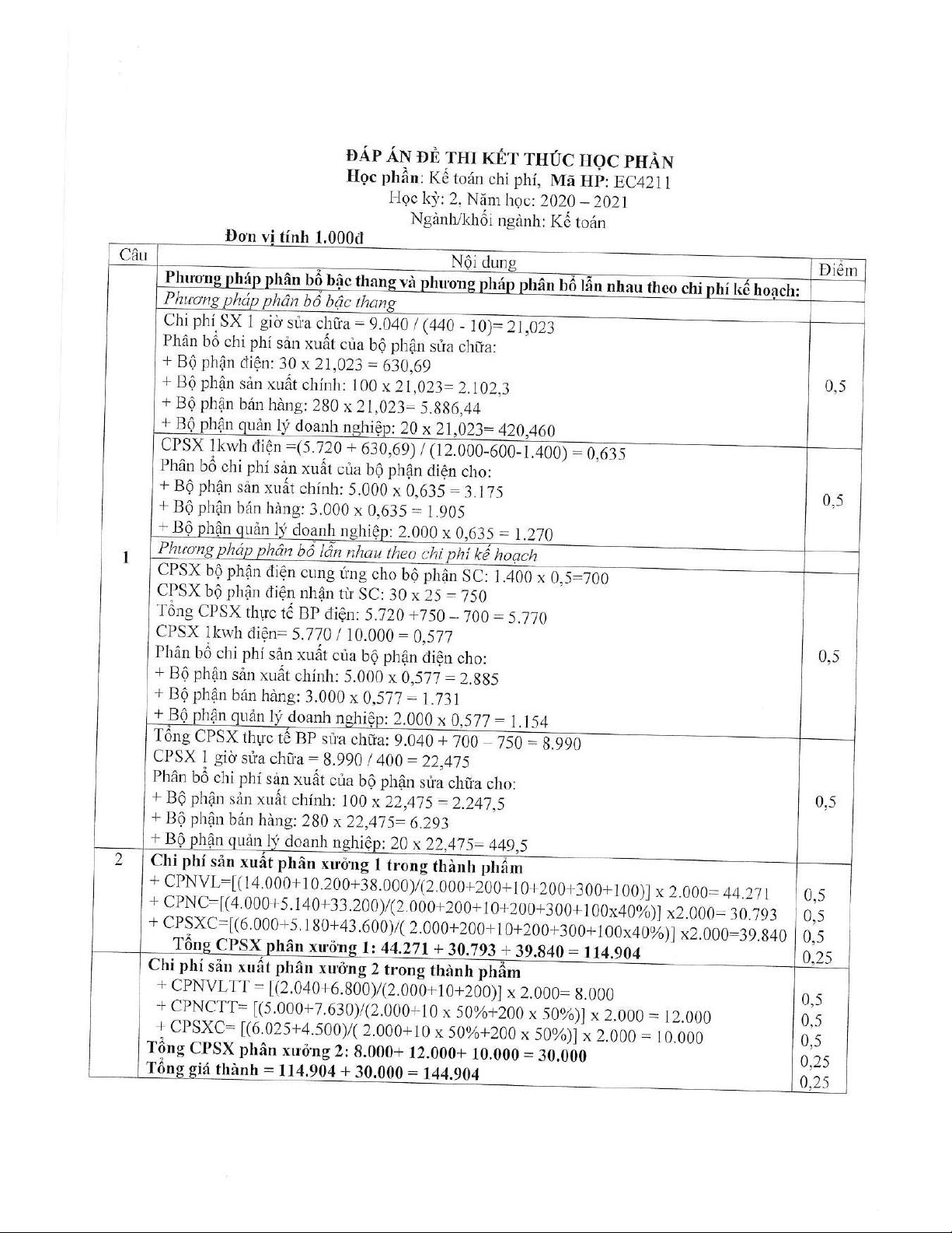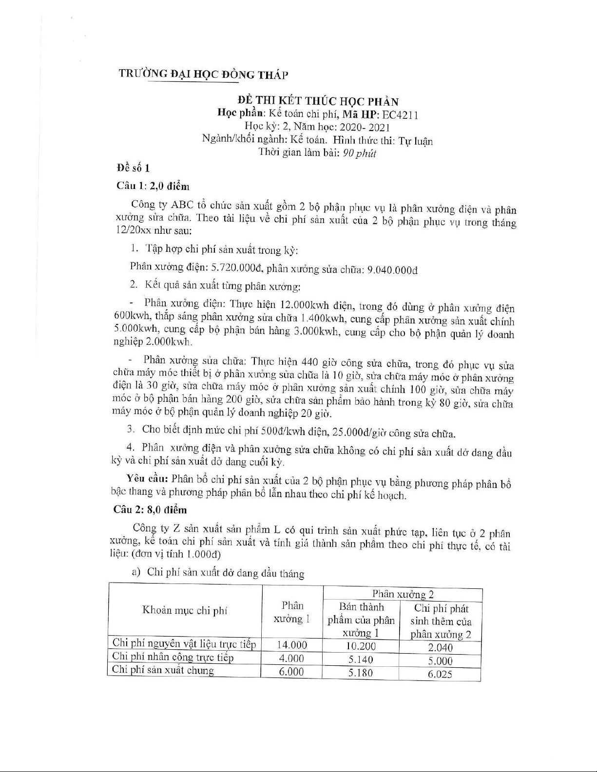 Đề thi kết thúc học phần học kì 2 môn Kế toán chi phí năm 2020-2021 có đáp án - Trường ĐH Đồng Tháp