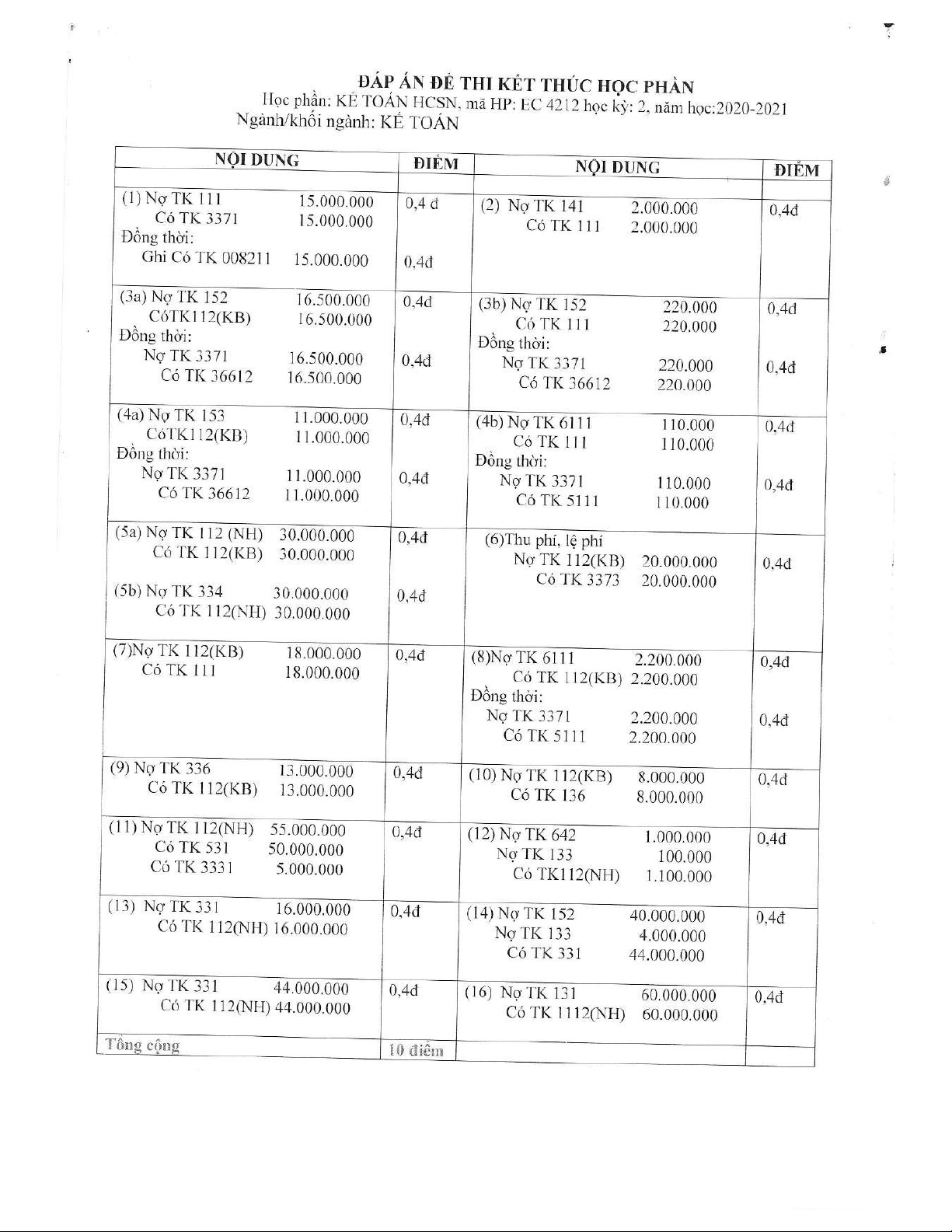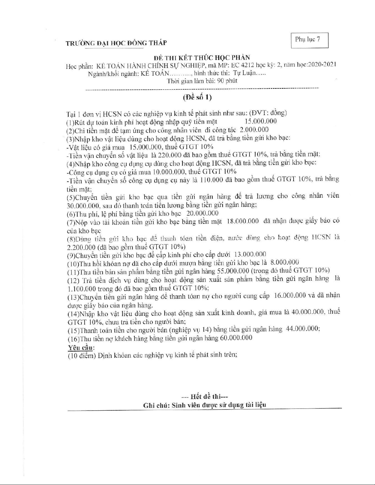 Đề thi kết thúc học phần học kì 2 môn Kế toán hành chính sự nghiệp năm 2020-2021 có đáp án - Trường ĐH Đồng Tháp