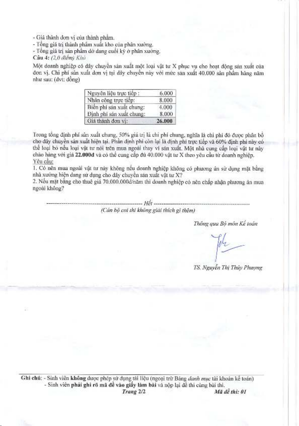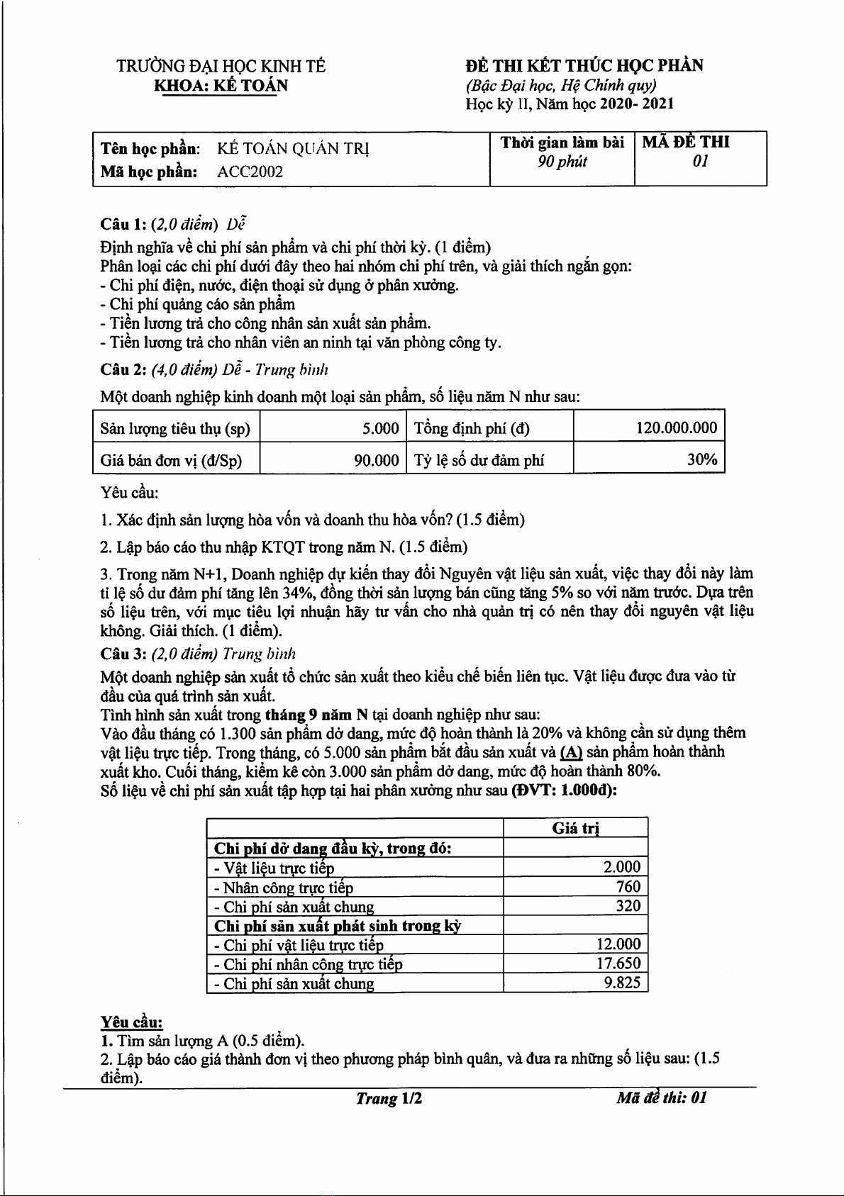 Đề thi kết thúc học phần học kì 2 môn Kế toán quản trị năm 2020-2021 - Trường Đại học Kinh tế