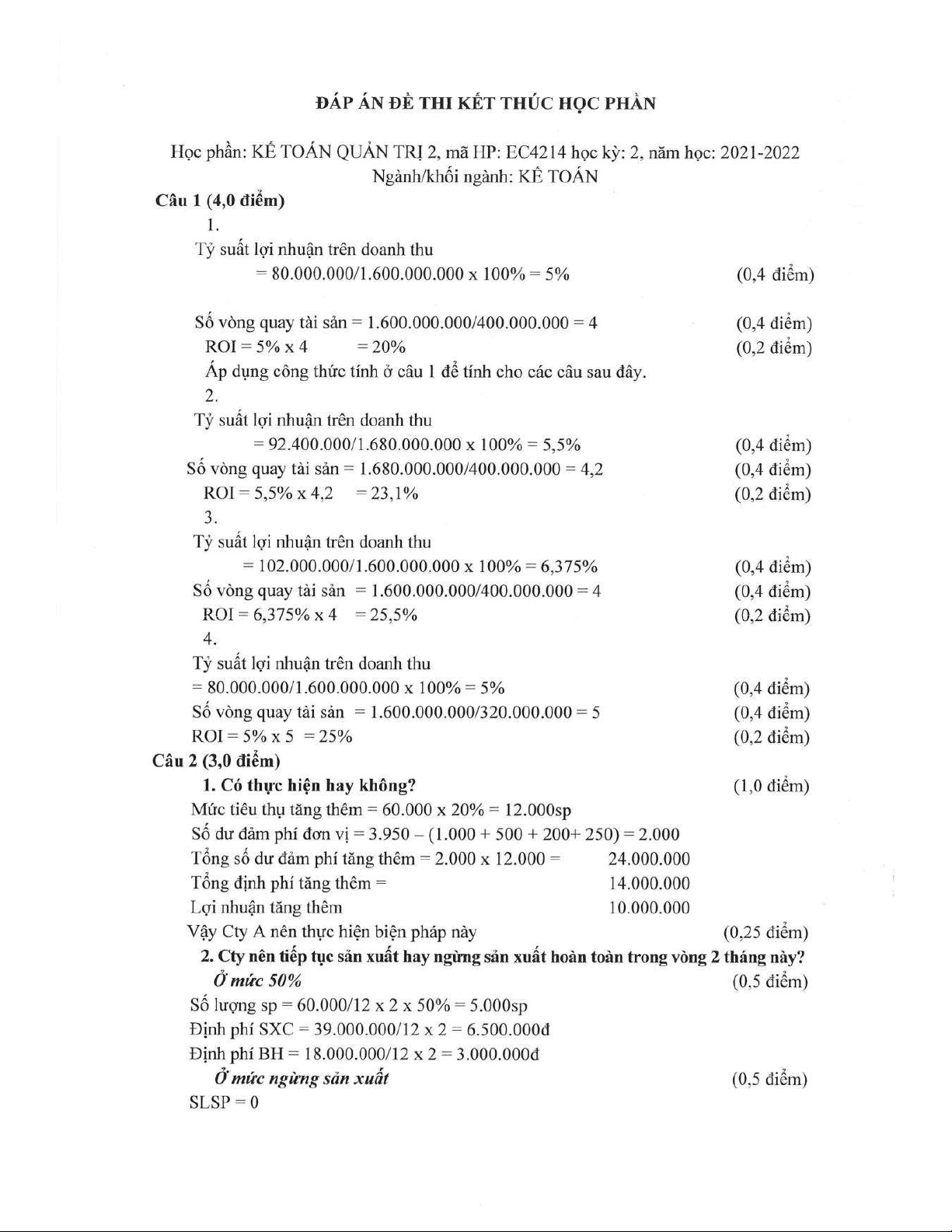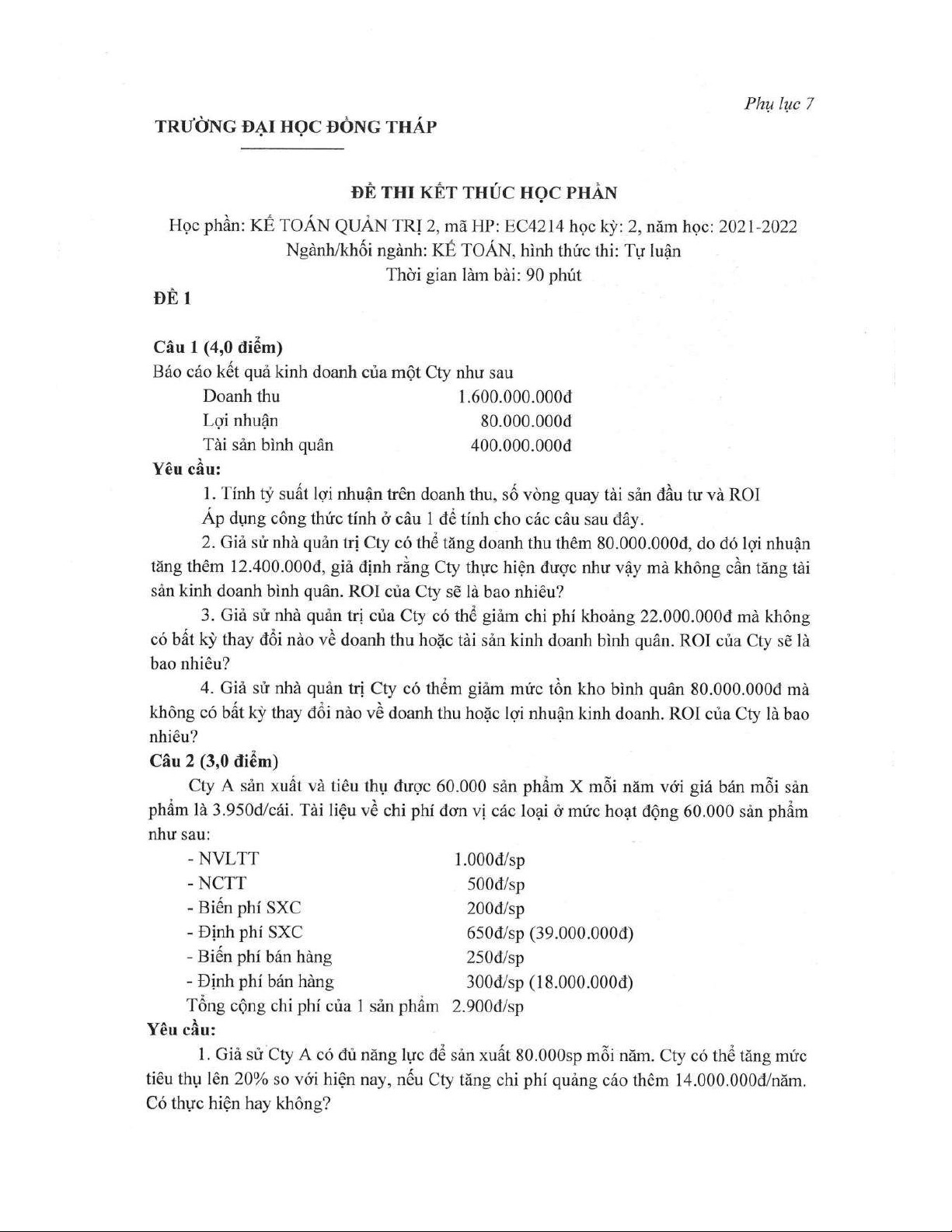 Đề thi kết thúc học phần học kì 2 môn Kế toán quản trị 2 năm 2021-2022 có đáp án - Trường ĐH Đồng Tháp