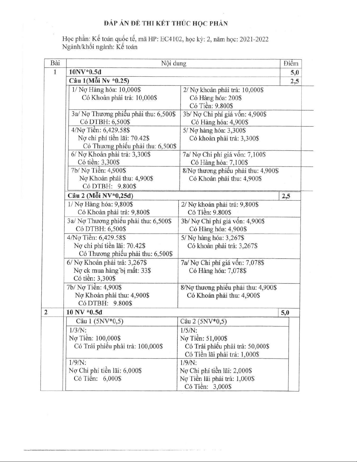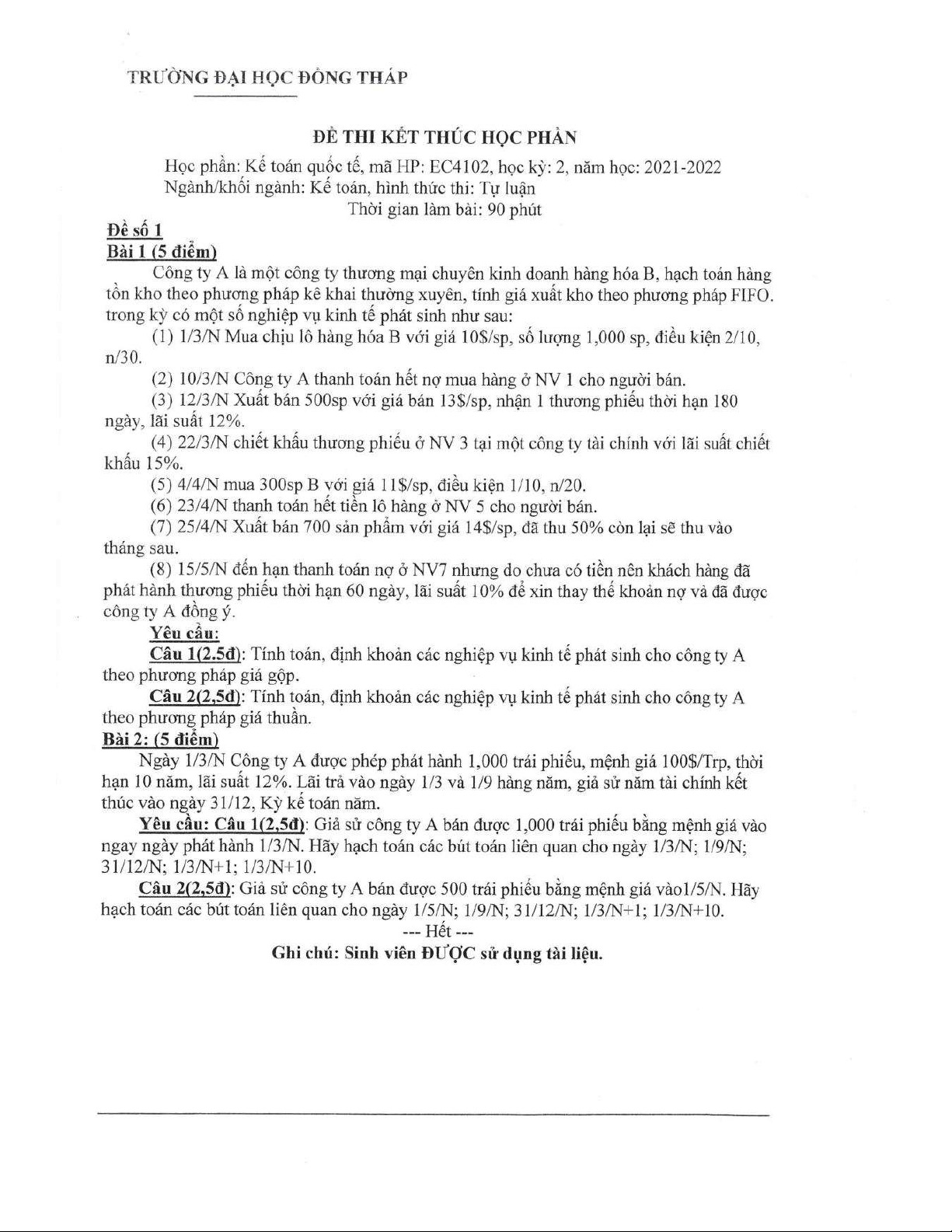 Đề thi kết thúc học phần học kì 2 môn Kế toán quốc tế năm 2021-2022 có đáp án - Trường ĐH Đồng Tháp
