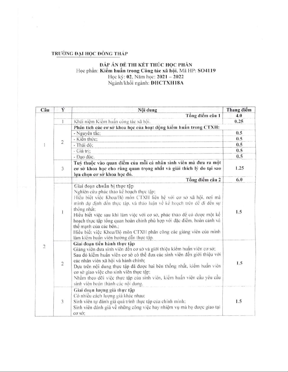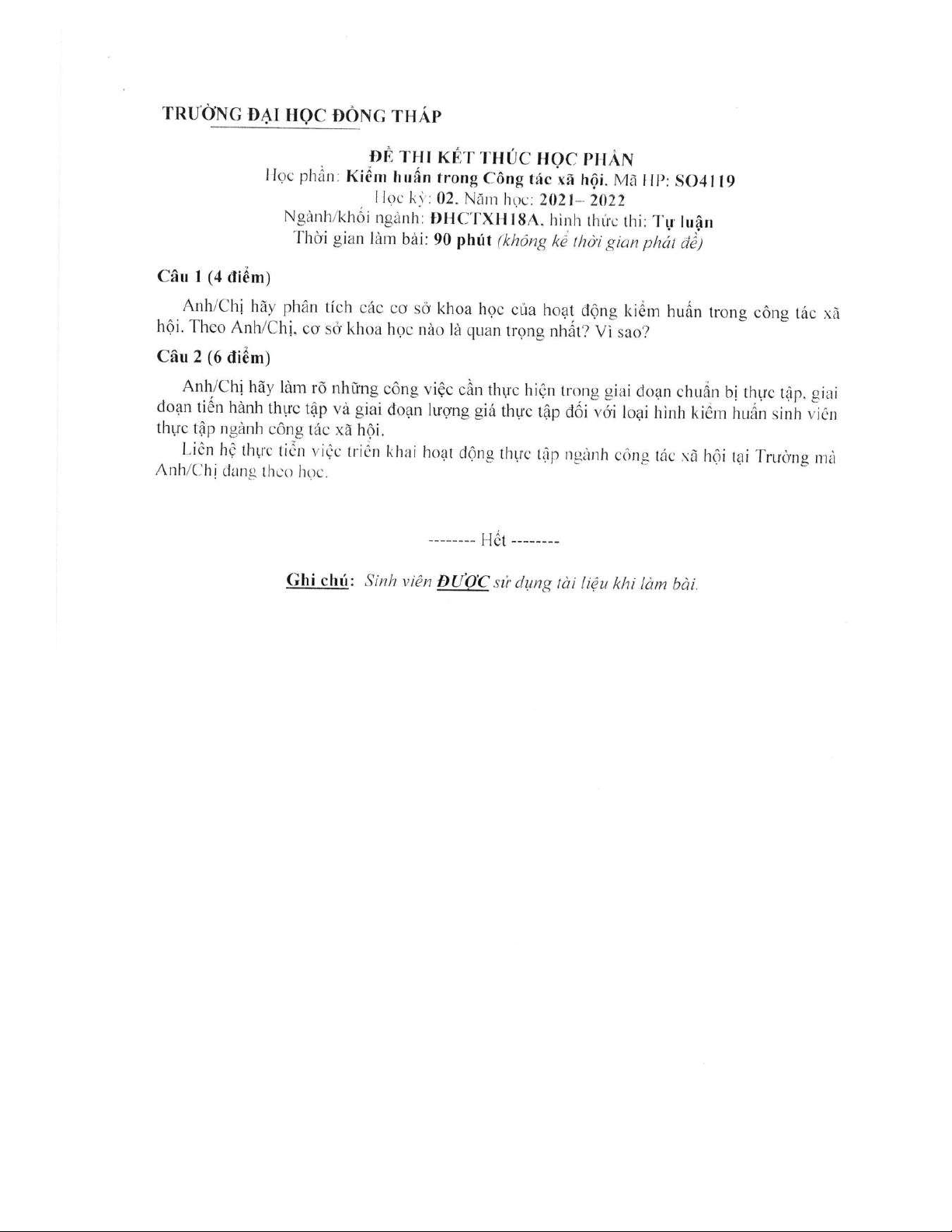 Đề thi kết thúc học phần học kì 2 môn Kiểm huấn trong công tác xã hội năm 2021-2022 có đáp án - Trường ĐH Đồng Tháp