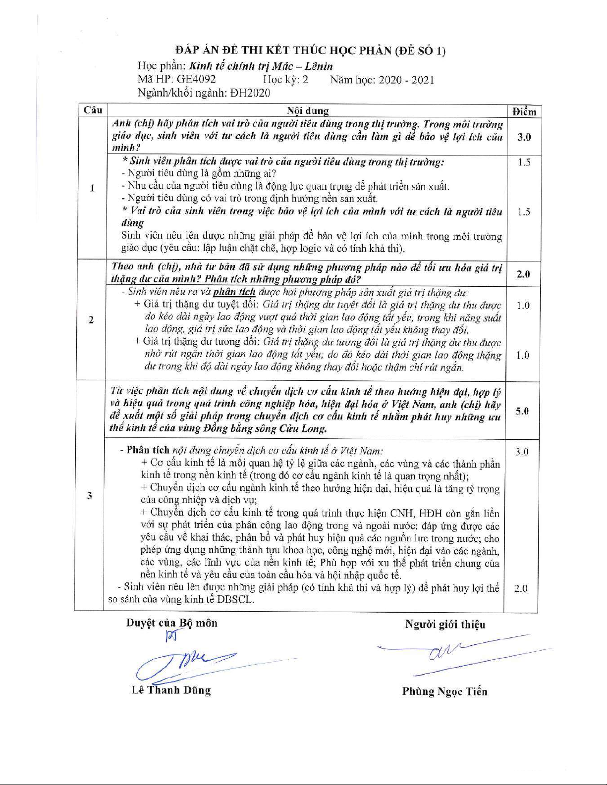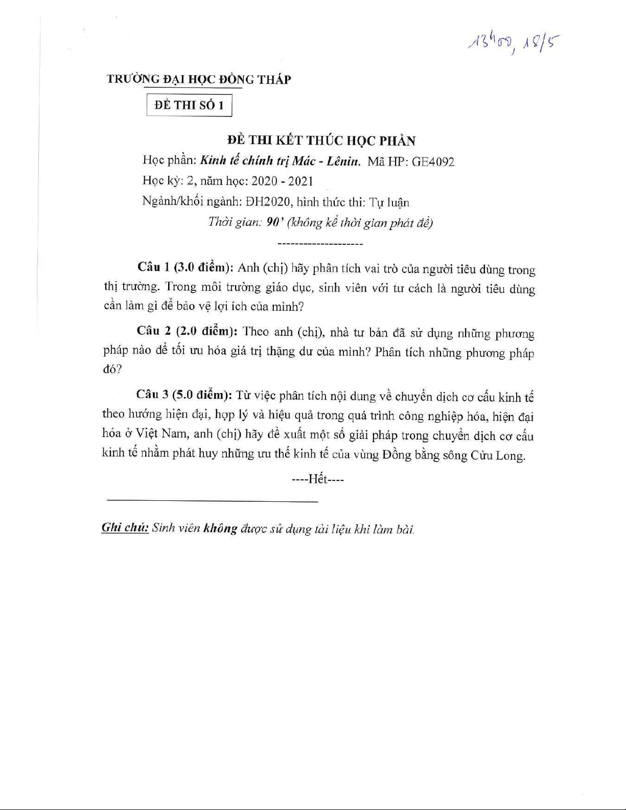 Đề thi kết thúc học phần học kì 2 môn Kinh tế chính trị Mác-Lê Nin năm 2020-2021 có đáp án - Trường ĐH Đồng Tháp (Đề 2)