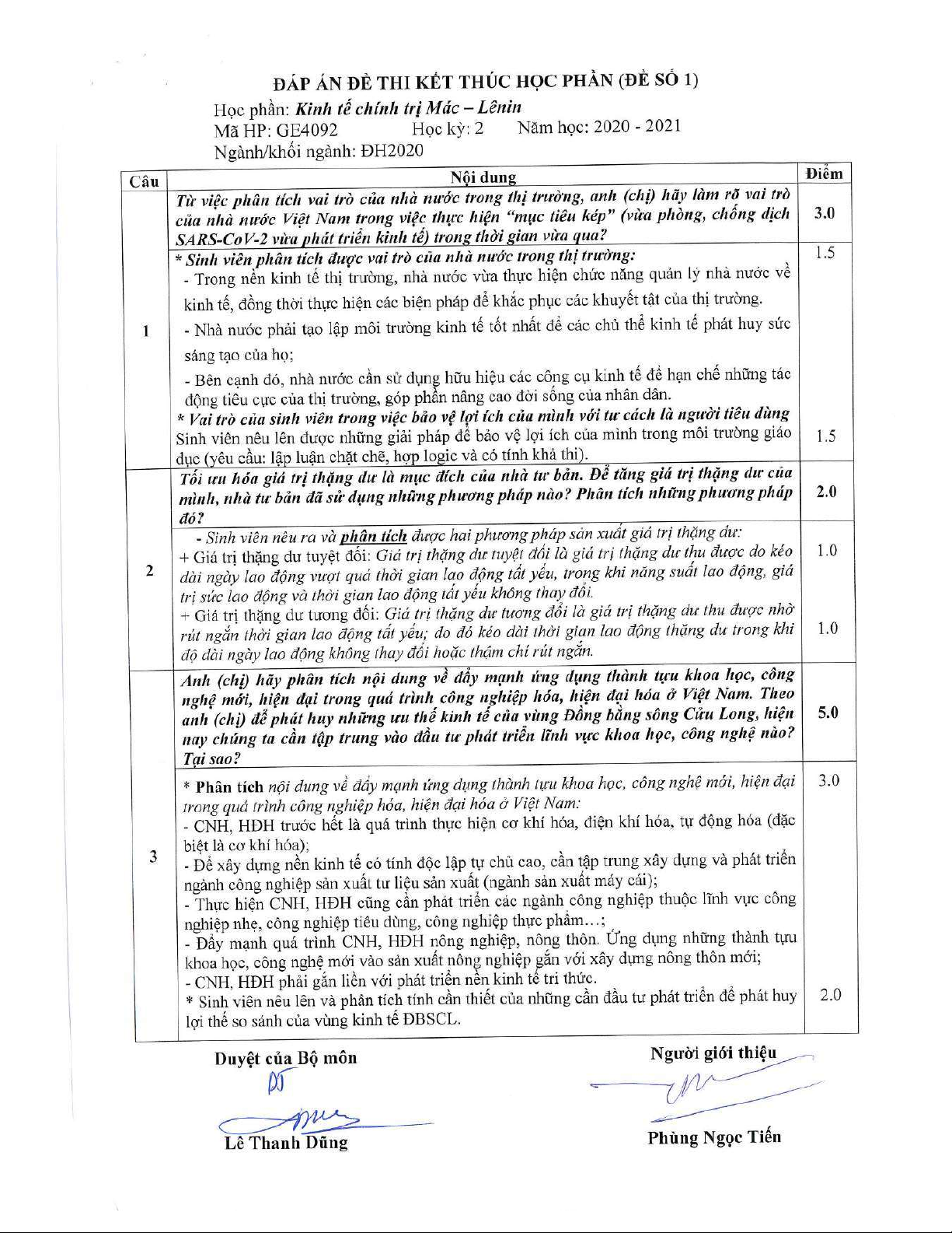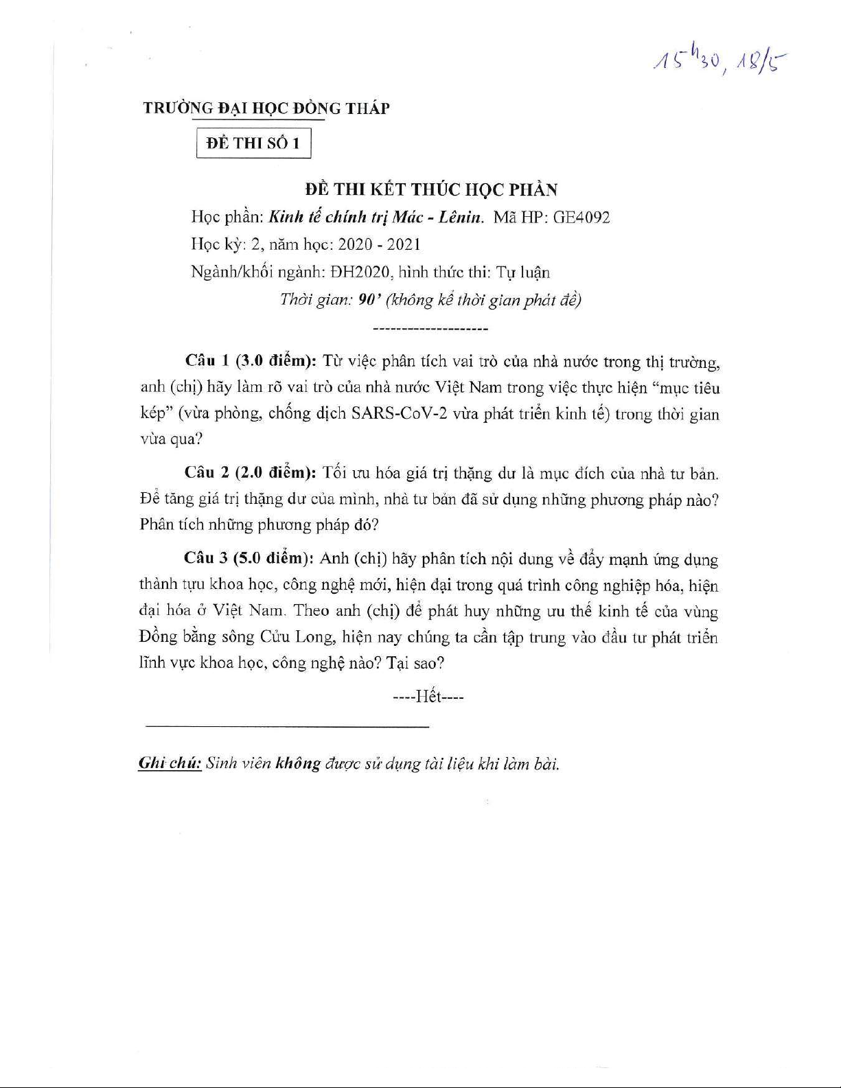 Đề thi kết thúc học phần học kì 2 môn Kinh tế chính trị Mác-LêNin năm 2020-2021 có đáp án - Trường ĐH Đồng Tháp