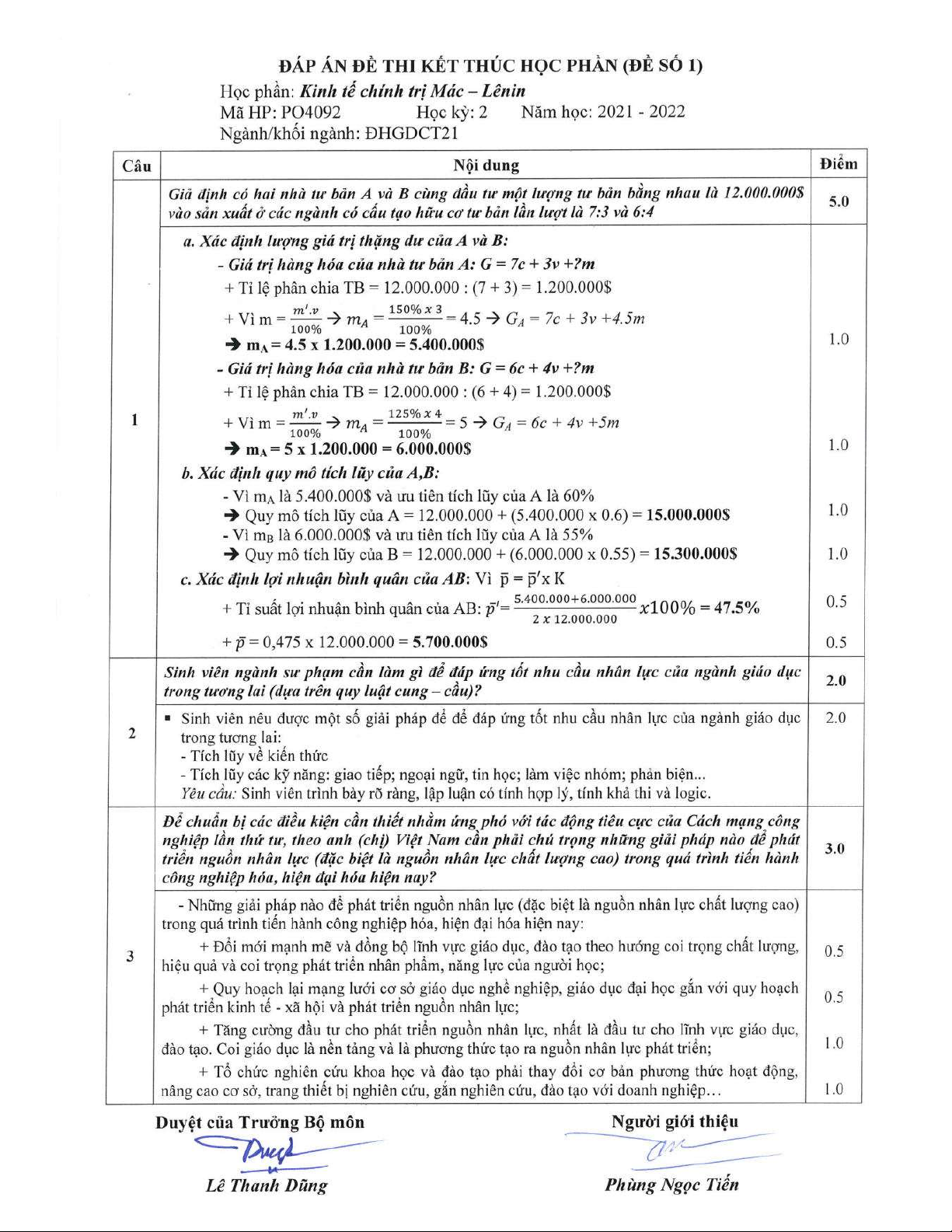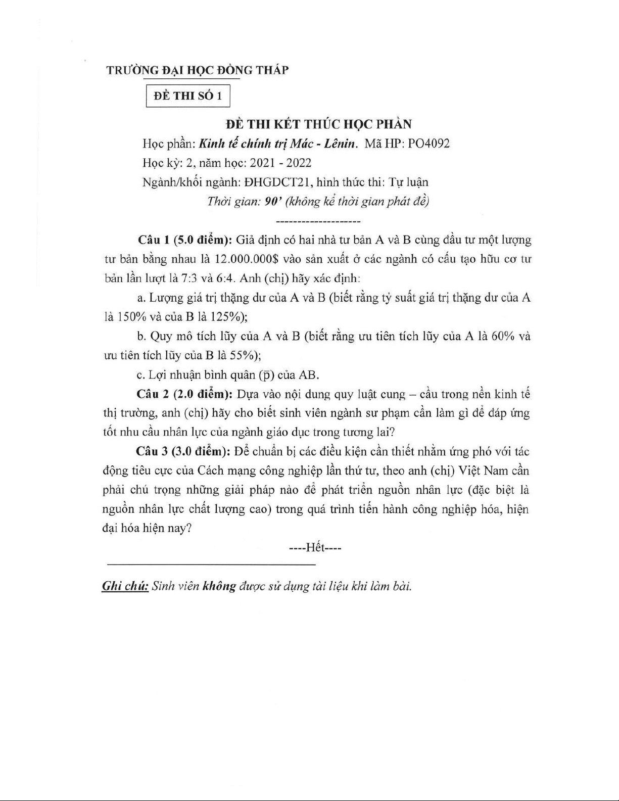 Đề thi kết thúc học phần học kì 2 môn Kinh tế chính trị Mác-LêNin năm 2021-2022 có đáp án - Trường ĐH Đồng Tháp (Đề 1)