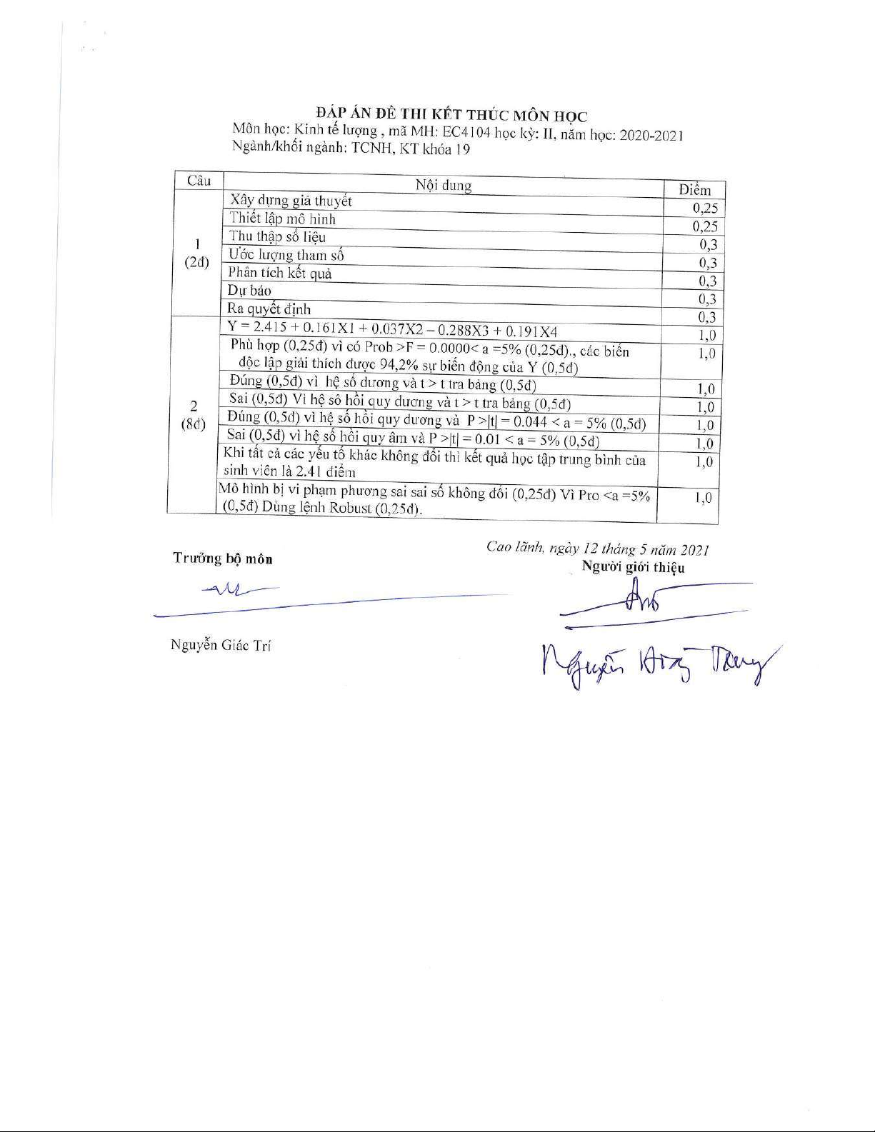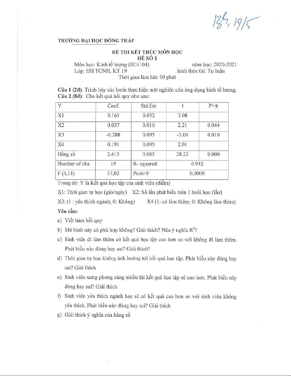 Đề thi kết thúc học phần học kì 2 môn Kinh tế lượng năm 2020-2021 có đáp án - Trường ĐH Đồng Tháp