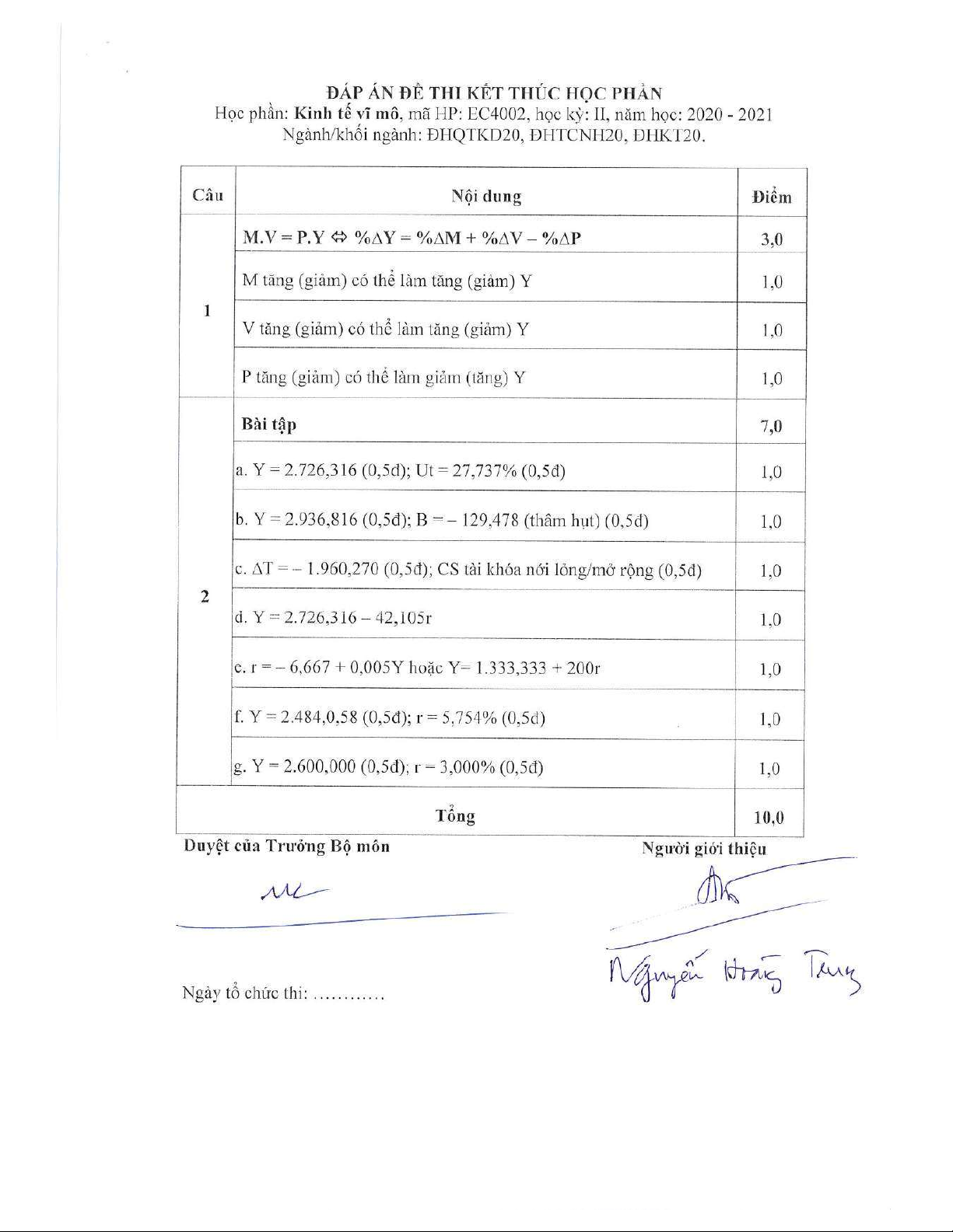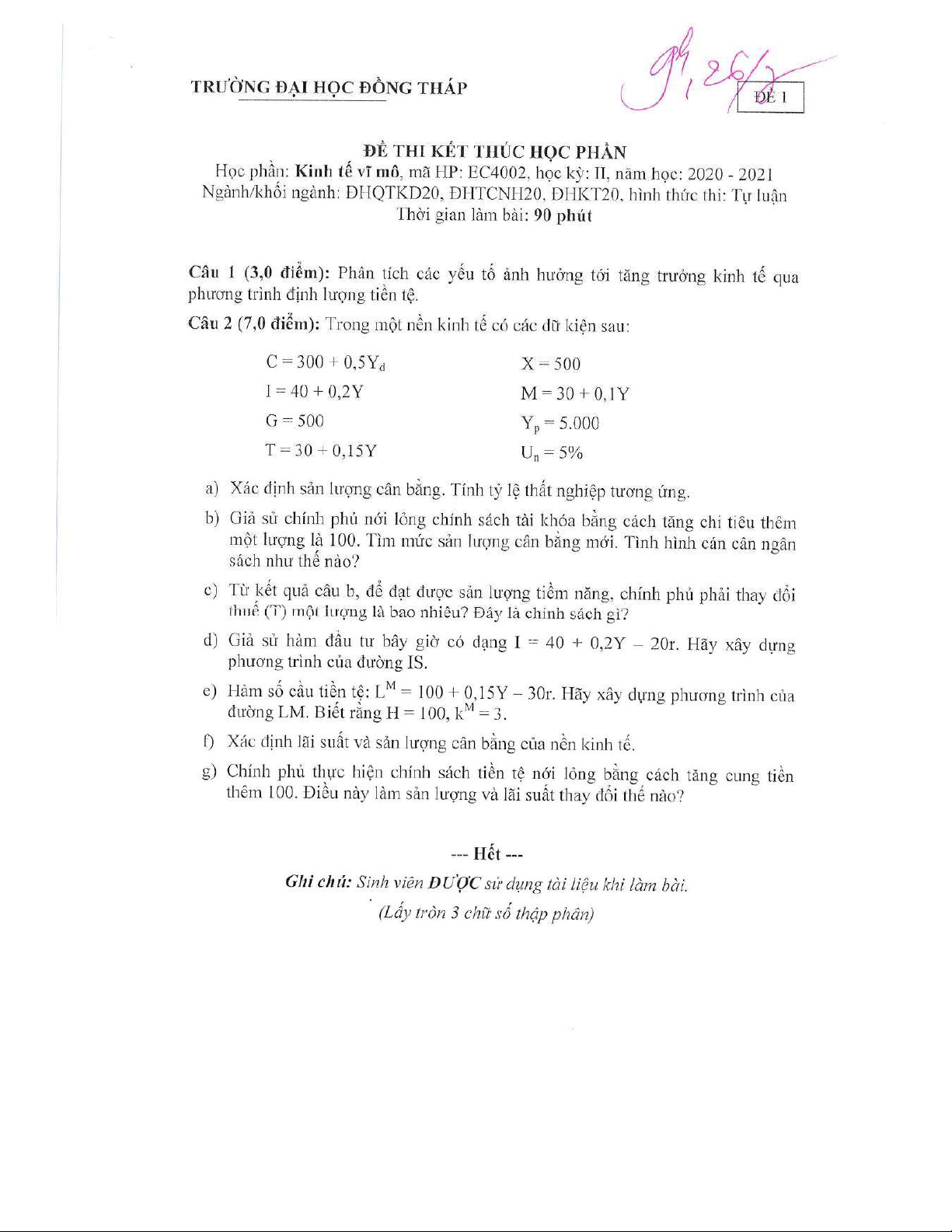 Đề thi kết thúc học phần học kì 2 môn Kinh tế vĩ mô năm 2020-2021 có đáp án - Trường ĐH Đồng Tháp