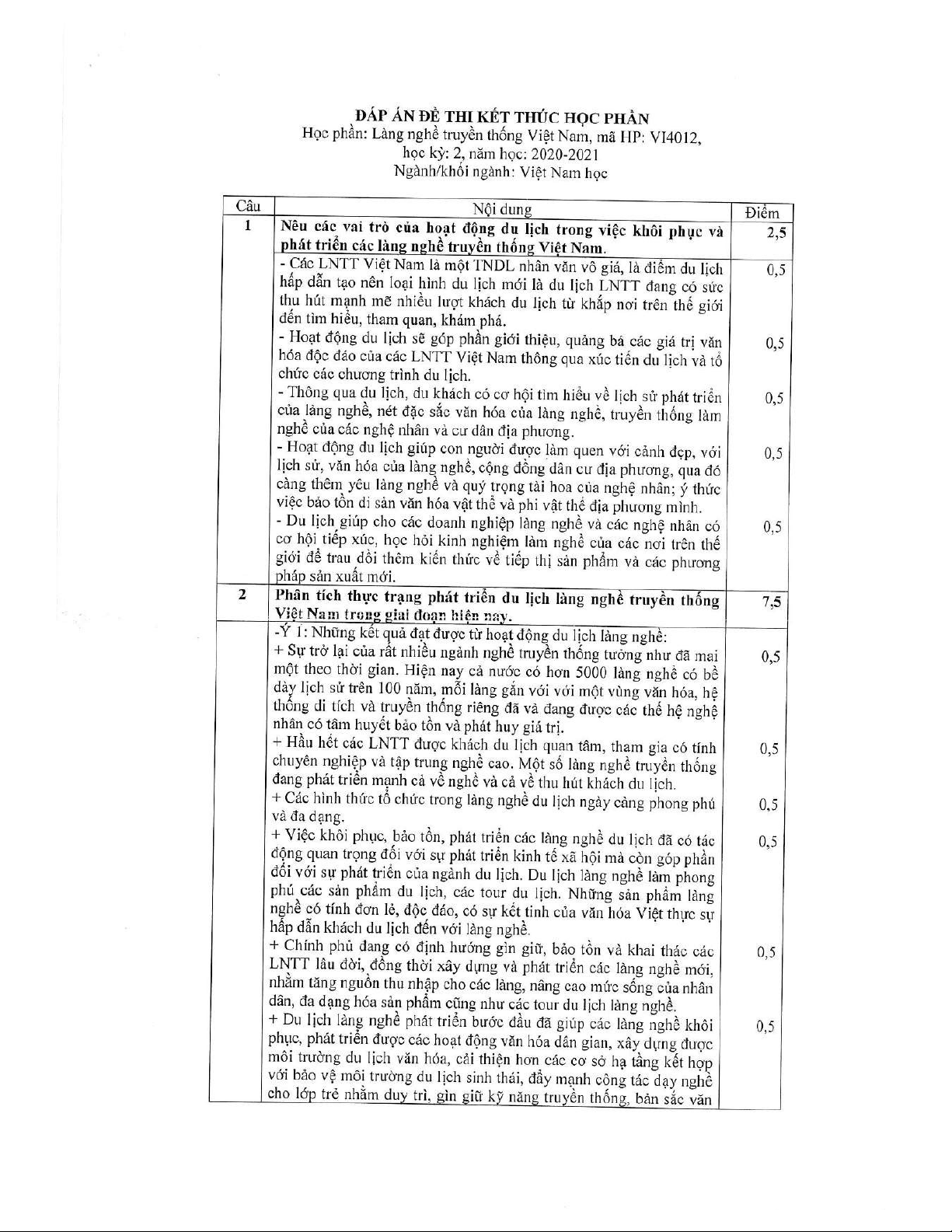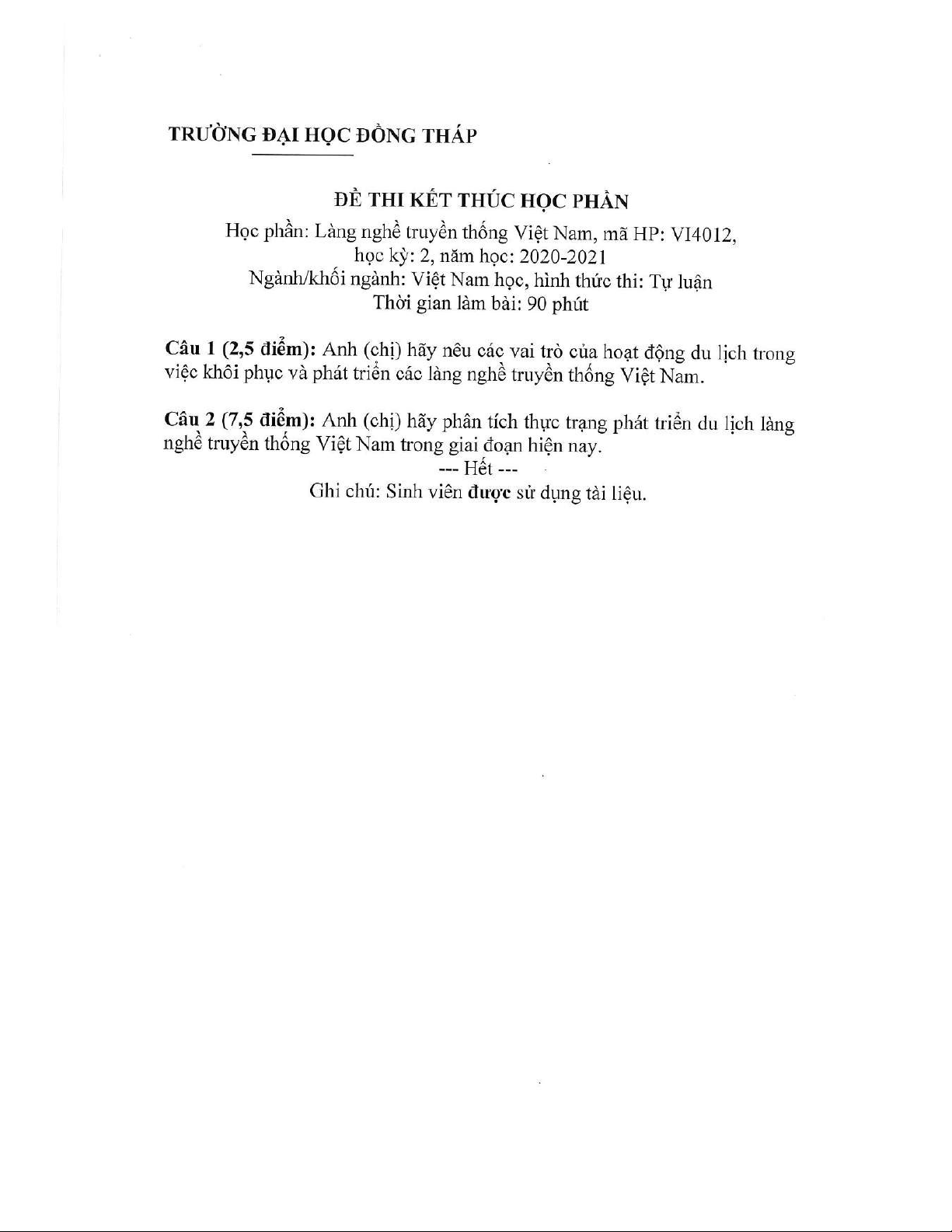 Đề thi kết thúc học phần học kì 2 môn Làng nghề truyền thống Việt Nam năm 2020-2021 có đáp án - Trường ĐH Đồng Tháp