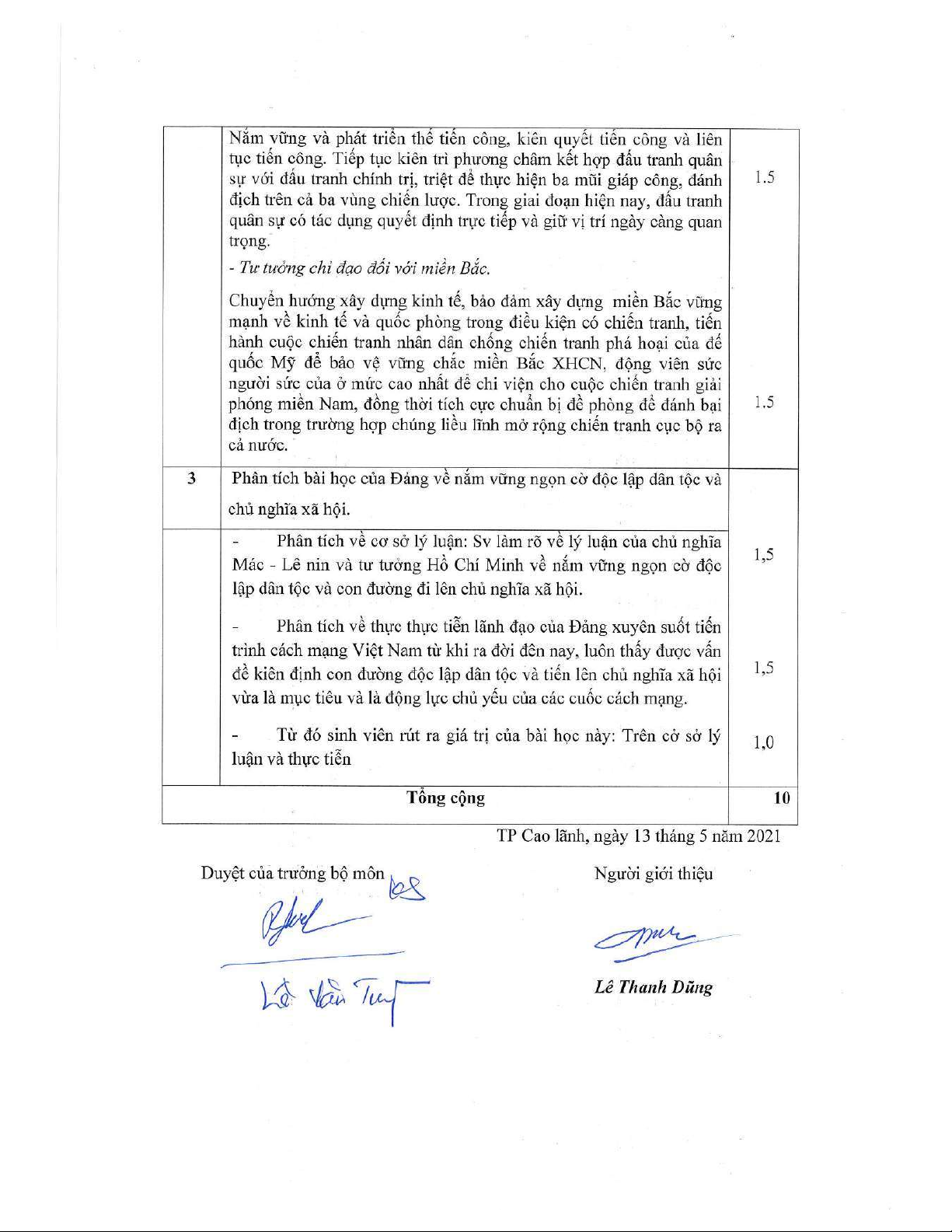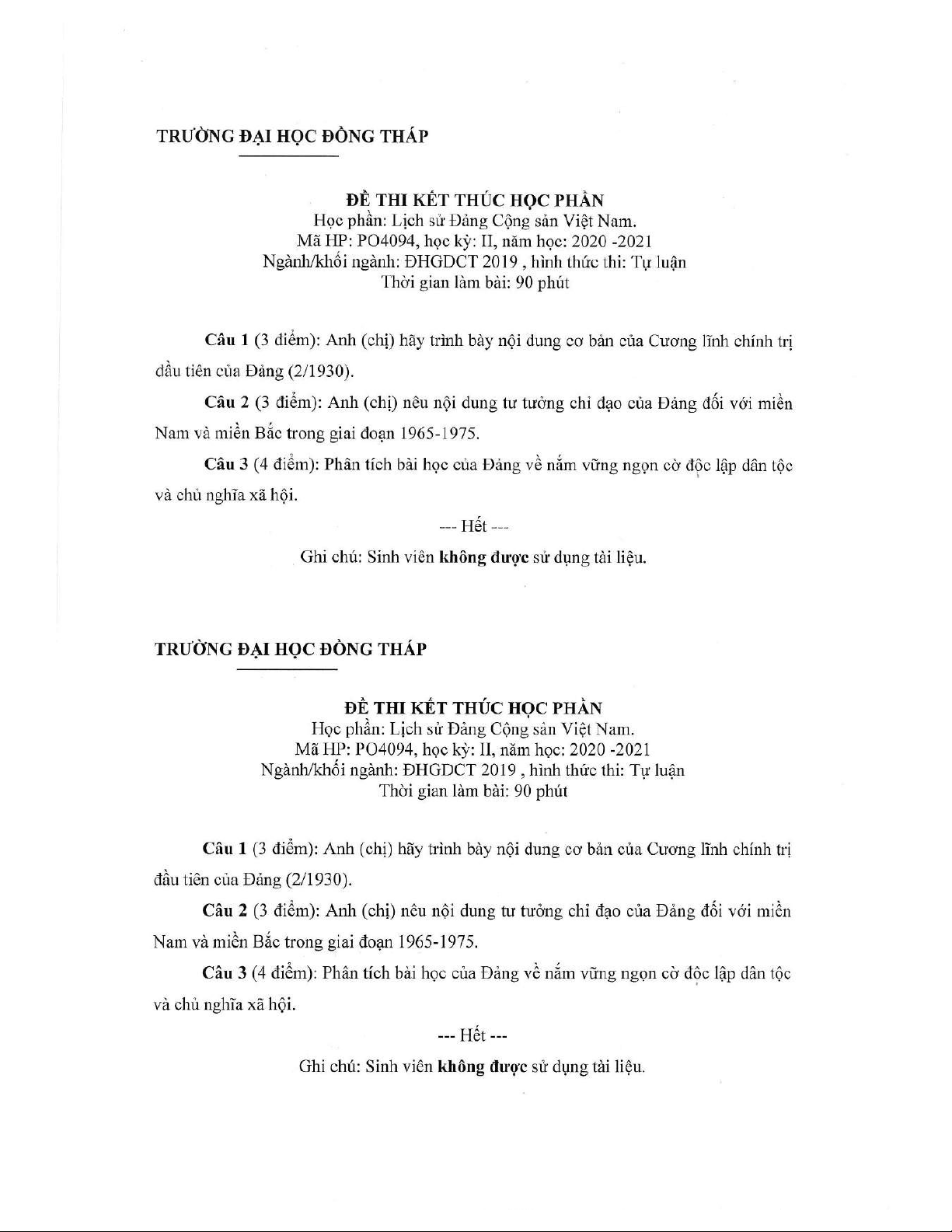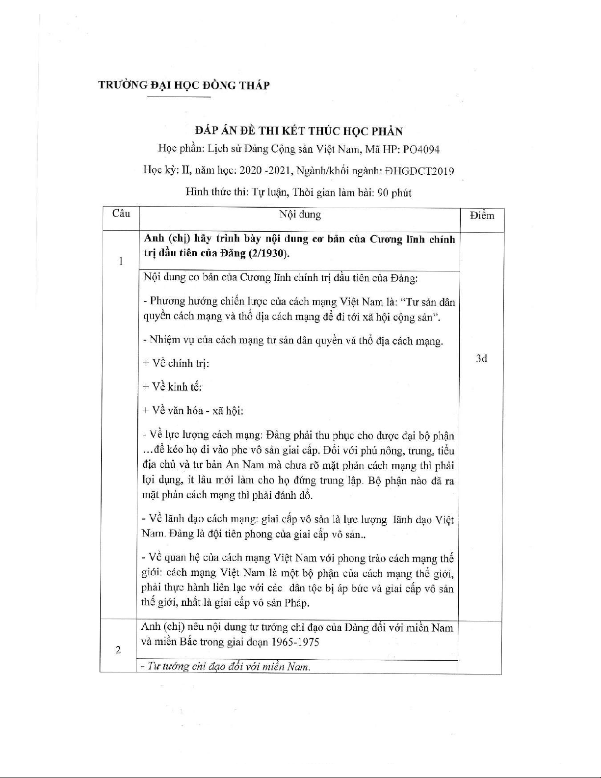 Đề thi kết thúc học phần học kì 2 môn Lịch sử Đảng Cộng Sản Việt Nam năm 2020-2021 có đáp án - Trường ĐH Đồng Tháp