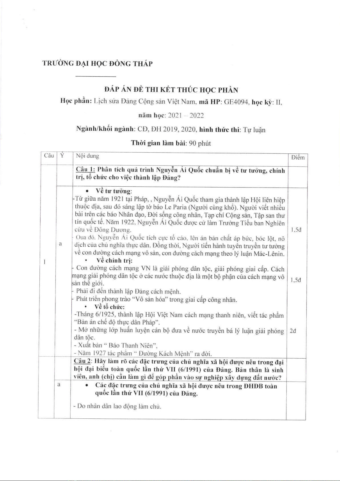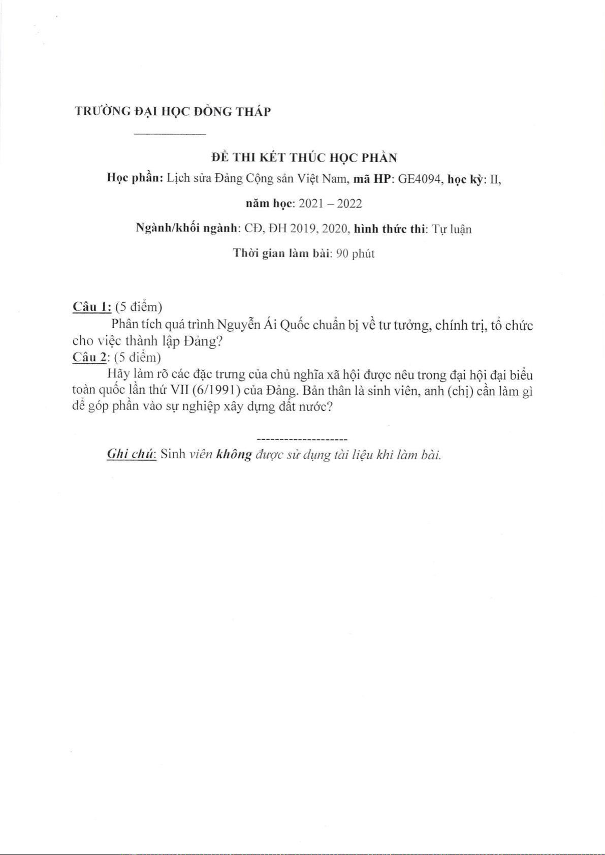 Đề thi kết thúc học phần học kì 2 môn Lịch sử Đảng Cộng Sản Việt Nam năm 2021-2022 có đáp án - Trường ĐH Đồng Tháp