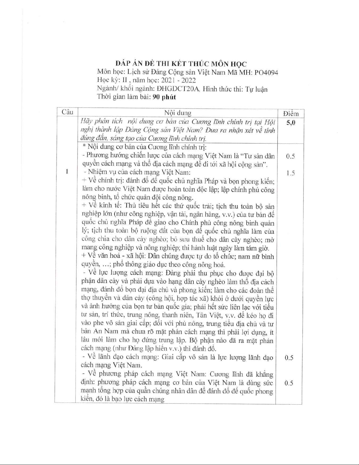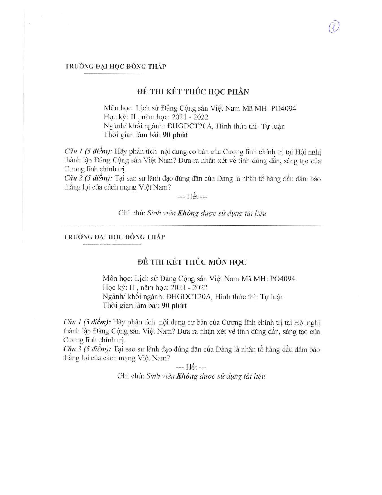 Đề thi kết thúc học phần học kì 2 môn Lịch sử đảng Cộng sản VN năm 2021-2022 có đáp án - Trường ĐH Đồng Tháp