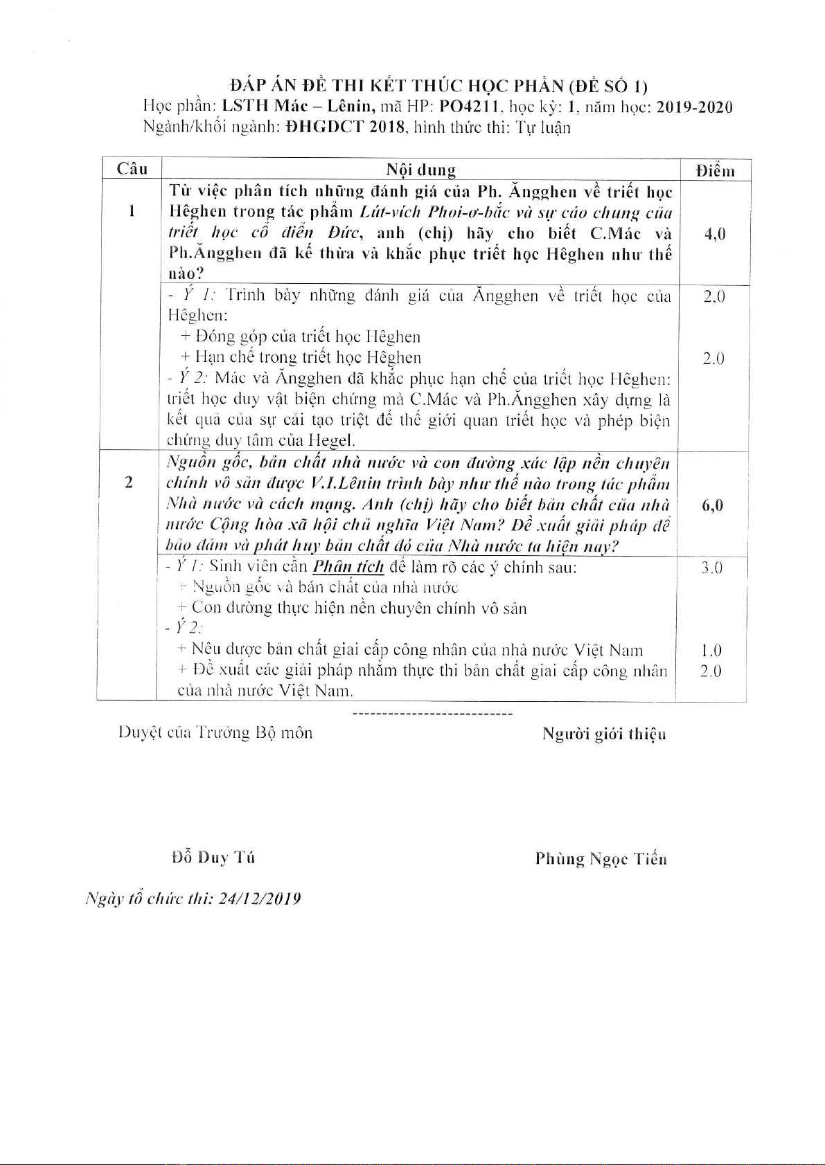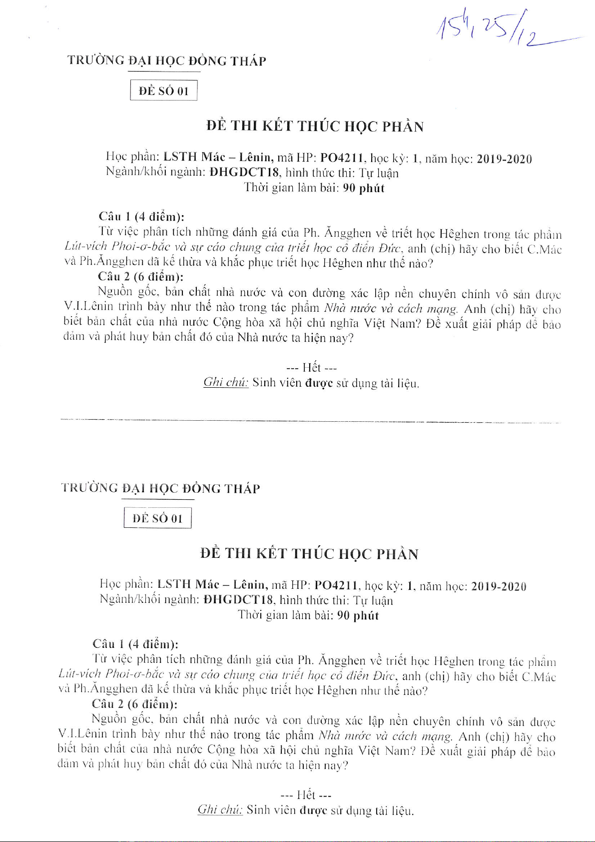 Đề thi kết thúc học phần học kì 1 môn Lịch sử triết học Mác - LêNin năm 2019-2020 có đáp án - Trường ĐH Đồng Tháp