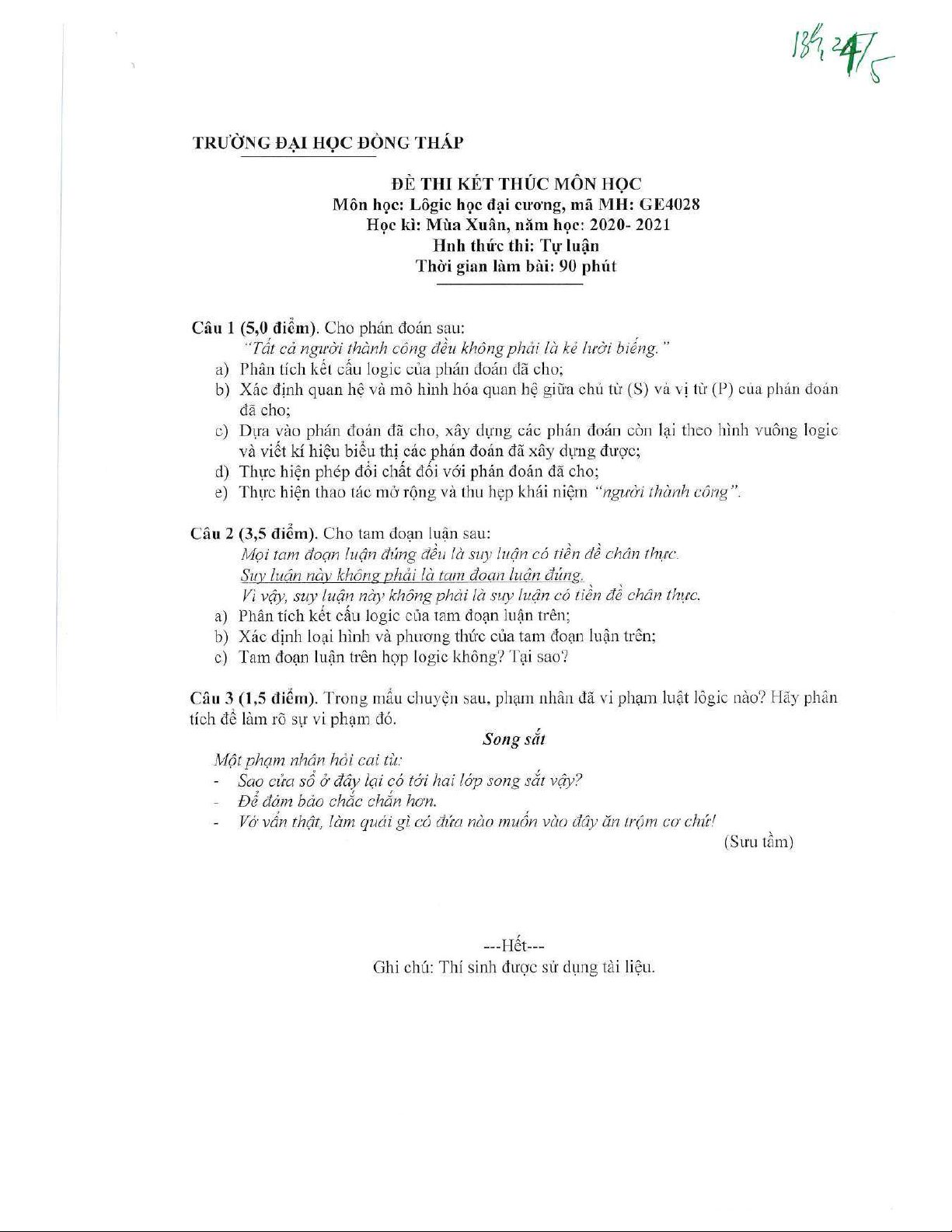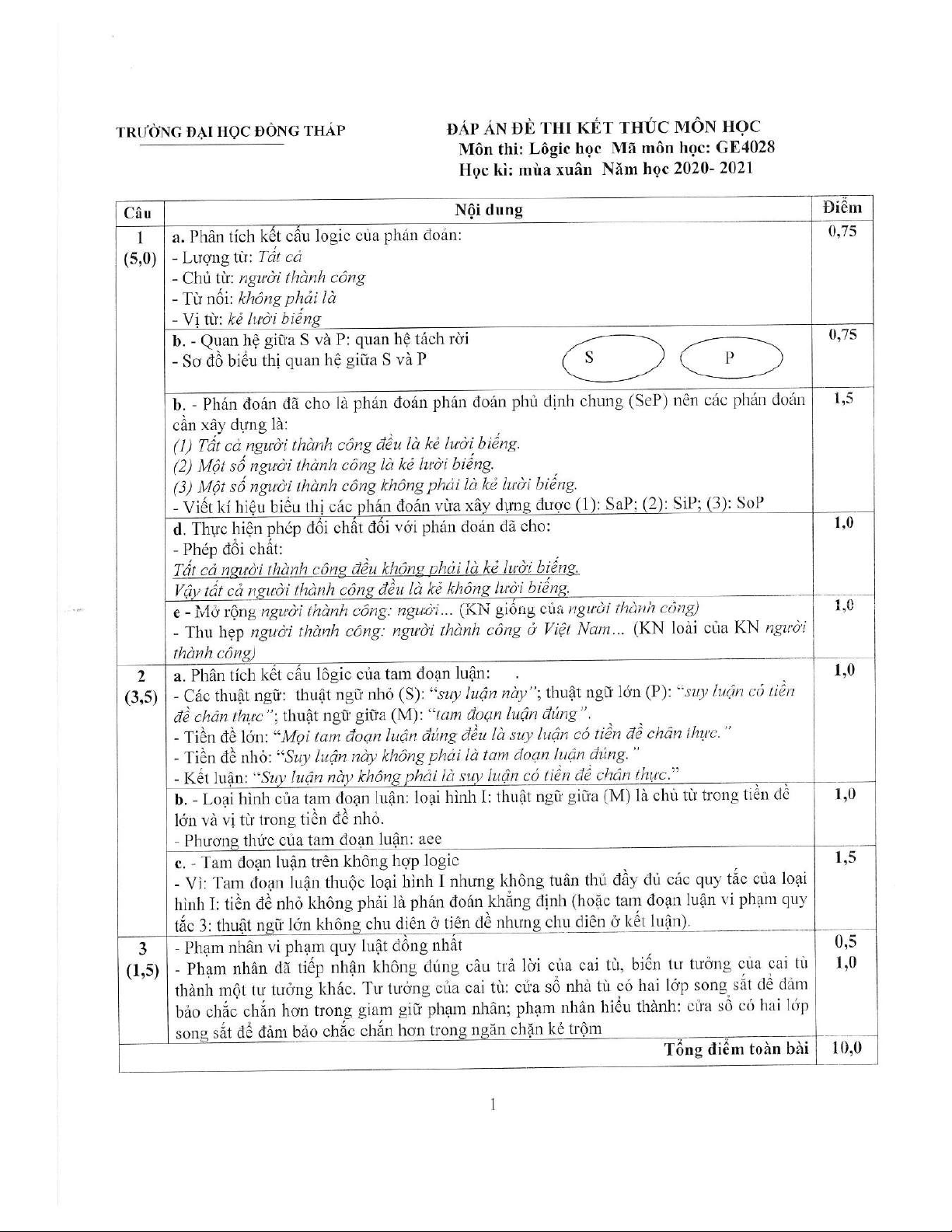 Đề thi kết thúc học phần học kì 2 môn Logic học đại cương năm 2020-2021 có đáp án - Trường ĐH Đồng Tháp