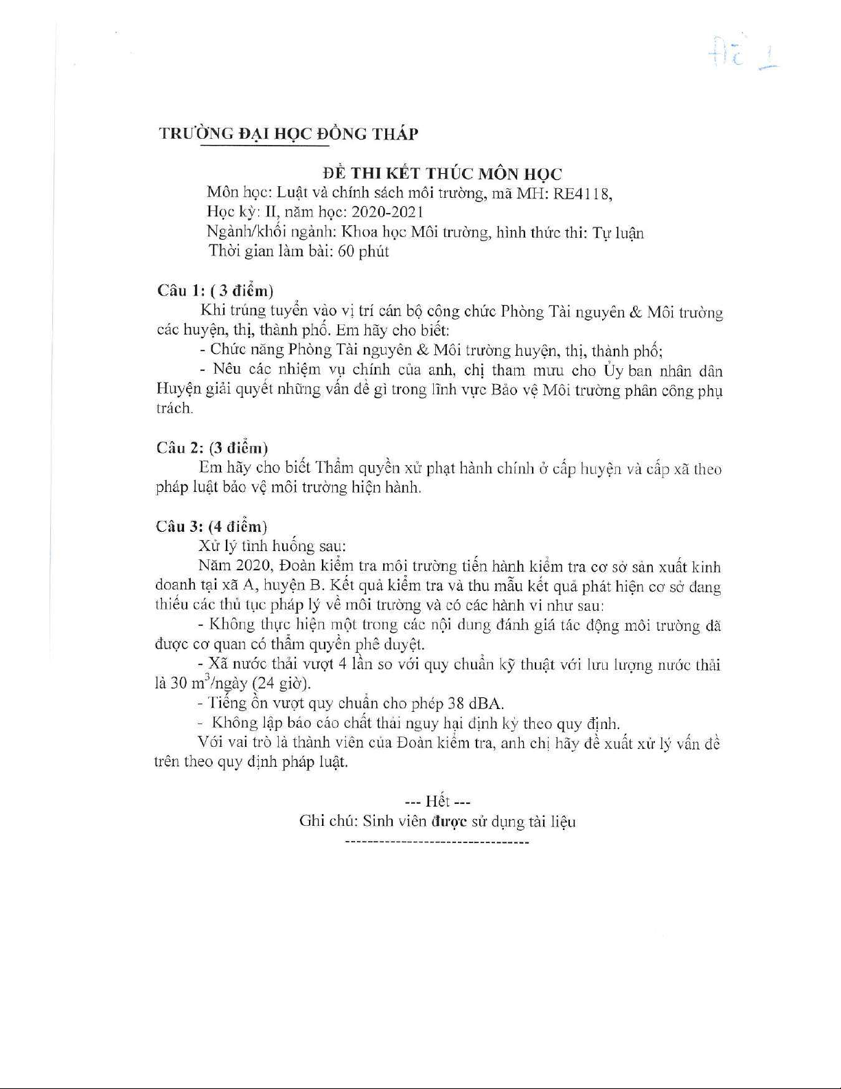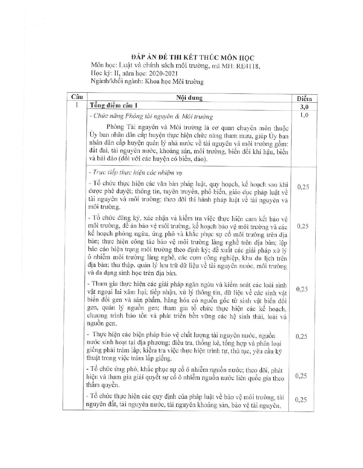 Đề thi kết thúc học phần học kì 2 môn Luật và Chính sách môi trường năm 2020-2021 có đáp án - Trường ĐH Đồng Tháp