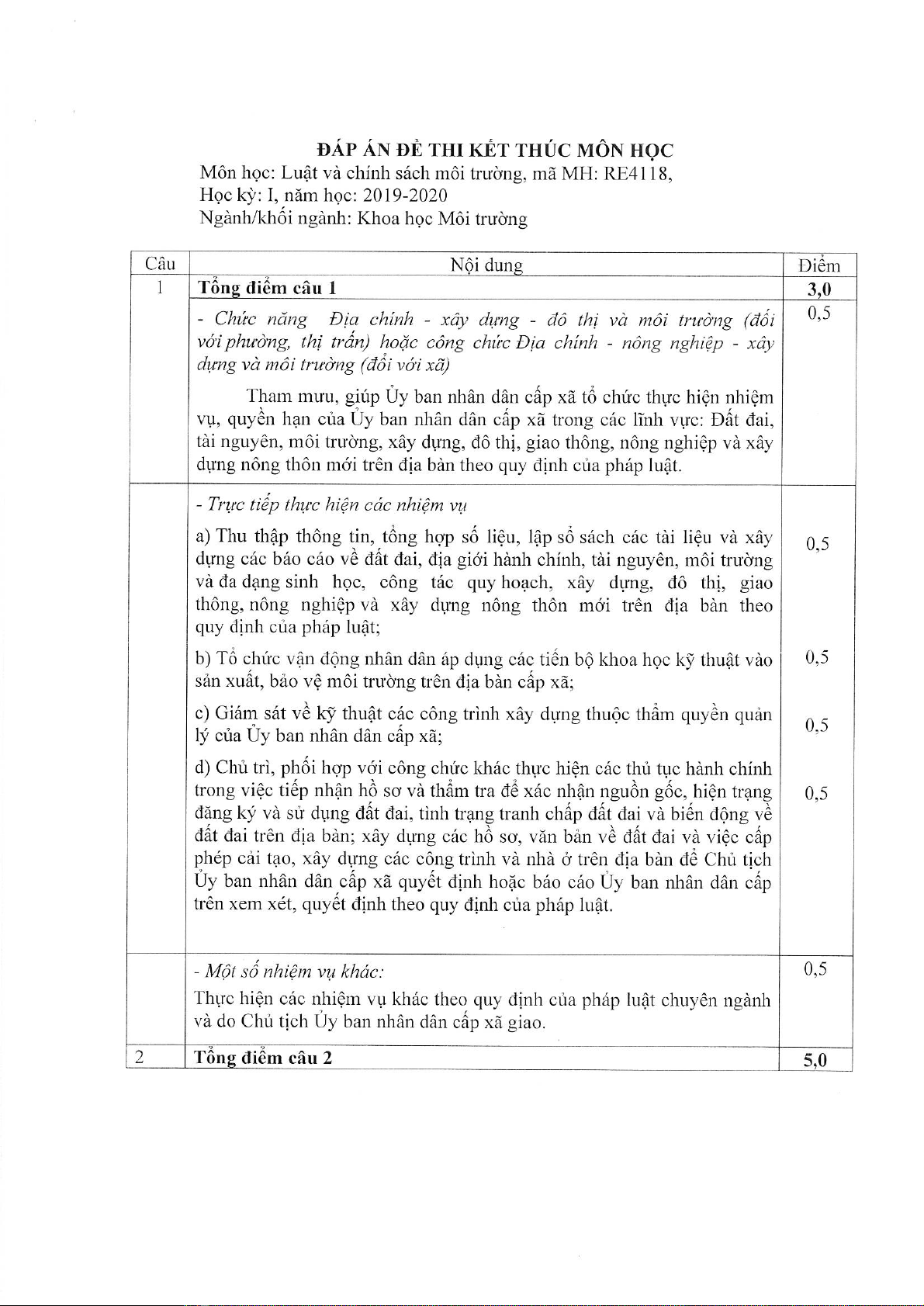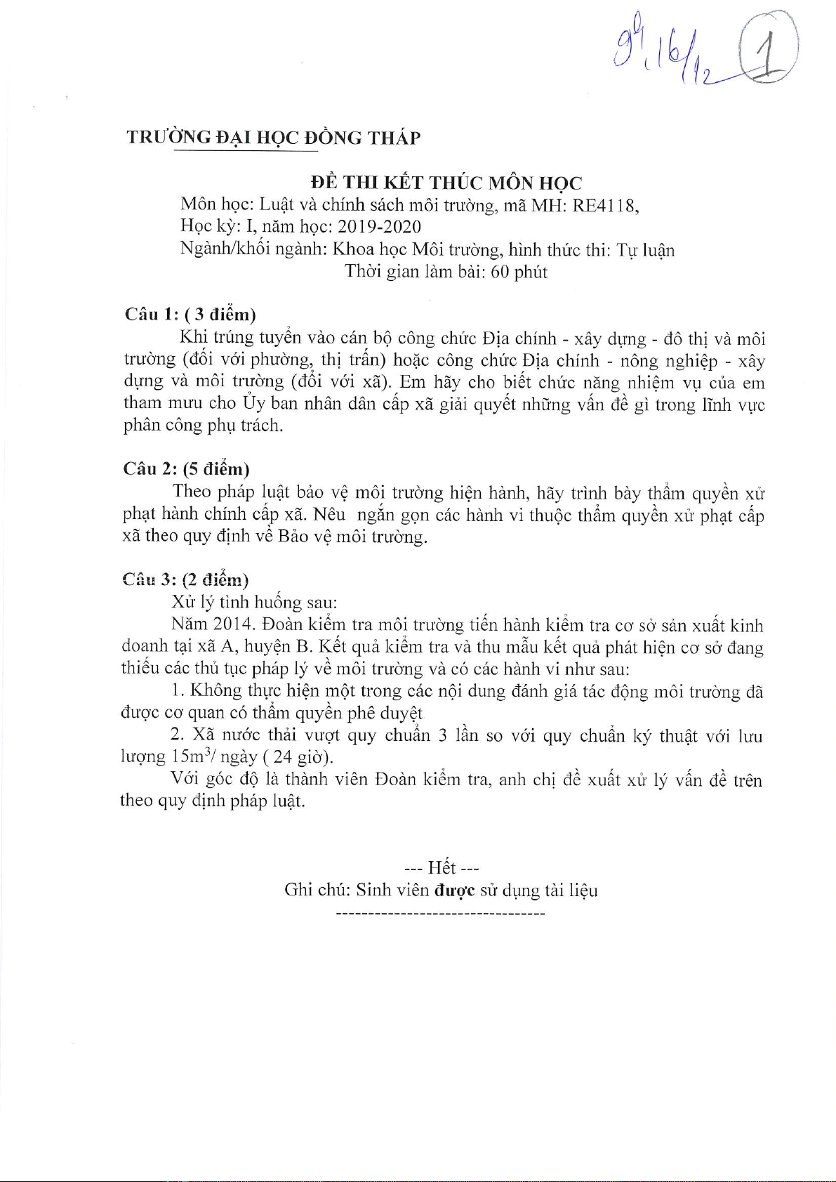 Đề thi kết thúc học phần học kì 1 môn Luật và chính sách môi trường năm 2019-2020 có đáp án - Trường ĐH Đồng Tháp