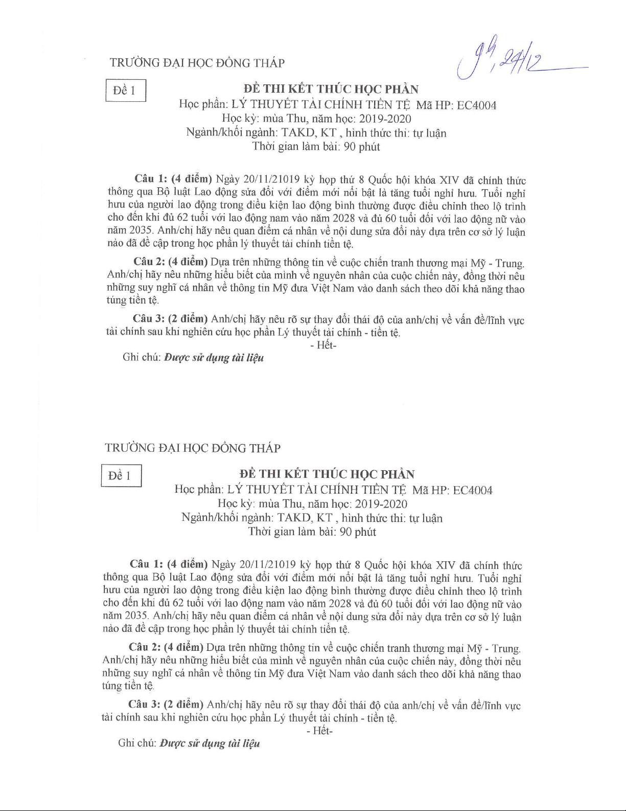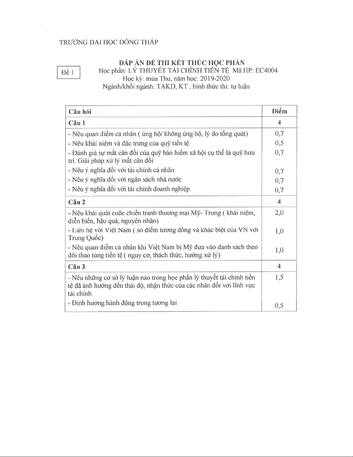 Đề thi kết thúc học phần học kì 1 môn Lý thuyết tài chính tiền tệ năm 2019-2020 có đáp án - Trường ĐH Đồng Tháp
