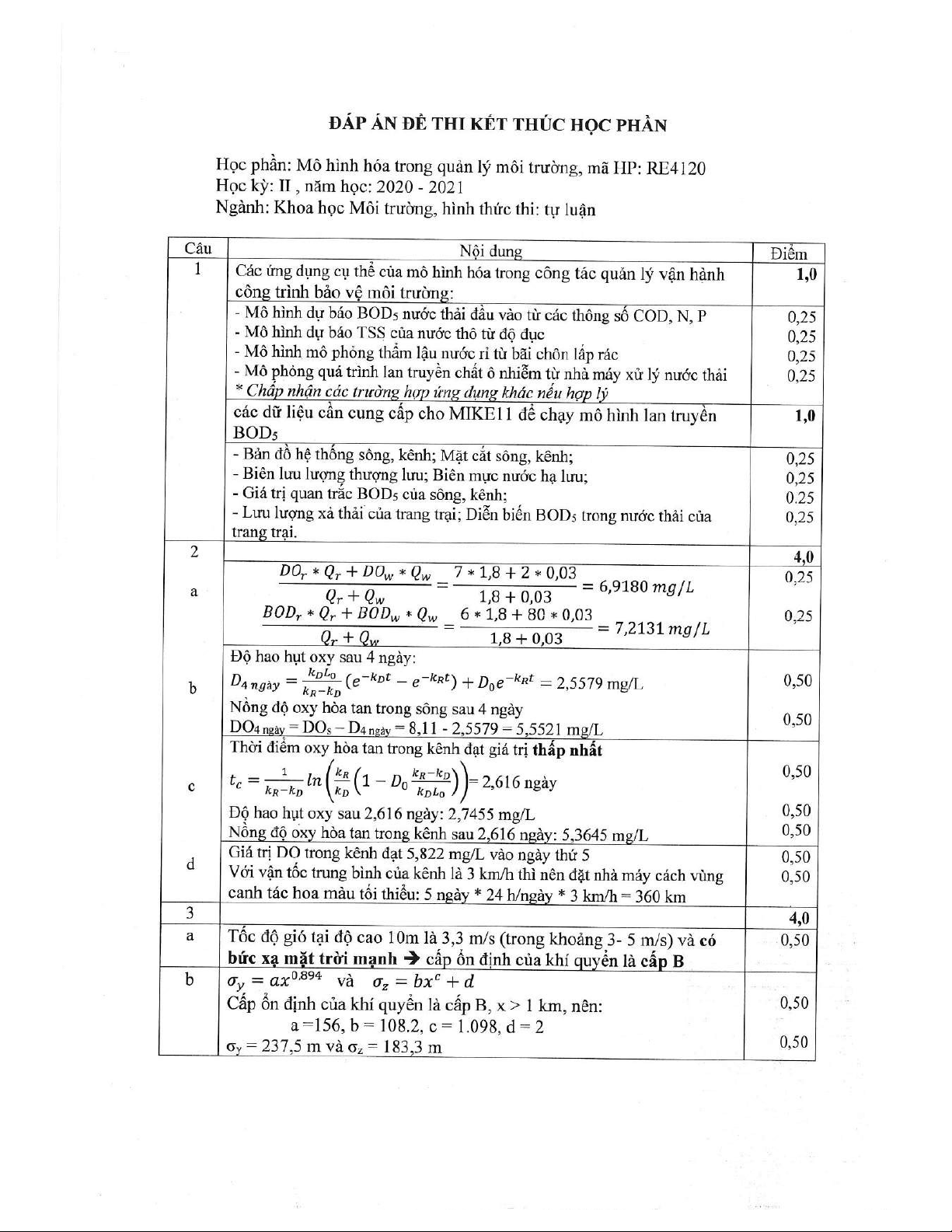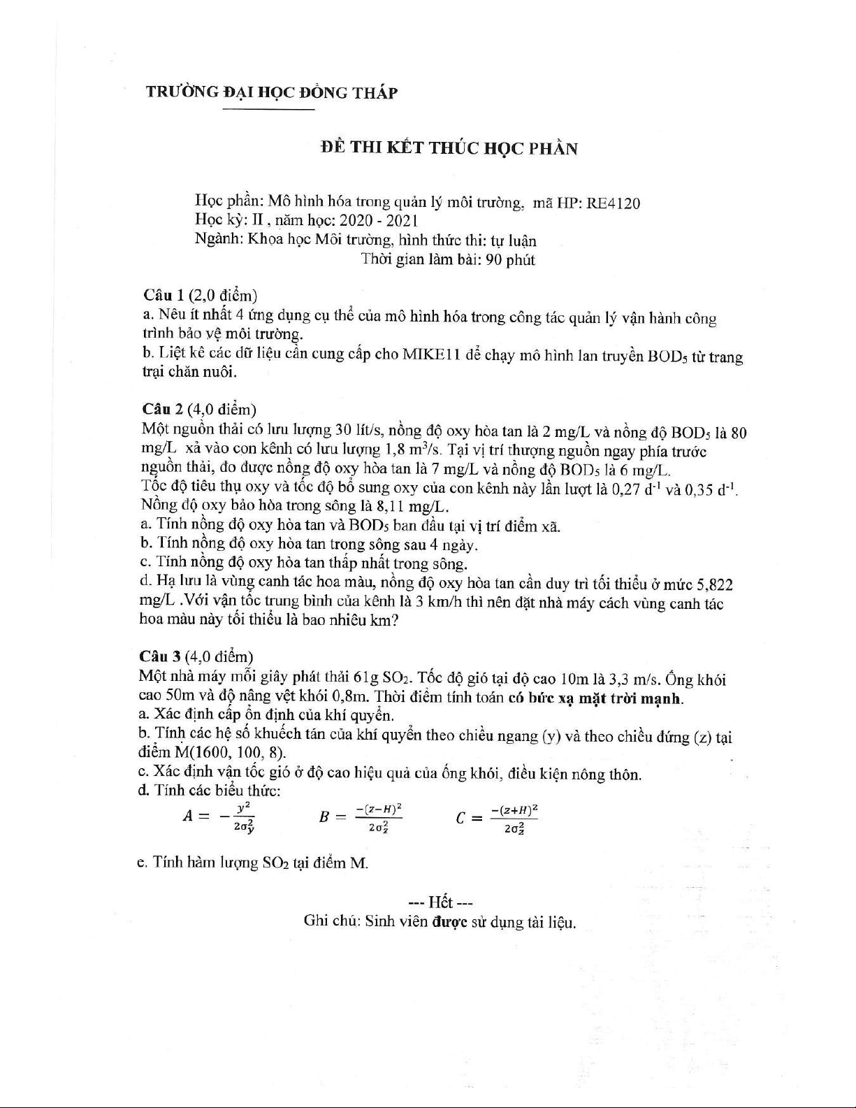 Đề thi kết thúc học phần học kì 2 môn Mô hình hóa quản lý môi trường năm 2020-2021 có đáp án - Trường ĐH Đồng Tháp