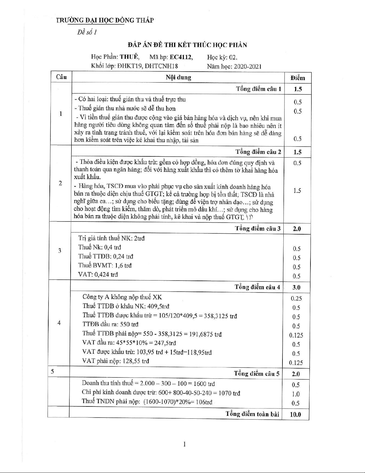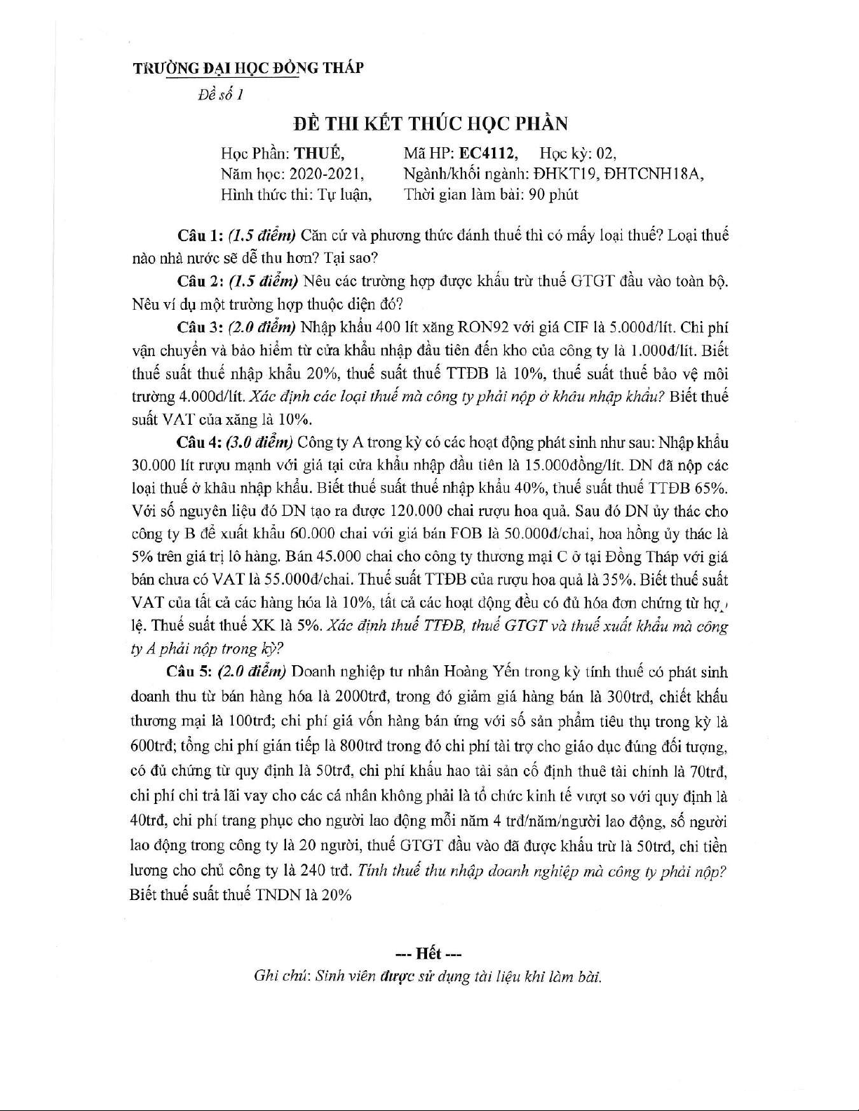 Đề thi kết thúc học phần học kì 2 môn Thuế năm 2020-2021 có đáp án - Trường ĐH Đồng Tháp