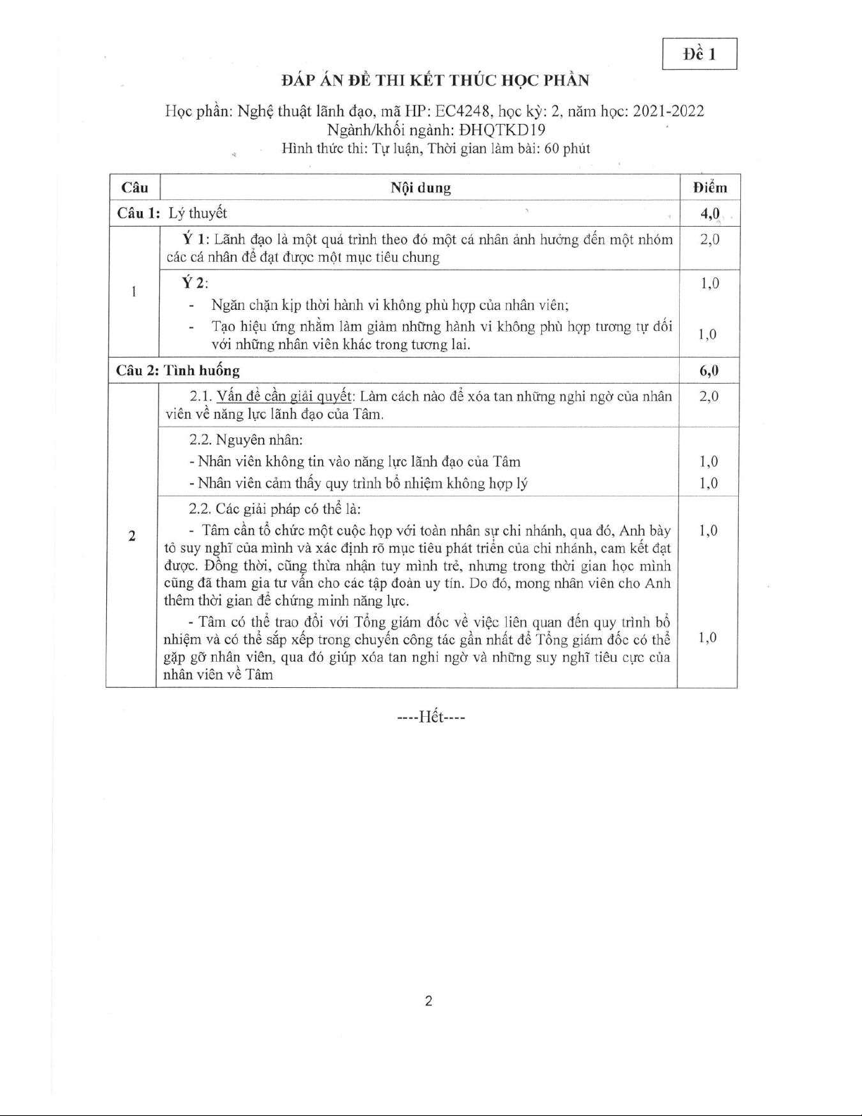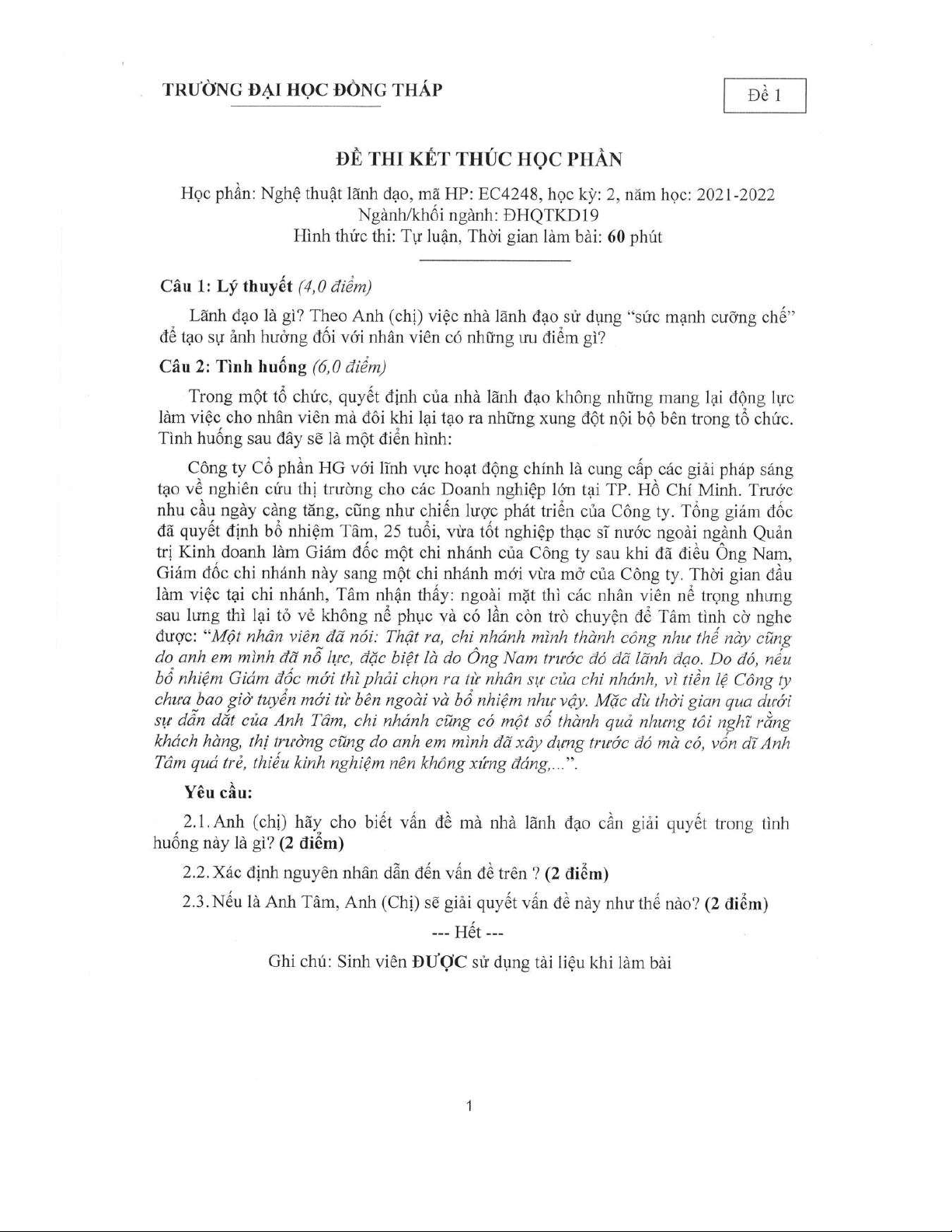 Đề thi kết thúc học phần học kì 2 môn Nghệ thuật lãnh đạo năm 2021-2022 có đáp án - Trường ĐH Đồng Tháp