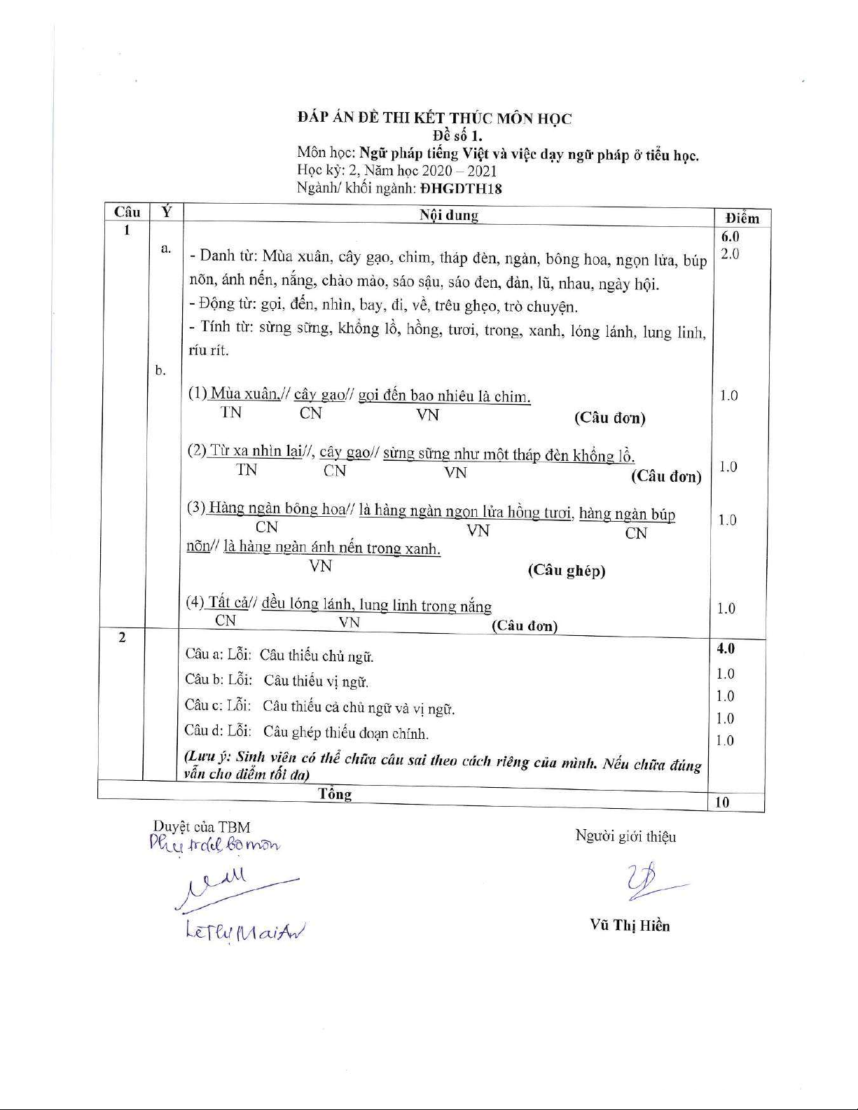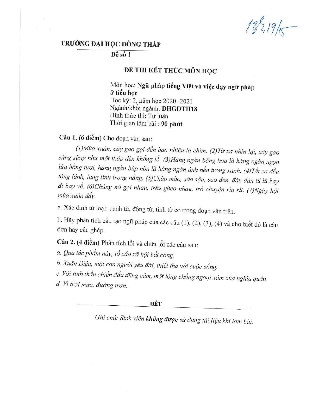 Đề thi kết thúc học phần học kì 2 môn và việc dạy ngữ pháp ở tiểu học năm 2020-2021 có đáp án - Trường ĐH Đồng Tháp