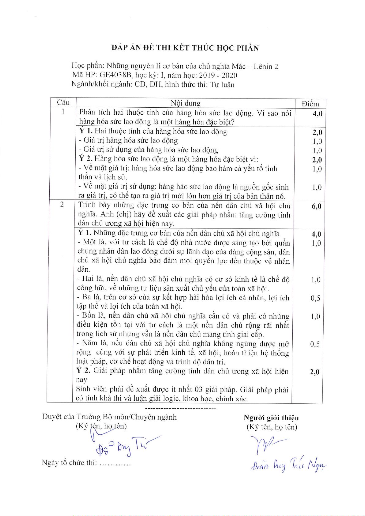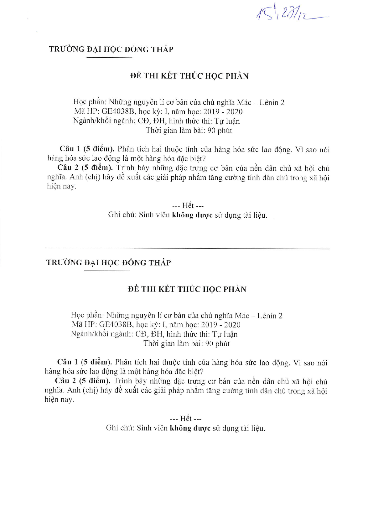 Đề thi kết thúc học phần học kì 1 môn Những nguyên lí cơ bản của chủ nghĩa Mác - LêNin 2 năm 2019-2020 có đáp án - Trường ĐH Đồng Tháp