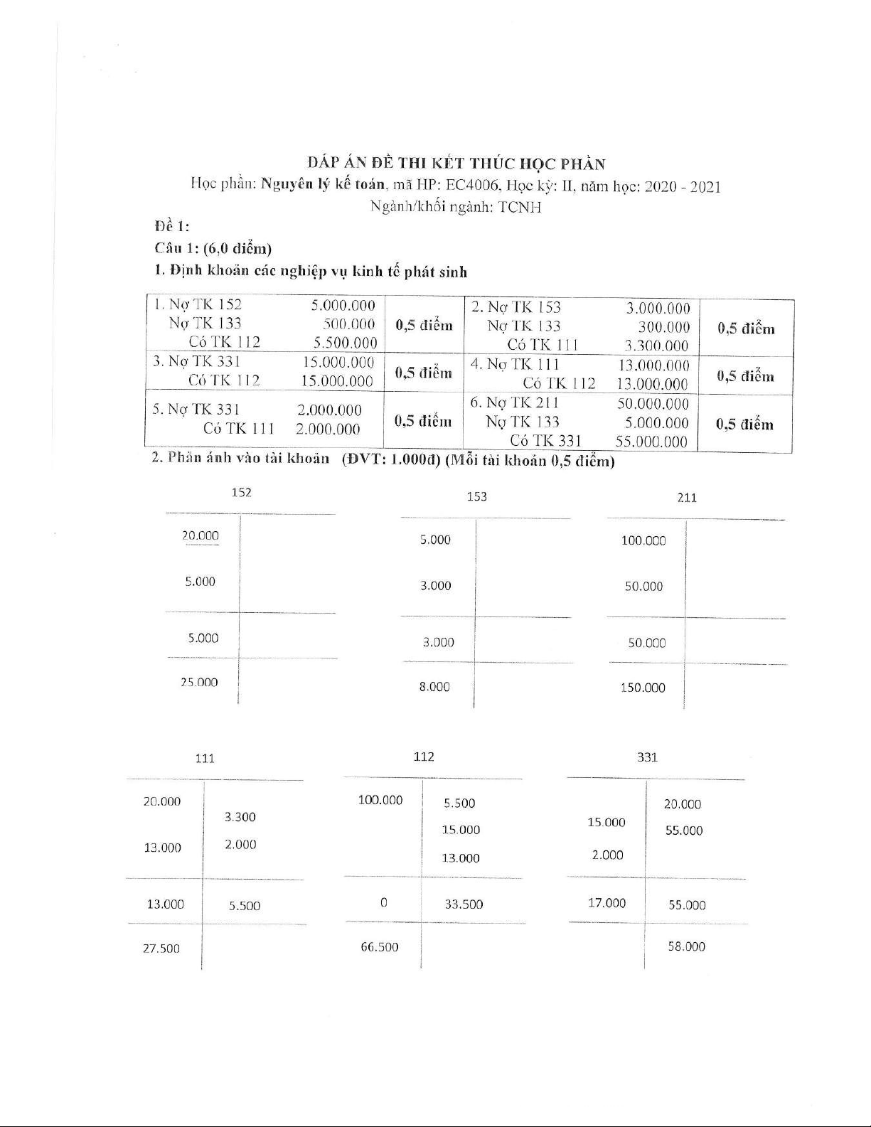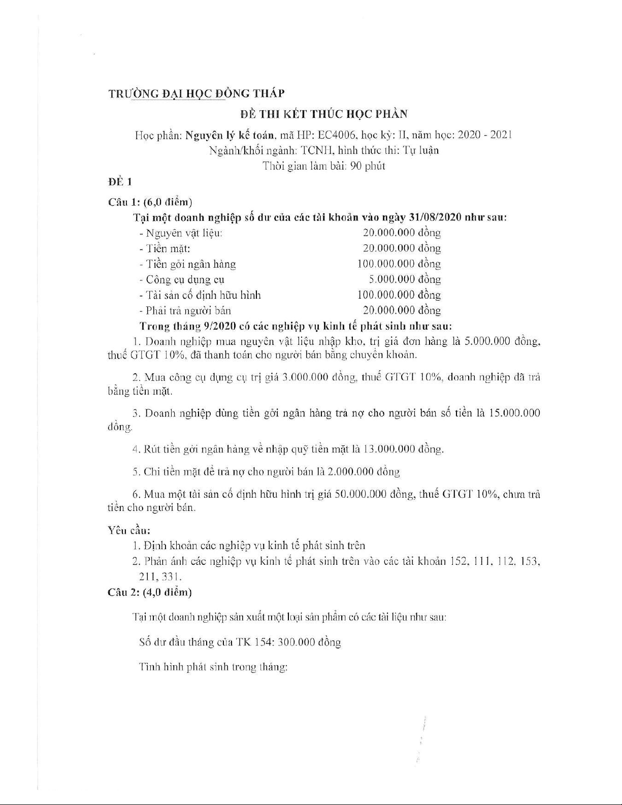 Đề thi kết thúc học phần học kì 2 môn Nguyên lý kế toán năm 2020-2021 có đáp án - Trường ĐH Đồng Tháp