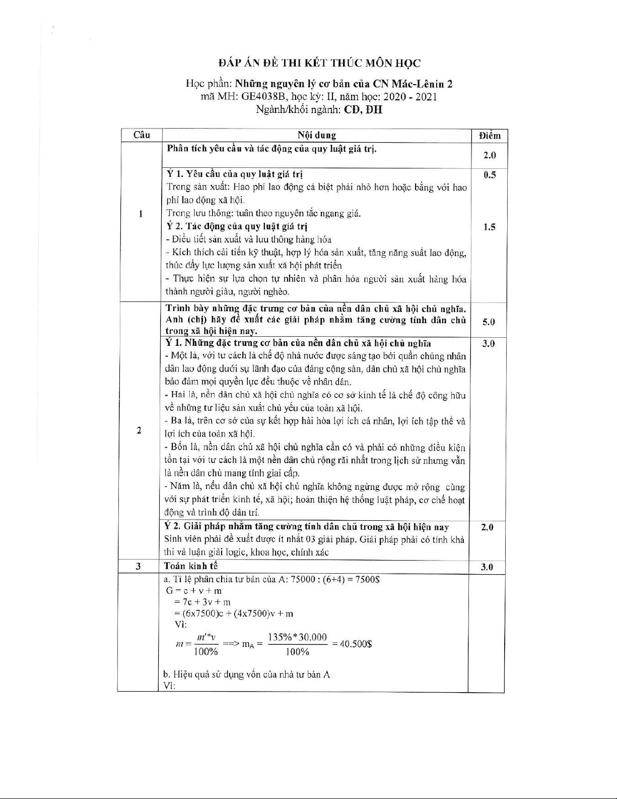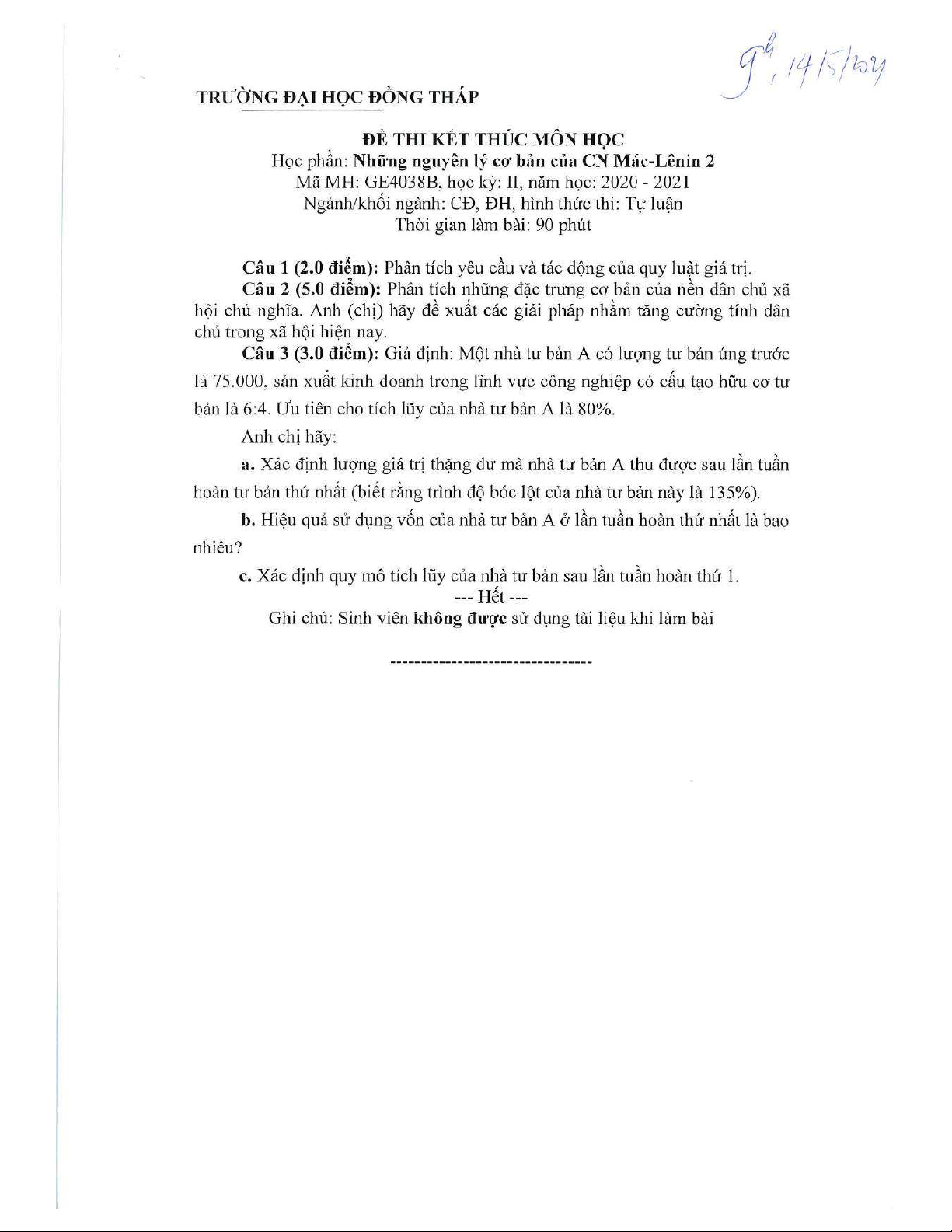 Đề thi kết thúc học phần học kì 2 môn Những nguyên lý cơ bản của chủ nghĩa Mác- LêNin 2 năm 2020-2021 có đáp án - Trường ĐH Đồng Tháp