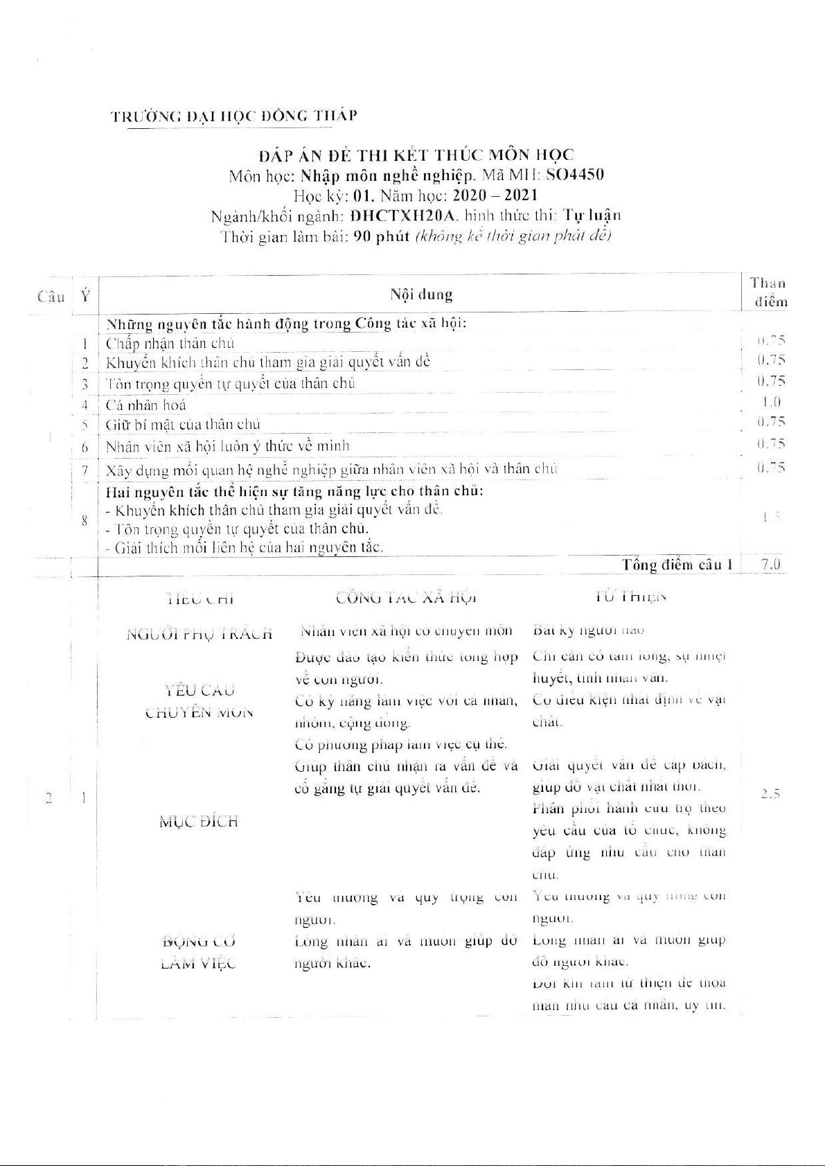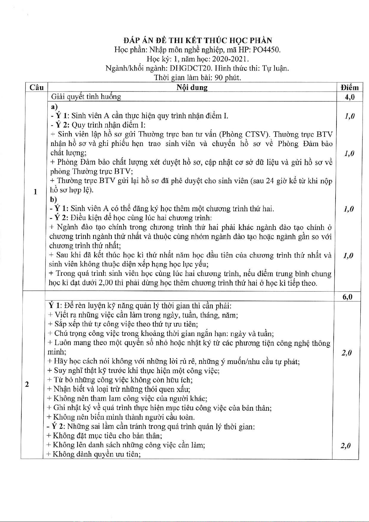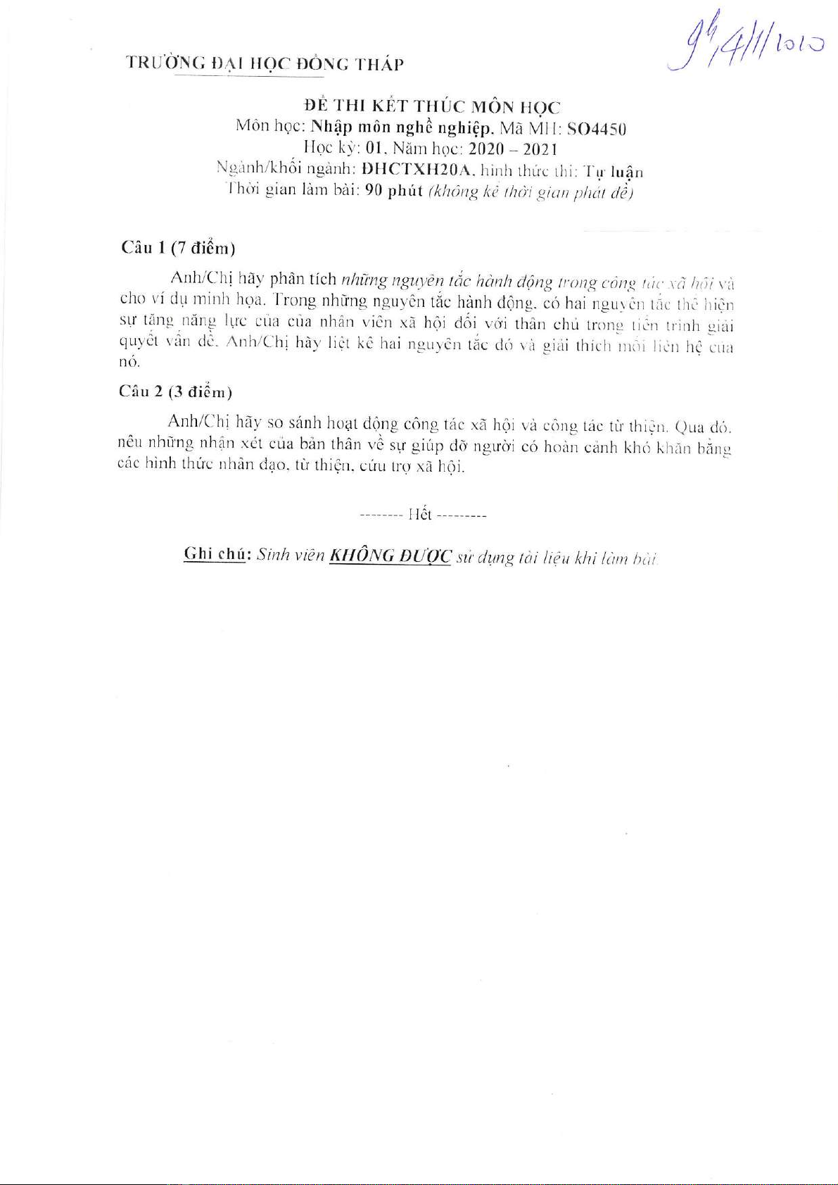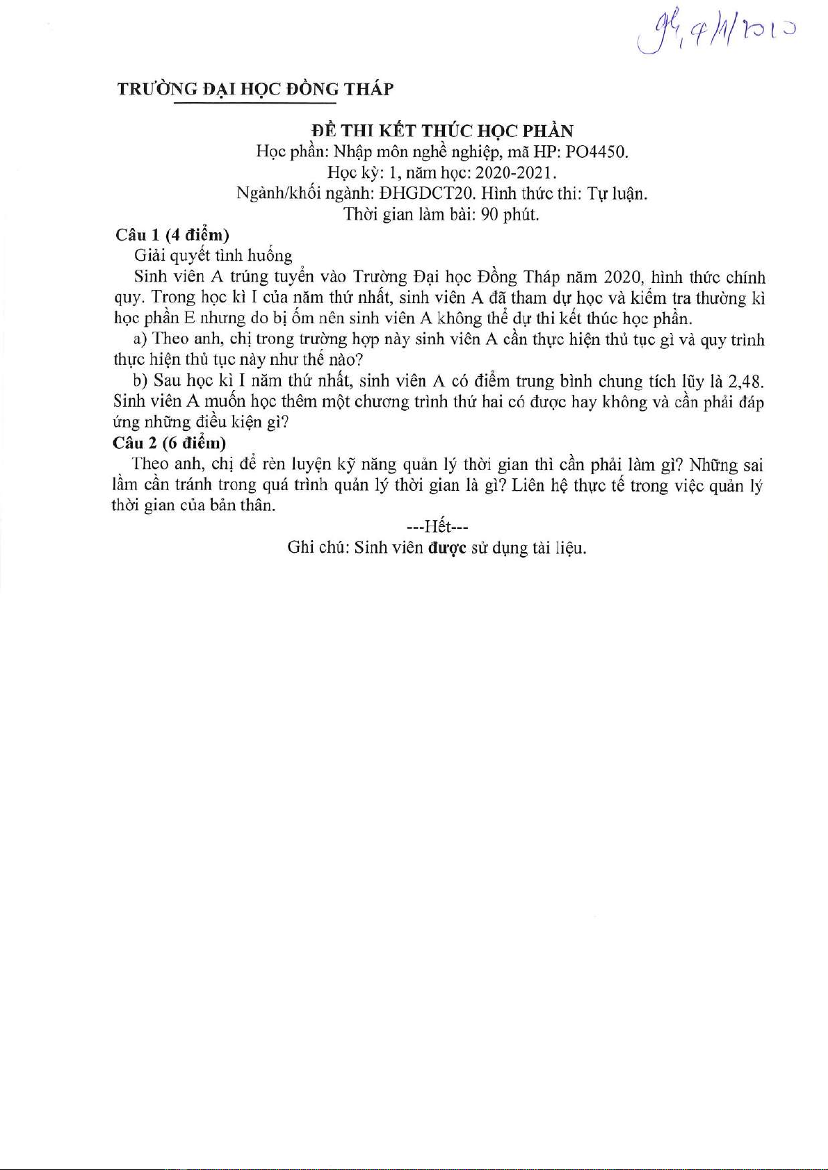 Đề thi kết thúc học phần học kì 1 môn Nhập môn nghề nghiệp 2 năm 2020-2021 có đáp án - Trường ĐH Đồng Tháp