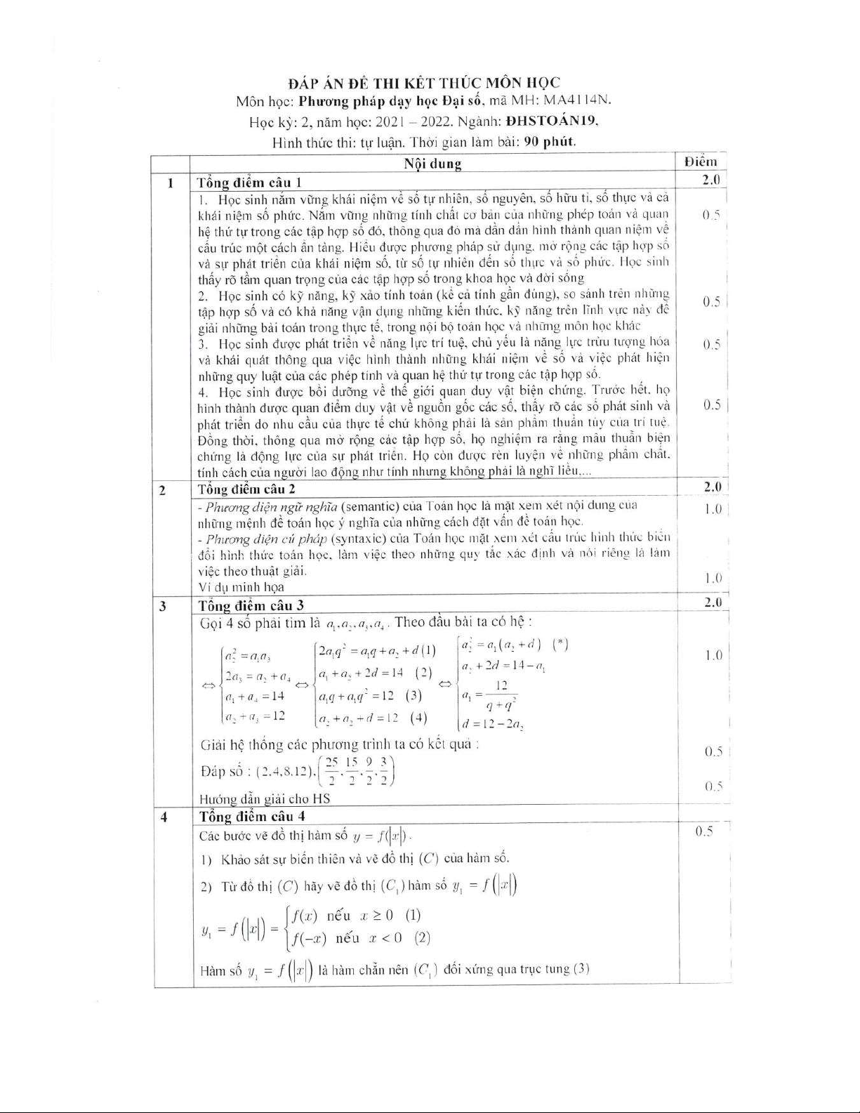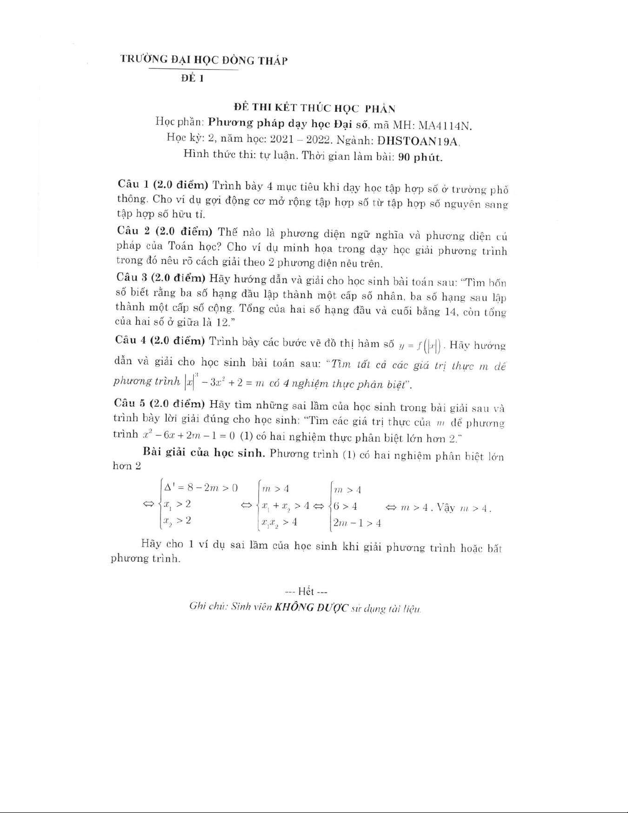 Đề thi kết thúc học phần học kì 2 môn Phương pháp dạy học đại số năm 2021-2022 có đáp án - Trường ĐH Đồng Tháp