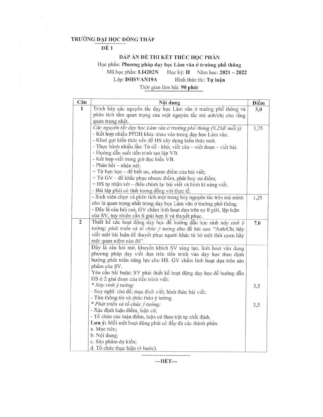 Đề thi kết thúc học phần học kì 2 môn Phương pháp dạy học làm văn ở trường phổ thông năm 2021-2022 có đáp án - Trường ĐH Đồng Tháp