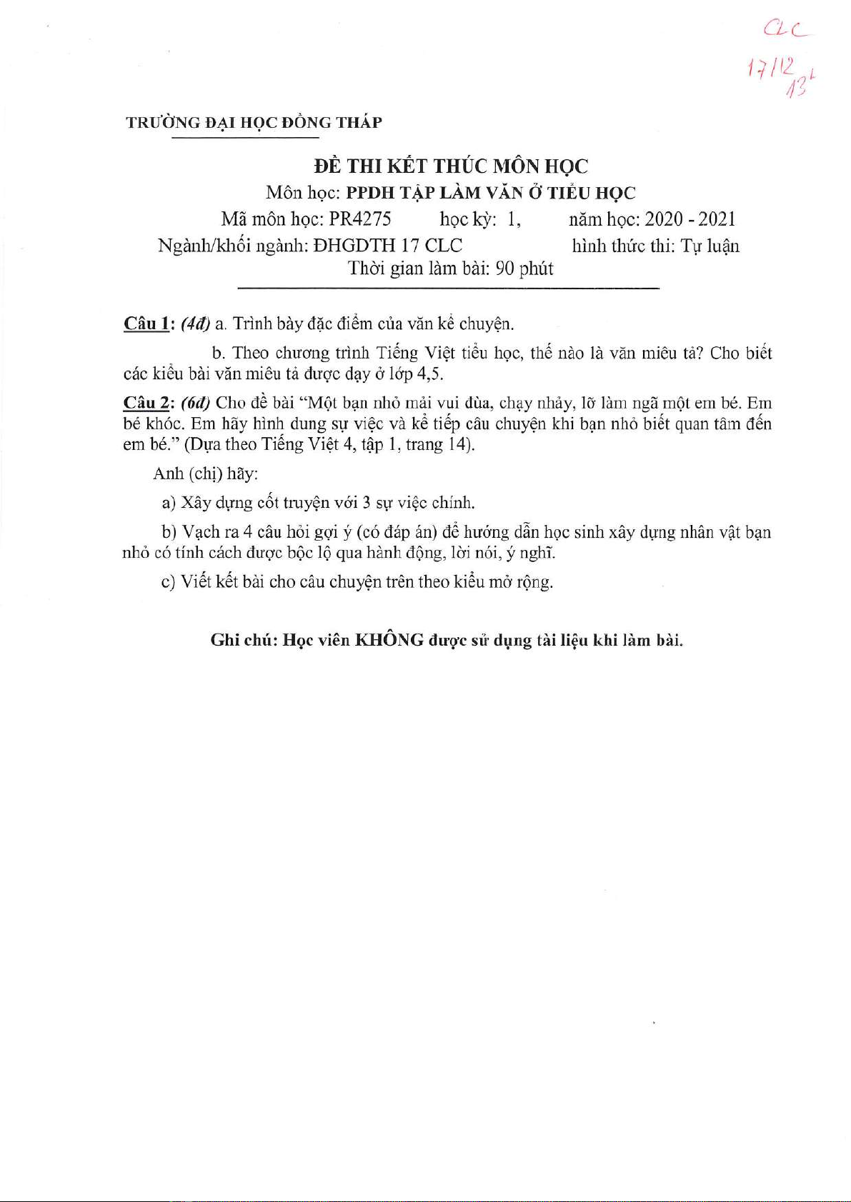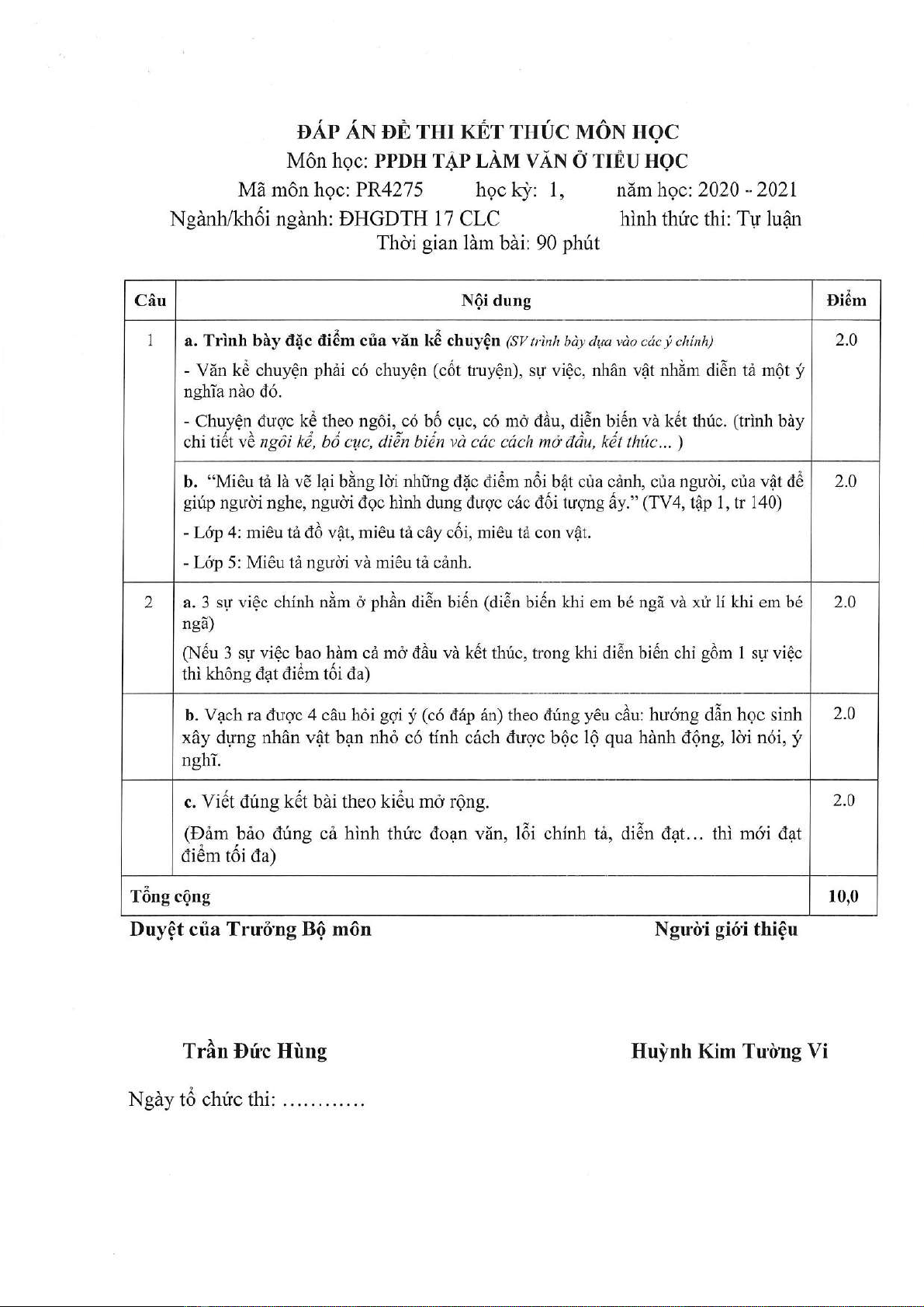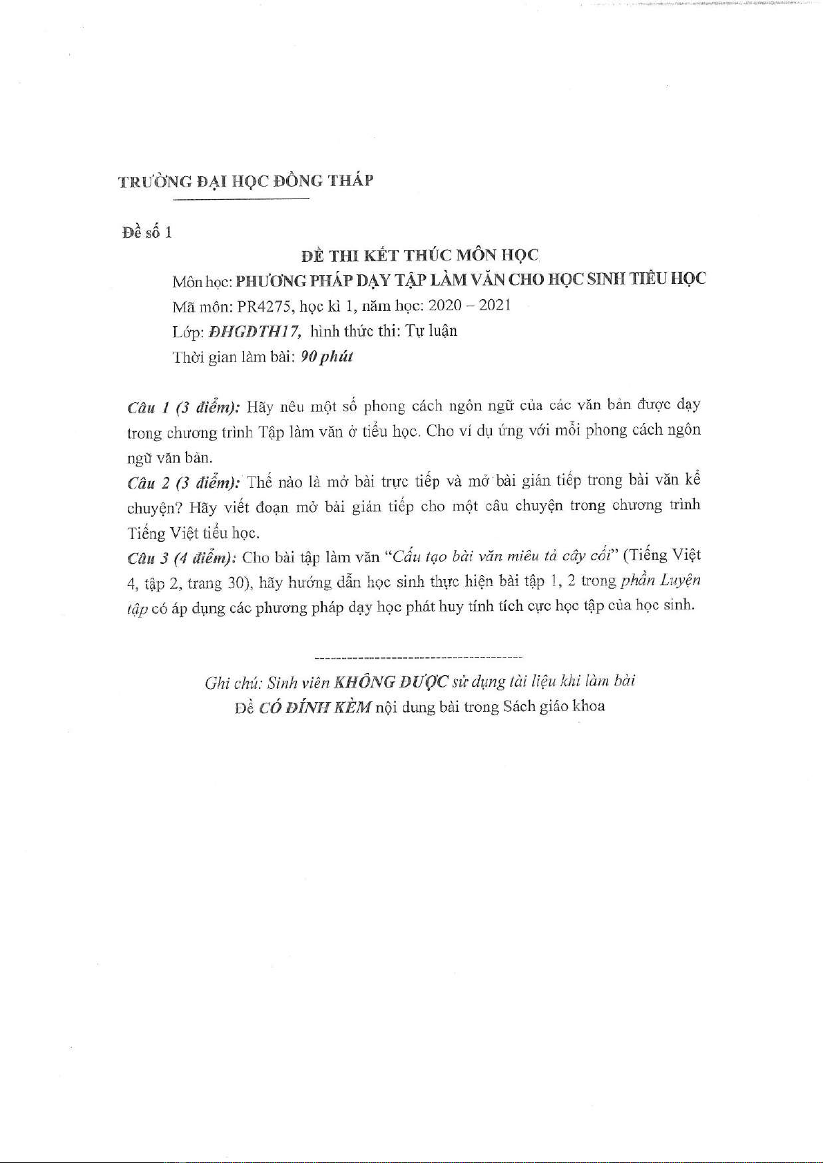 Đề thi kết thúc học phần học kì 1 môn Phương pháp dạy học Tập làm văn ở Tiểu học năm 2020-2021 có đáp án - Trường ĐH Đồng Tháp