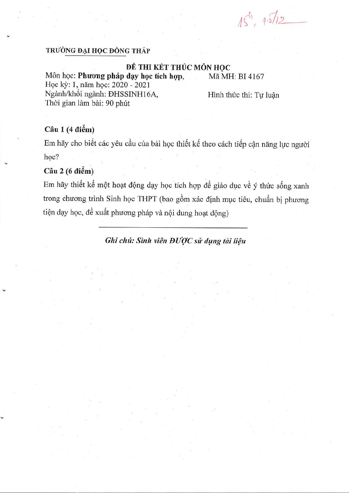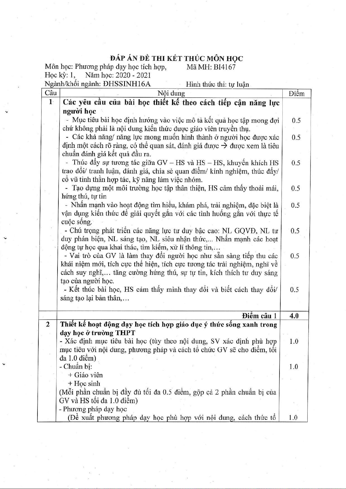 Đề thi kết thúc học phần học kì 1 môn Phương pháp dạy học tích hợp năm 2020-2021 có đáp án - Trường ĐH Đồng Tháp