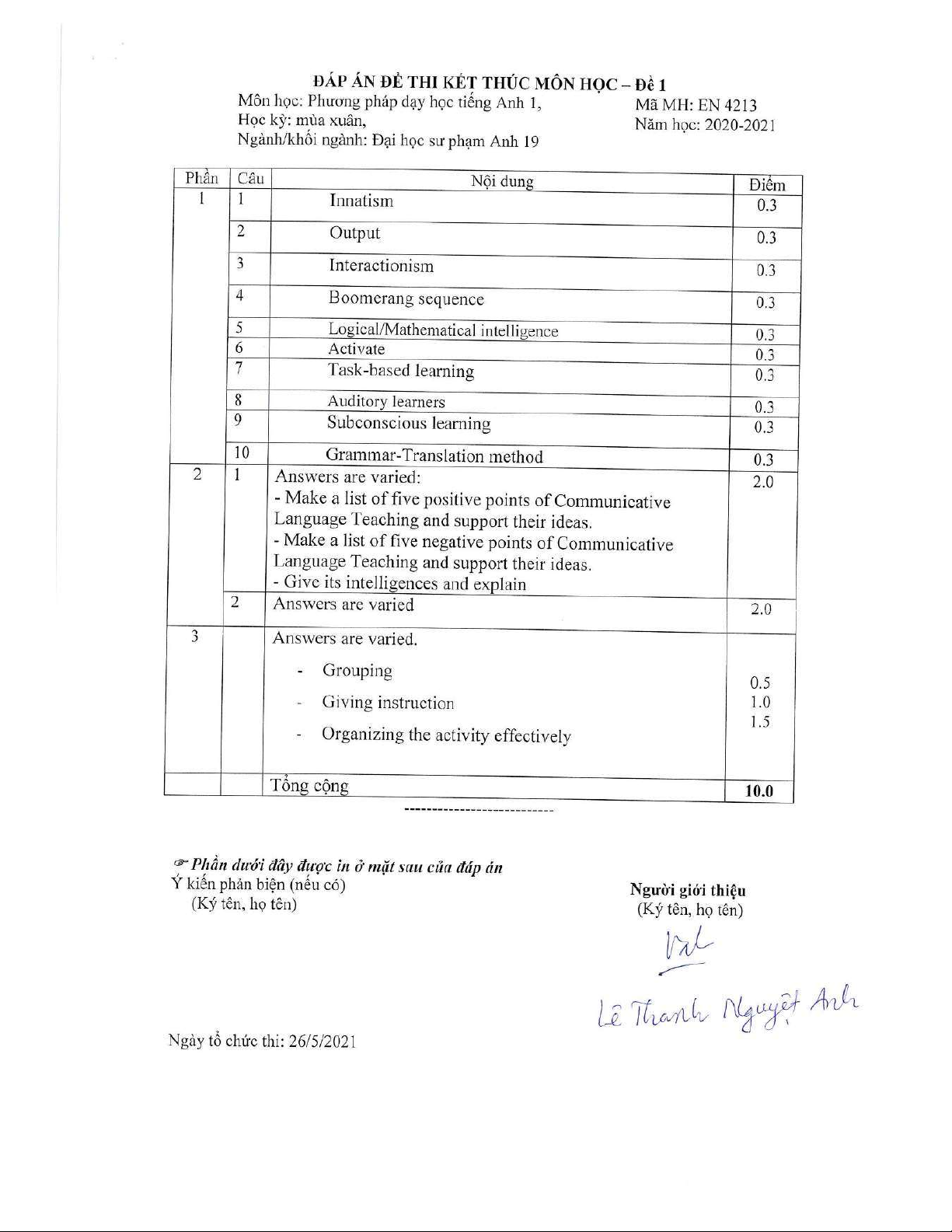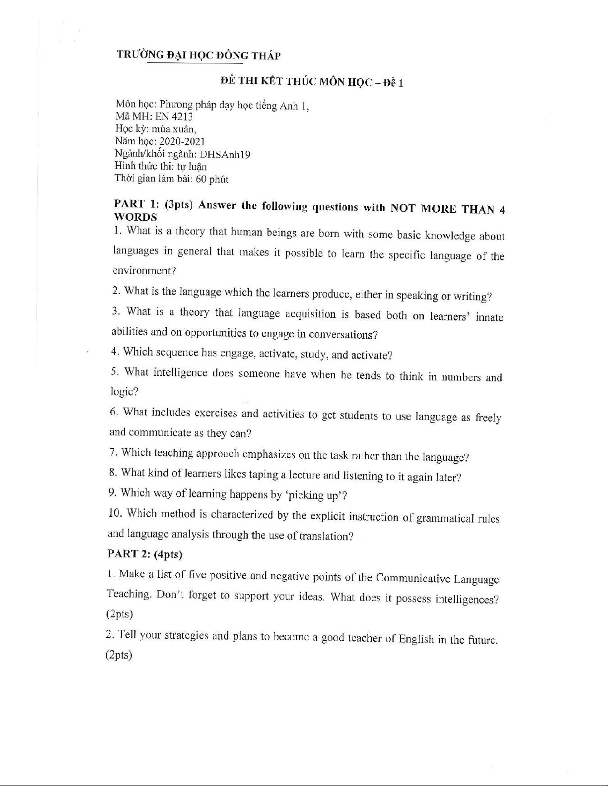 Đề thi kết thúc học phần học kì 2 môn Phương pháp dạy học Tiếng Anh 1 năm 2020-2021 có đáp án - Trường ĐH Đồng Tháp
