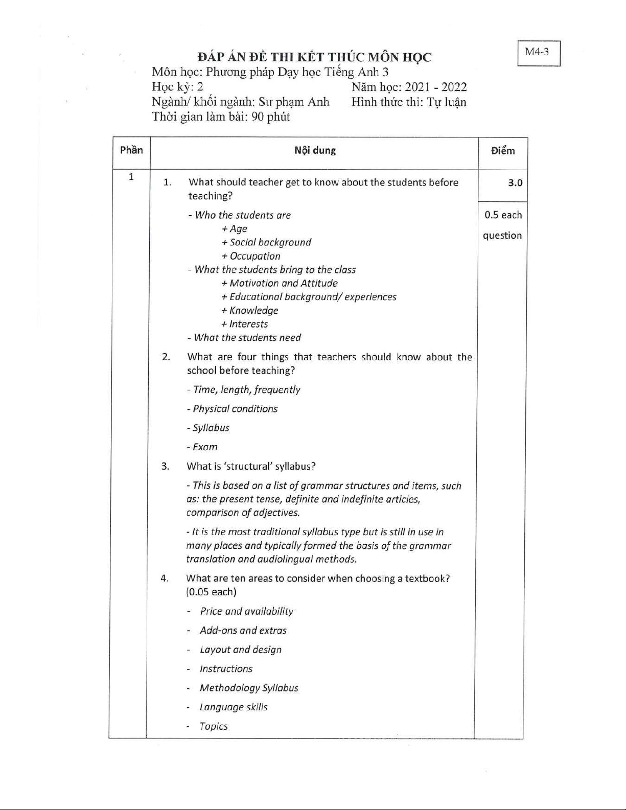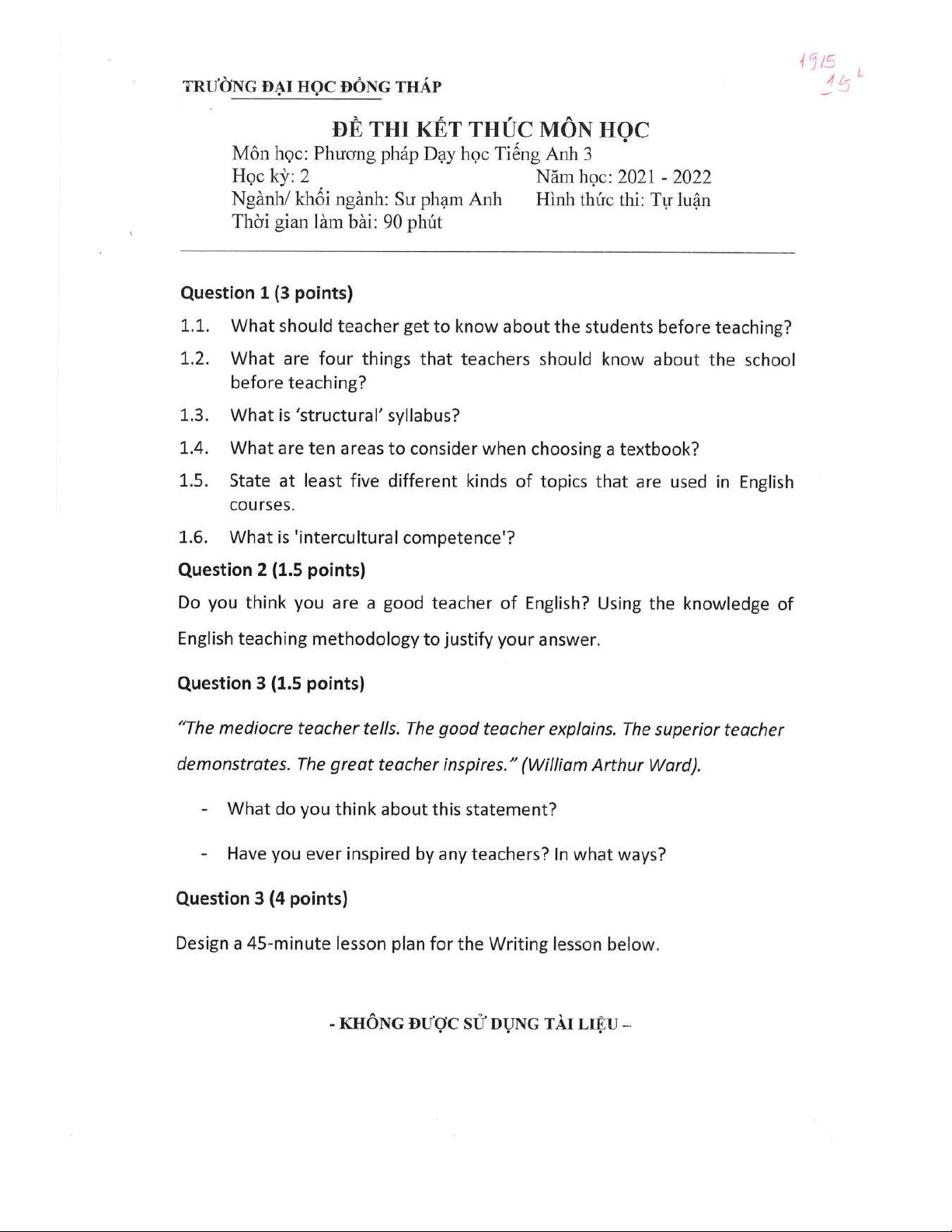 Đề thi kết thúc học phần học kì 2 môn Phương pháp dạy học Tiếng Anh 3 năm 2021-2022 có đáp án - Trường ĐH Đồng Tháp