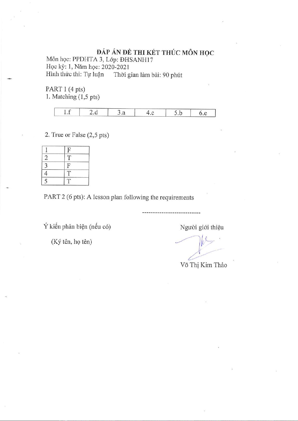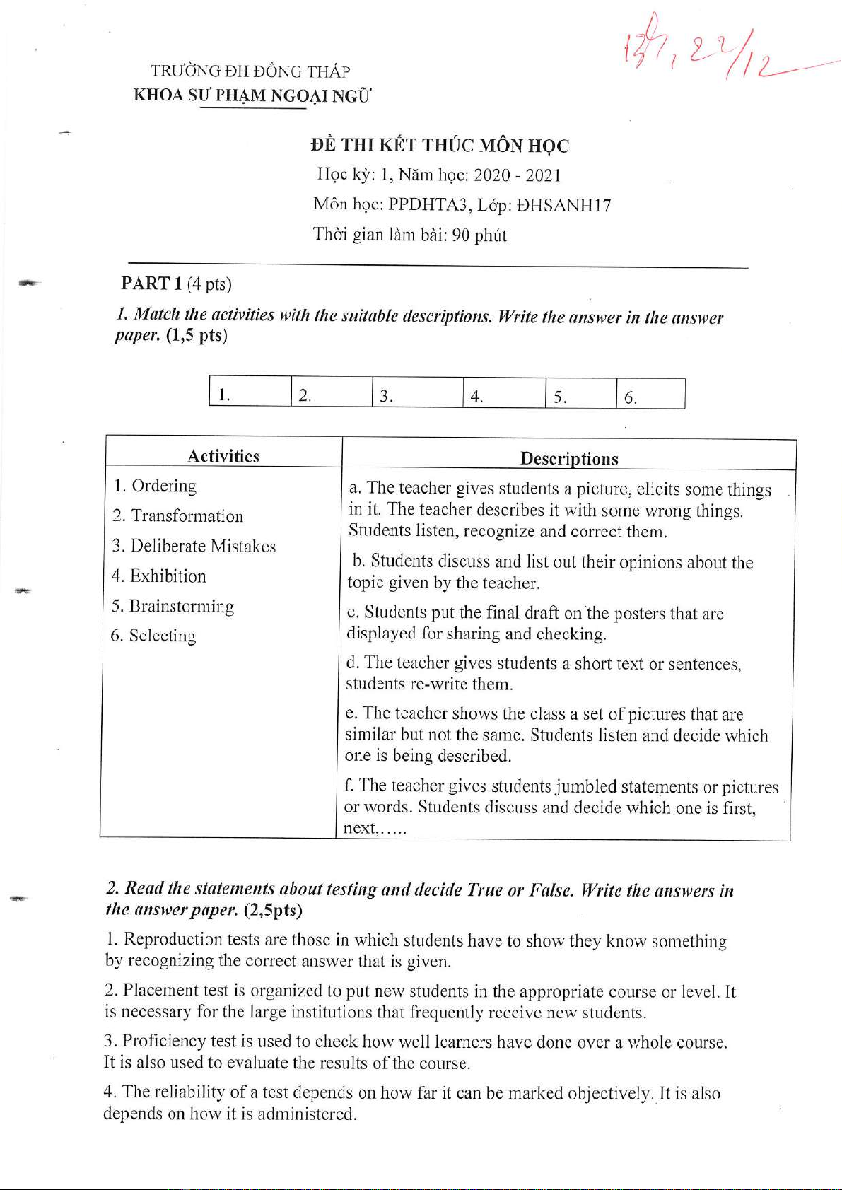 Đề thi kết thúc học phần học kì 1 môn Phương pháp dạy học Tiếng Anh 3 năm 2020-2021 có đáp án - Trường ĐH Đồng Tháp