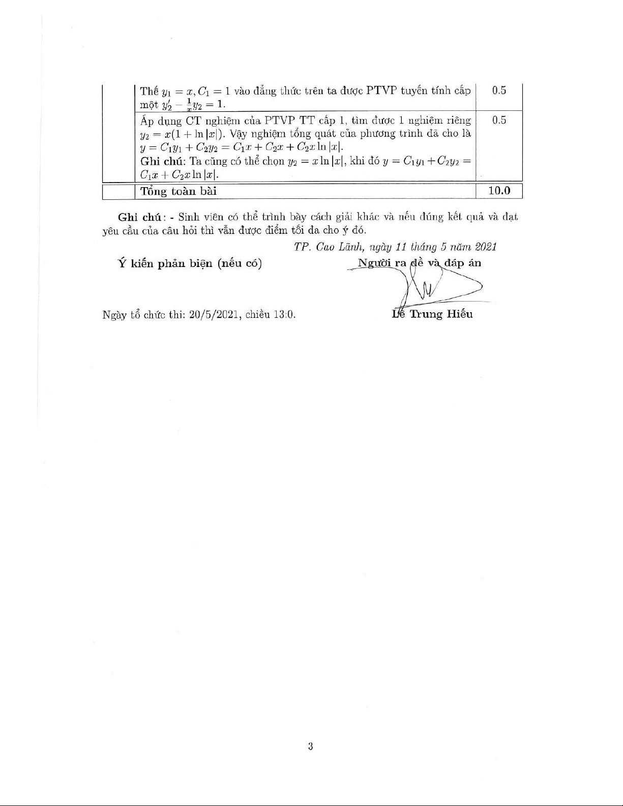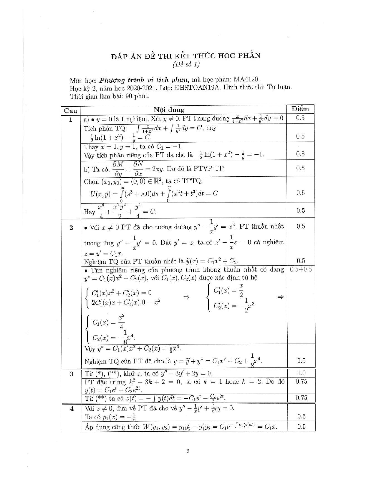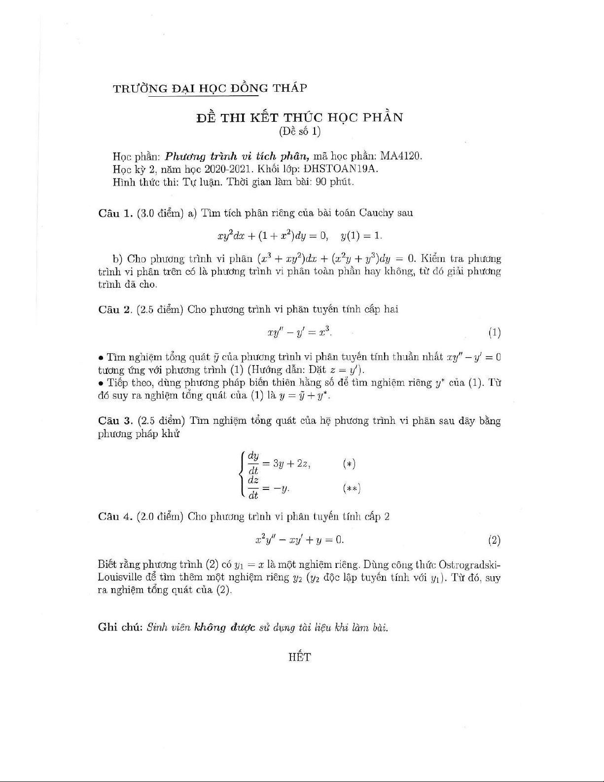 Đề thi kết thúc học phần học kì 2 môn Phương trình vi tích phân năm 2020-2021 có đáp án - Trường ĐH Đồng Tháp