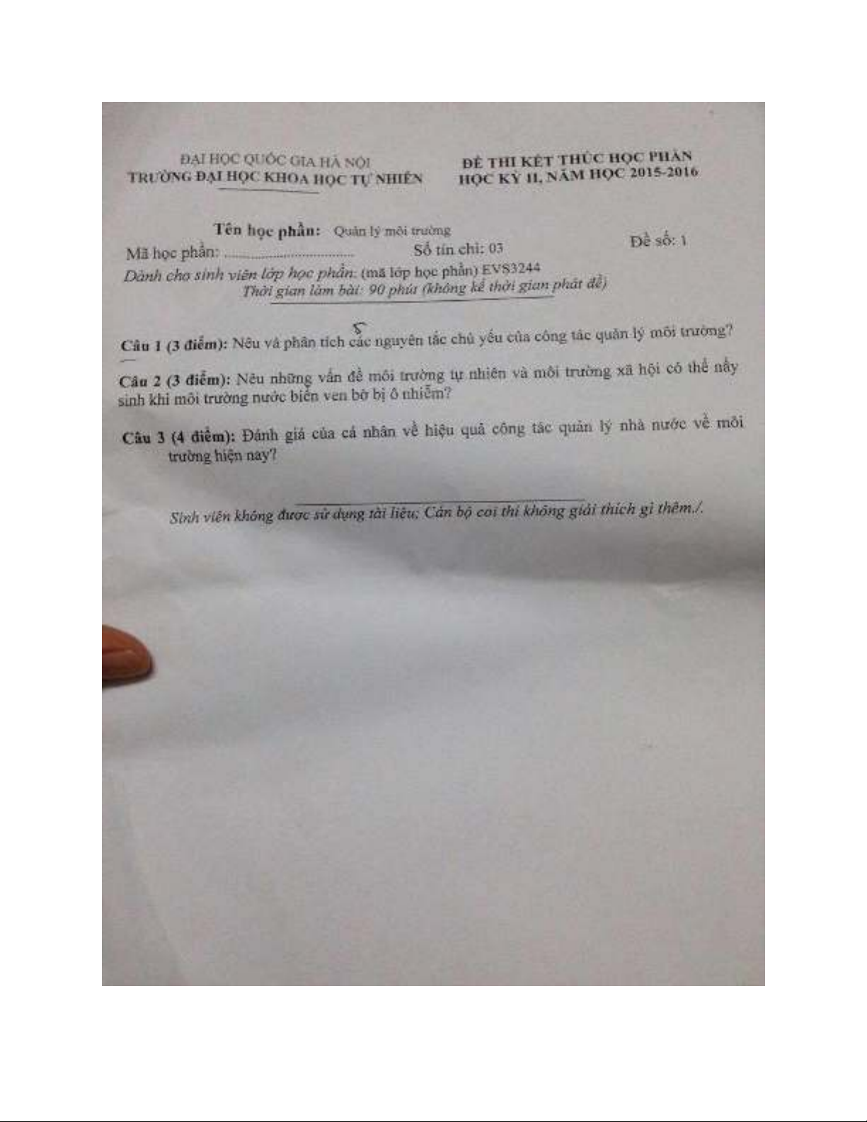 Đề thi kết thúc học phần học kỳ II năm học 2015-2016 môn Quản lý môi trường (Đề số 1) - ĐH Khoa học Tự nhiên