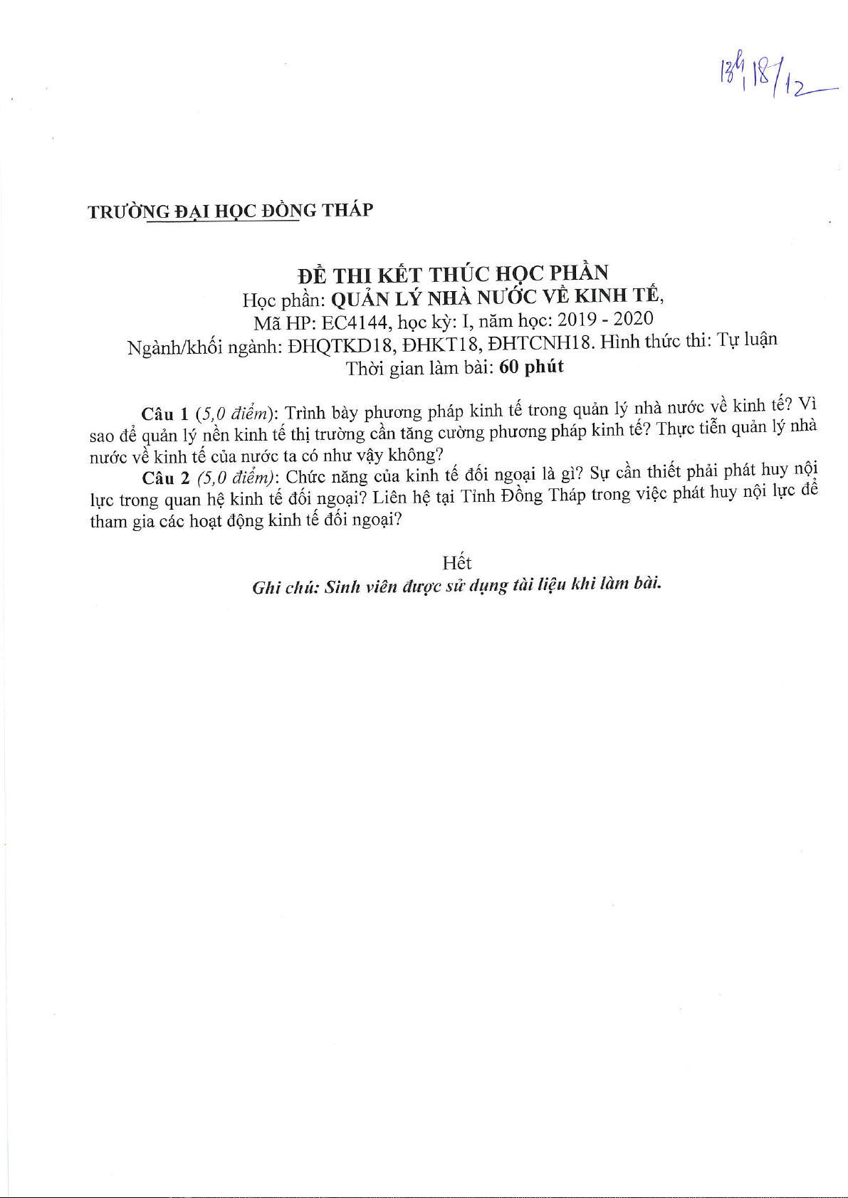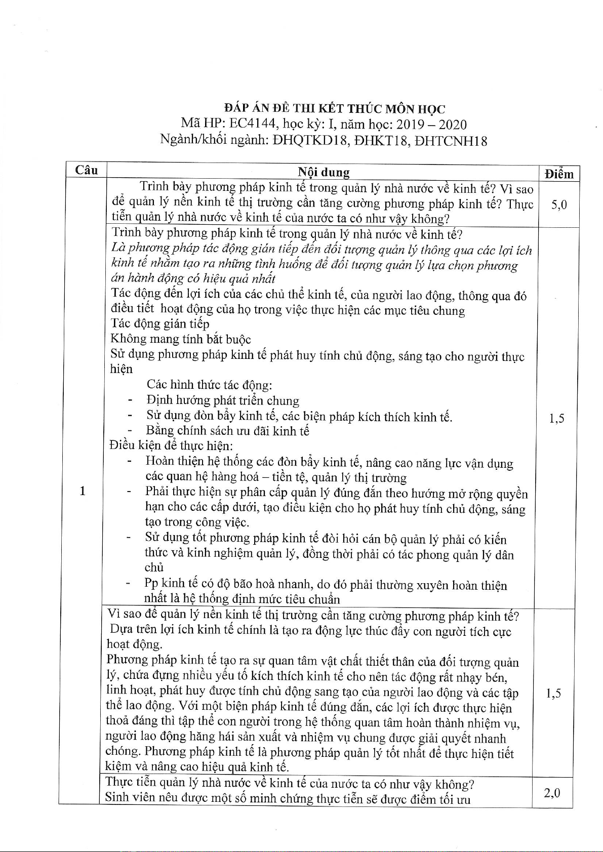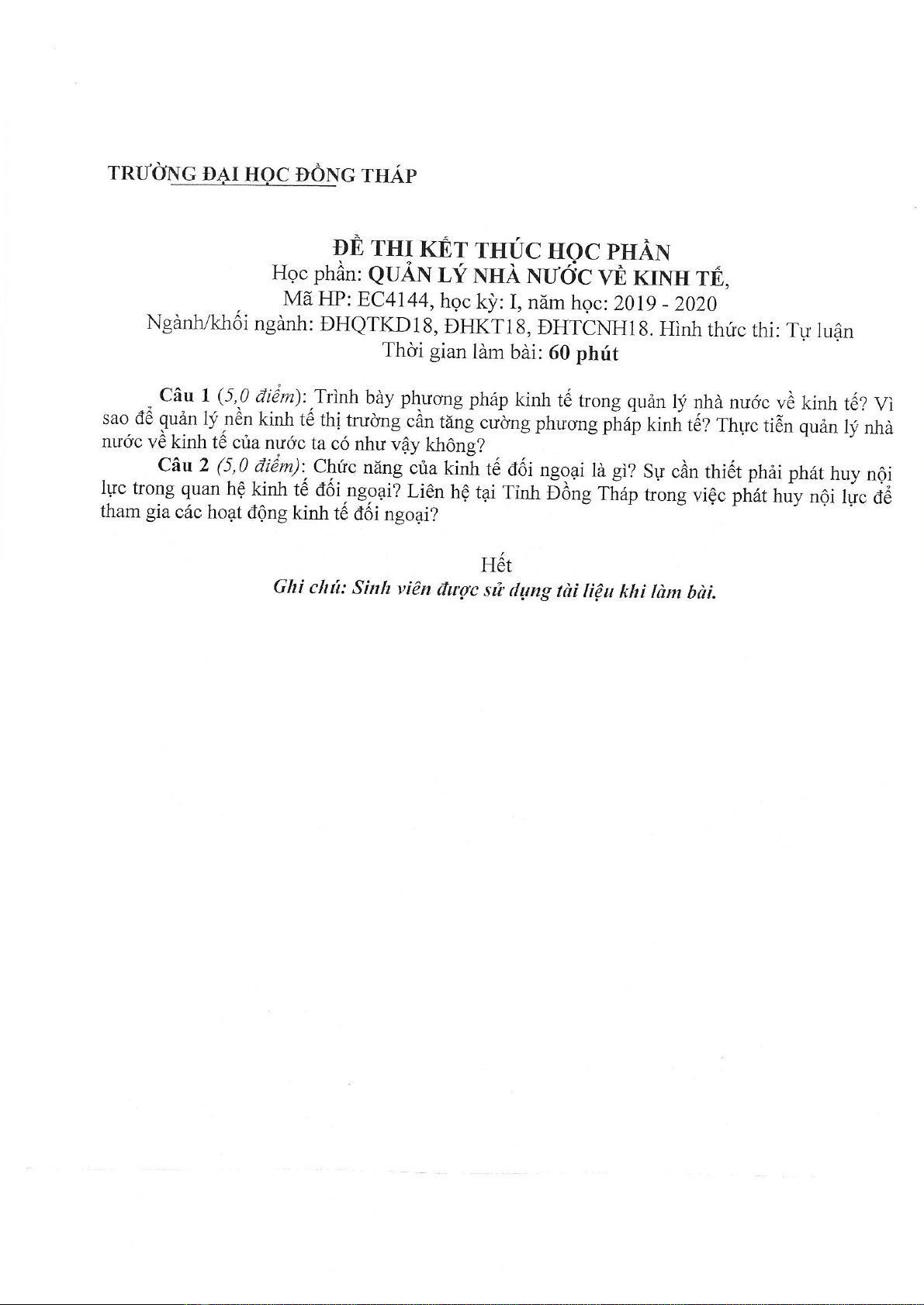 Đề thi kết thúc học phần học kì 1 môn Quản lý nhà nước về kinh tế năm 2019-2020 có đáp án - Trường ĐH Đồng Tháp