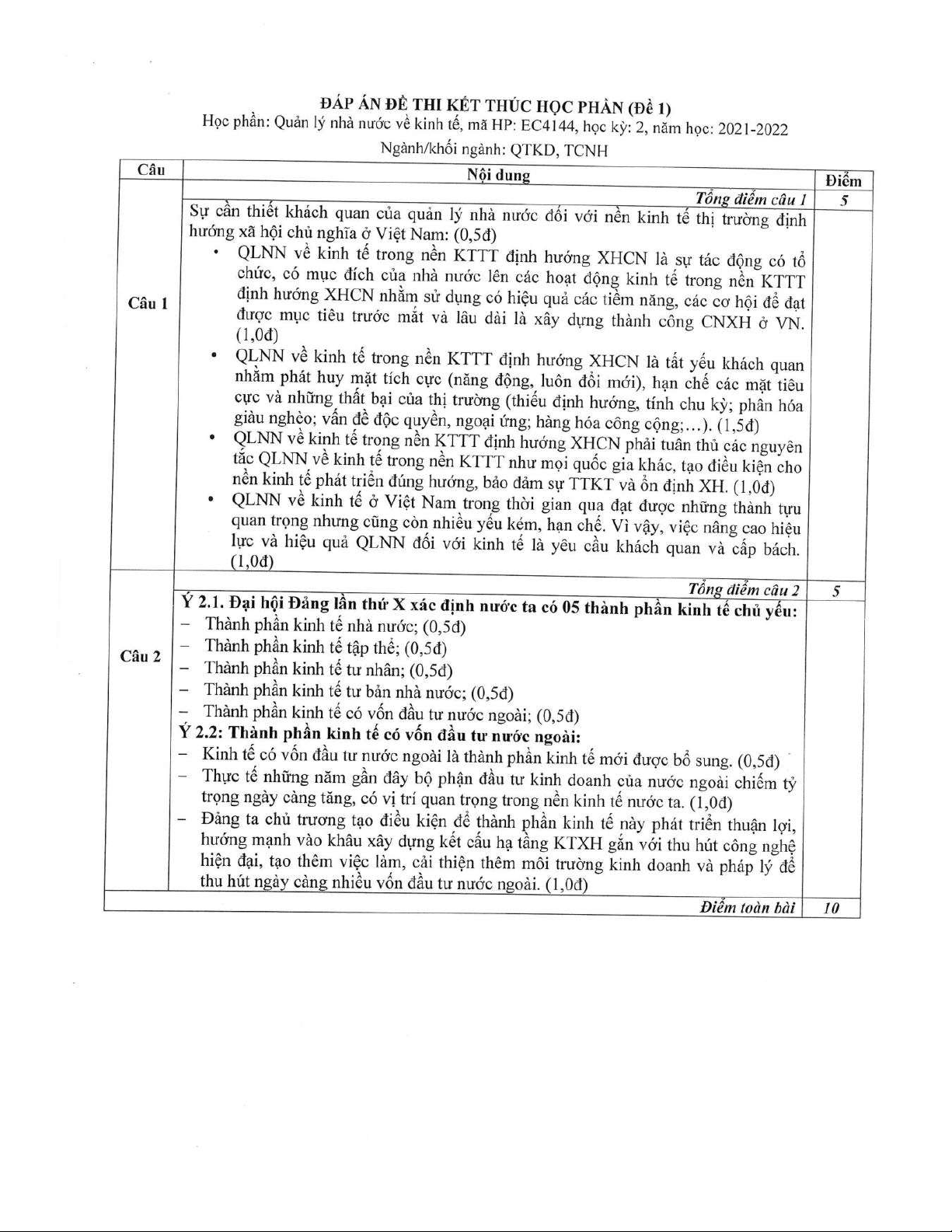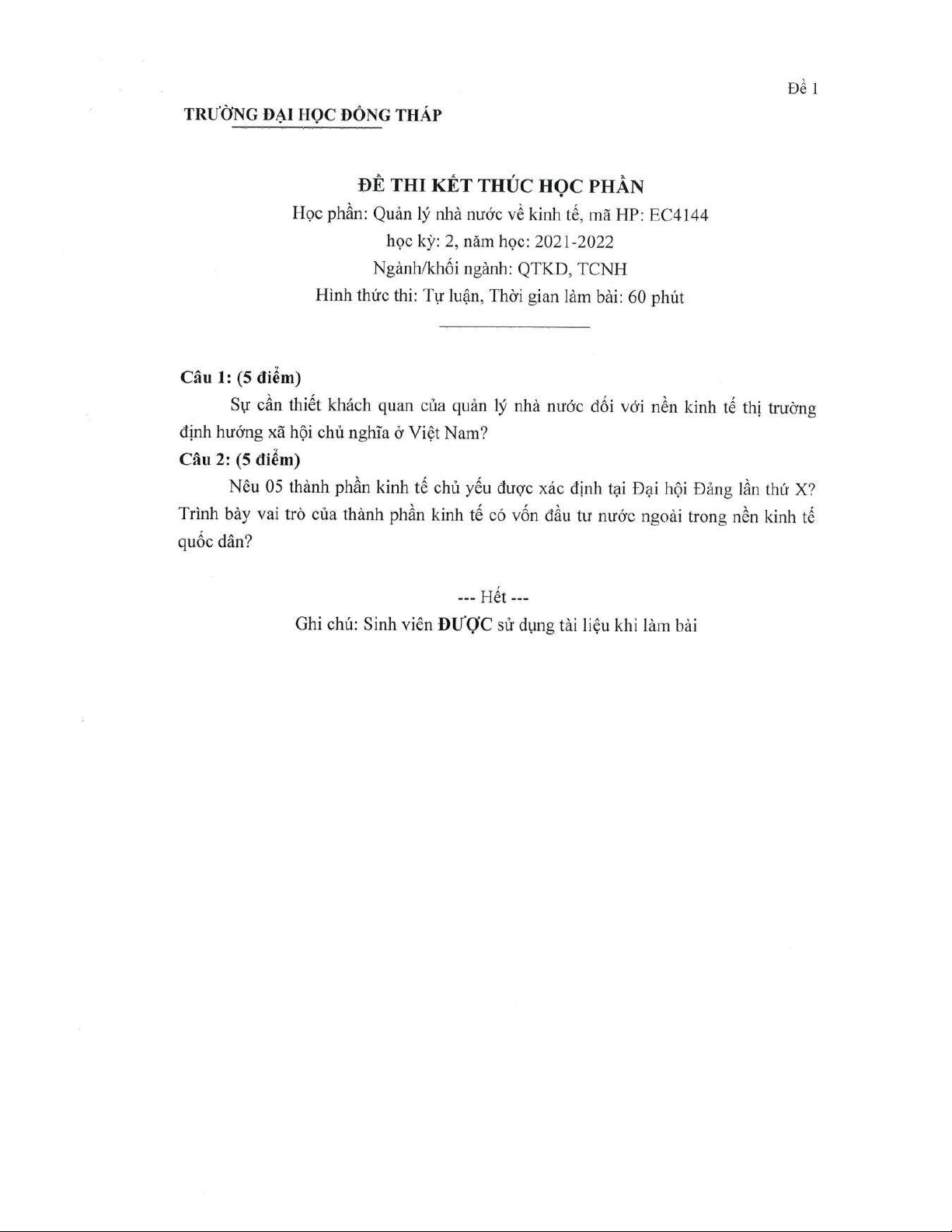 Đề thi kết thúc học phần học kì 2 môn Quản lý nhà nước về kinh tế năm 2021-2022 có đáp án - Trường ĐH Đồng Tháp