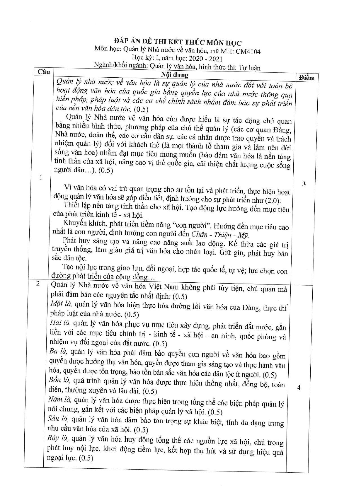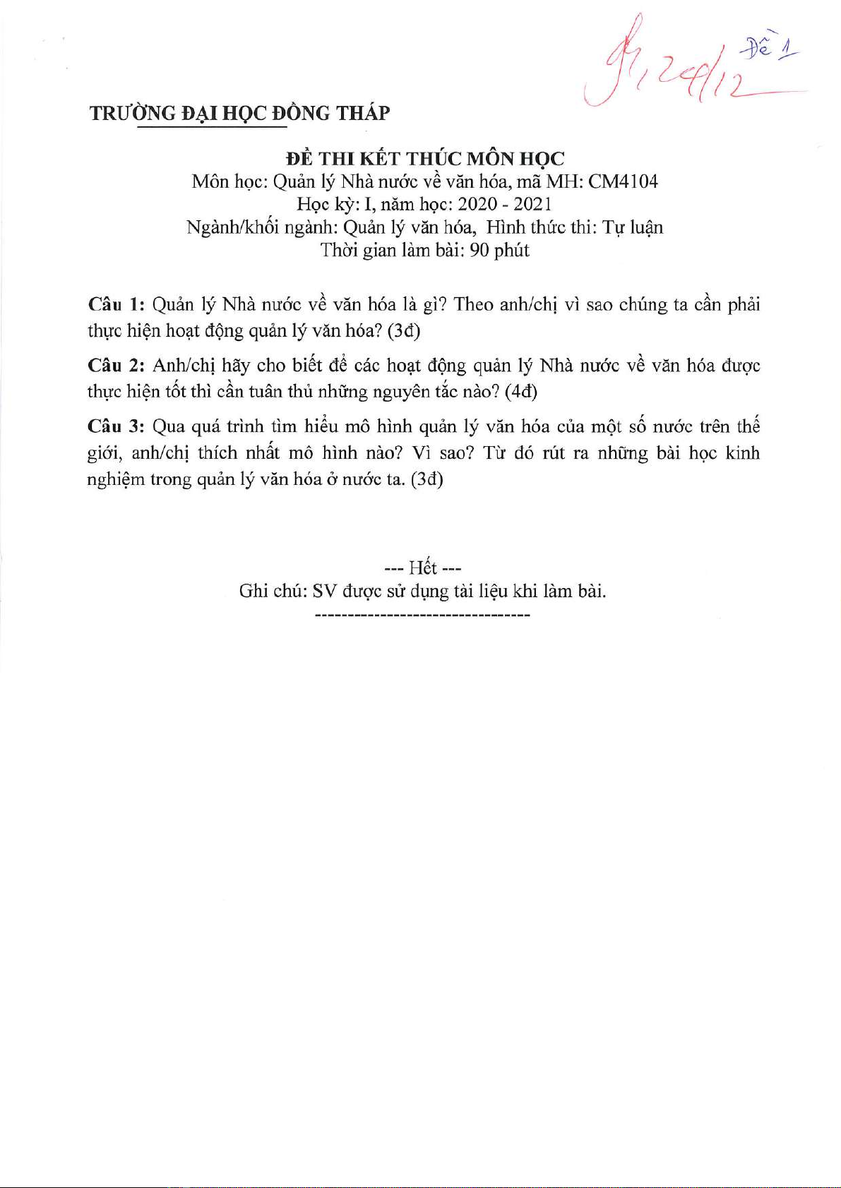 Đề thi kết thúc học phần học kì 1 môn Quản lý nhà nước về văn hóa năm 2020-2021 có đáp án - Trường ĐH Đồng Tháp