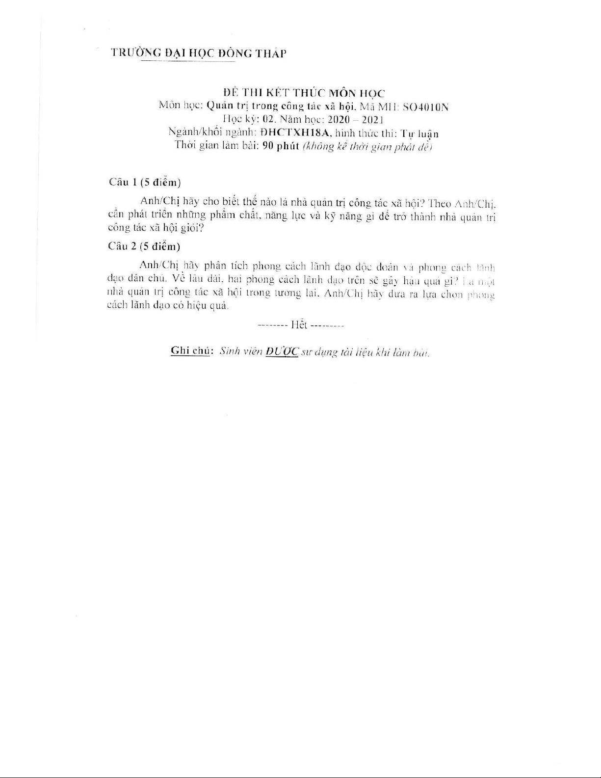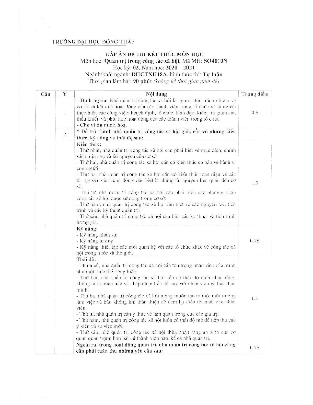 Đề thi kết thúc học phần học kì 2 môn Quản trị trong công tác xã hội năm 2020-2021 có đáp án - Trường ĐH Đồng Tháp