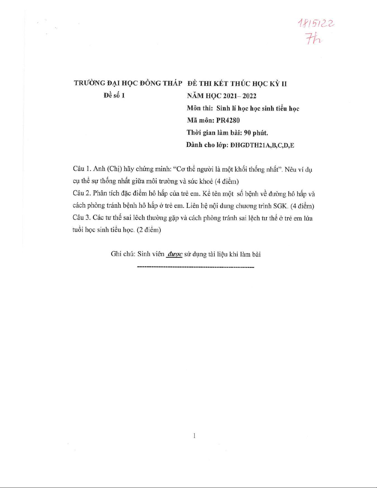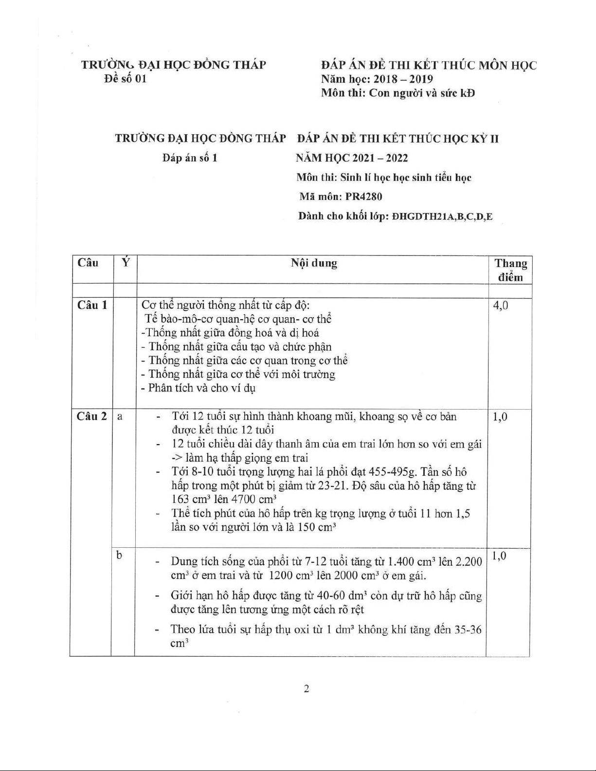Đề thi kết thúc học phần học kì 2 môn Sinh lý học học sinh tiểu học năm 2021-2022 có đáp án - Trường ĐH Đồng Tháp